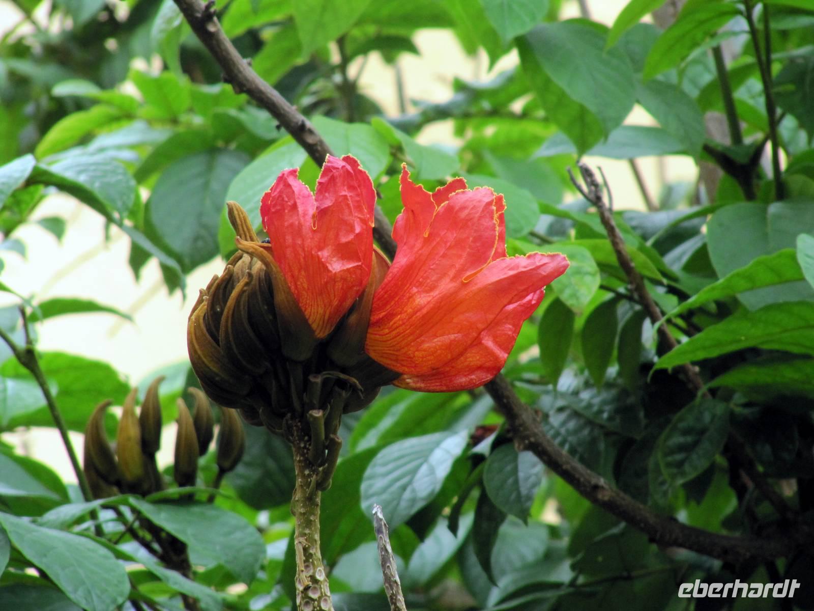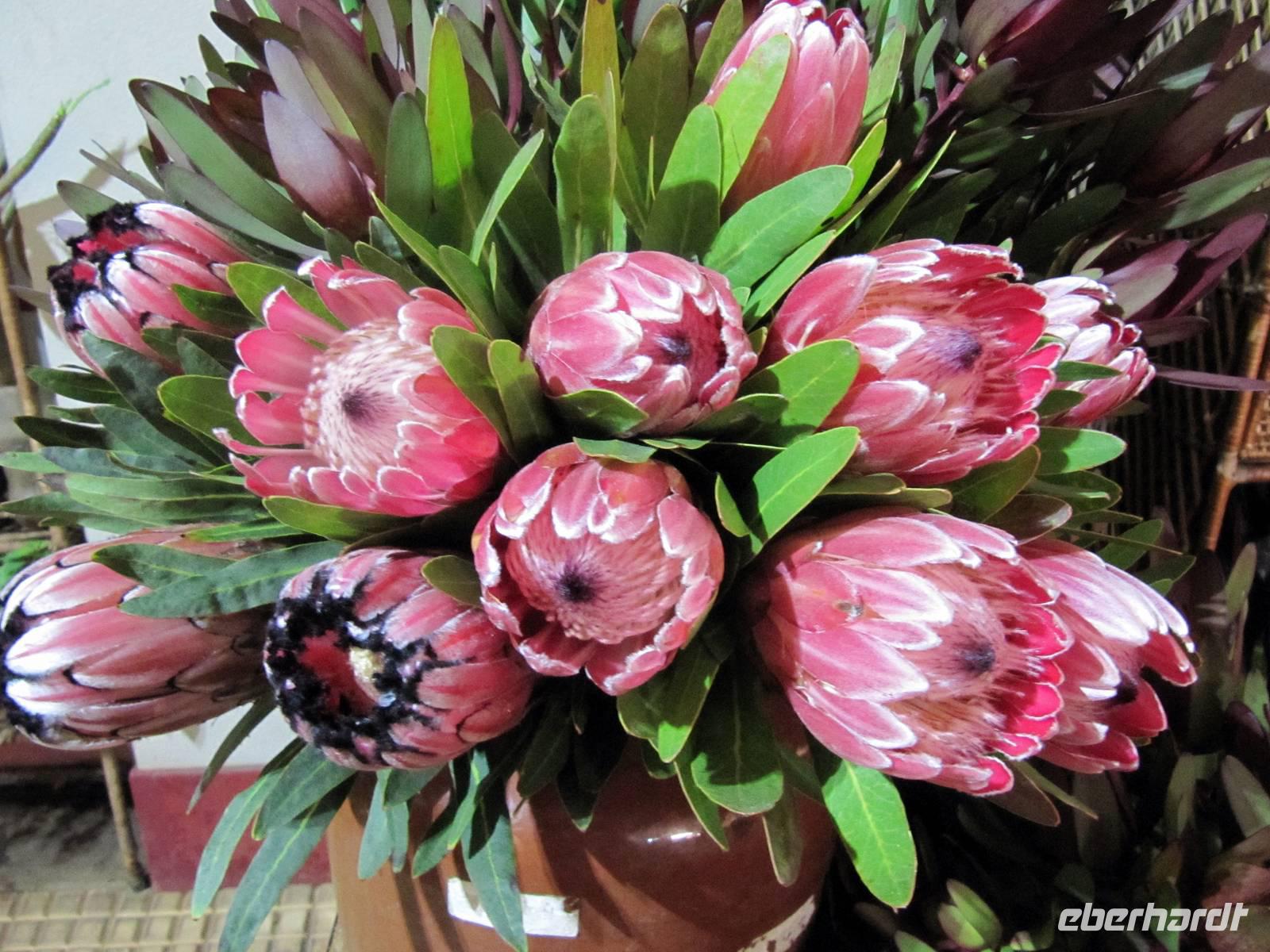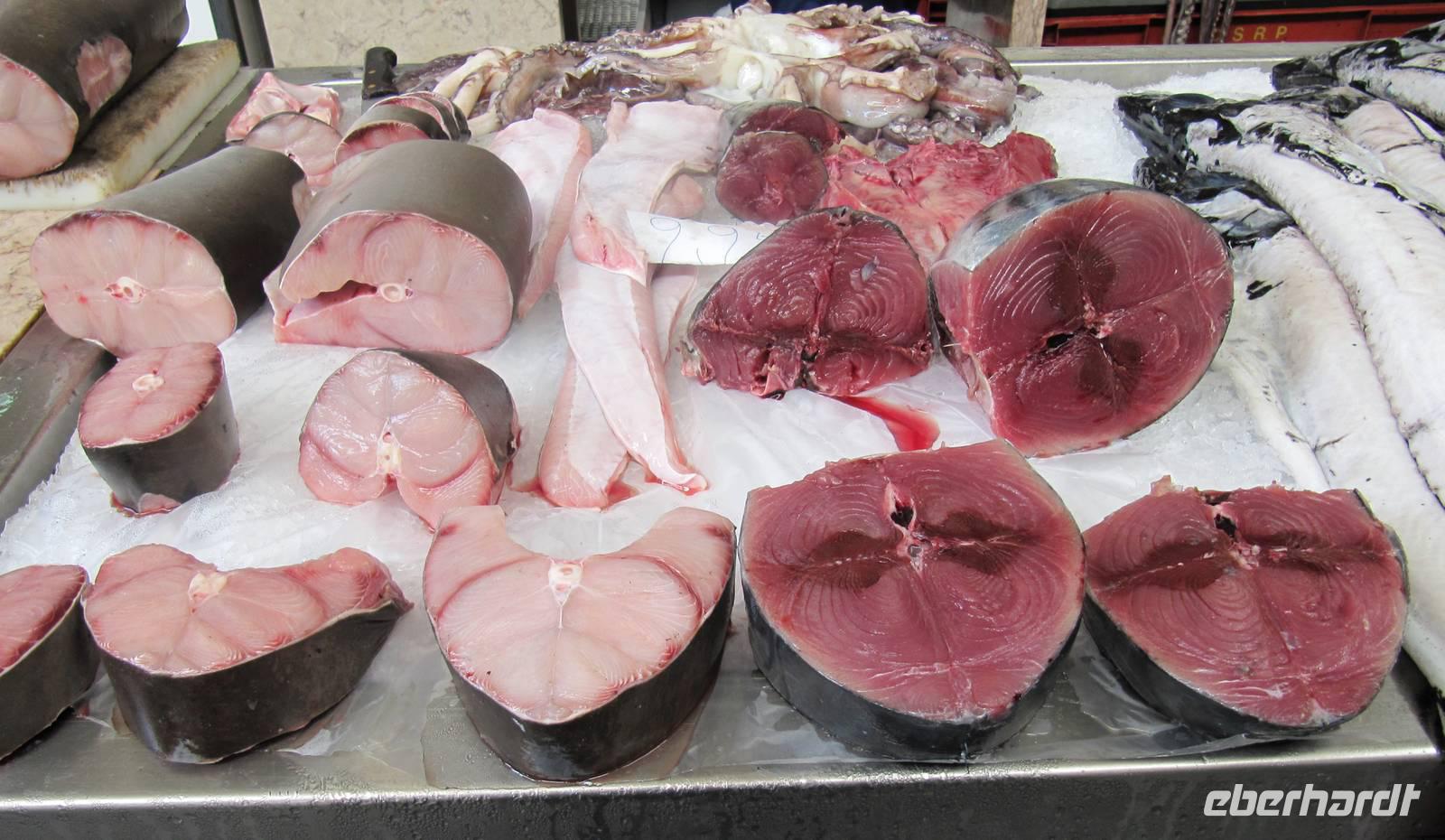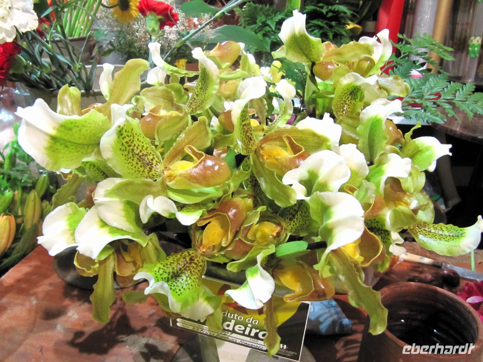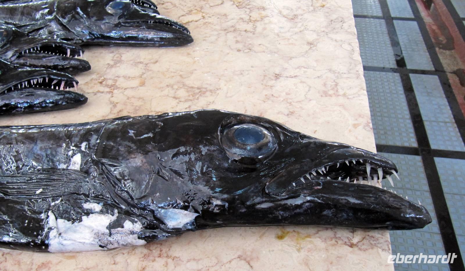 Marion begab sich ebenfalls mit Eberhardt-Gästen auf den Weg in das Zentrum der Altstadt. Erste Station war die Markthalle, die Mercado dos Lavradores, mit ihren Obst-, Gemüse- und Blumenständen, den Ständen der Korbmacher und natürlich der Fischhalle. Wir bestaunten den schwarzen Degenfisch, eine Delikatesse der Insel, den Thunfisch und sahen Früchte, die wir so noch nicht kannten, zum Beispiel die Ananas-Bananen, die Früchte der Monstera, des Fensterblattes. Zugleich probierten wir schmackhafte Kastanienkekse und einige der Früchte wie Cherimoya (Zuckerapfel) und Maracuja. Leider konnten wir keine der Blumen mit an Bord nehmen. Es war ein Traum der Farben und Formen! Nach einem kleinen Spaziergang probierten wir den kräftigen Madeirawein. Durch kleine Gassen erreichten wir später den Bus und nun ging es hinauf nach Monte. Im Anschluss an die Besichtigung der Wallfahrtskirche „schwebten" wir mit der Seilbahn hinab zum Botanischen Garten von Funchal, wo wir einen interessanten Einblick in die Pflanzenvielfalt der Insel erhielten. Kaum zu glauben, es ist November und wir stehen in einem Paradies aus Blüten! Nach etwas Freizeit zu individuellen Besichtigungen fuhren wir zurück zum Schiff.