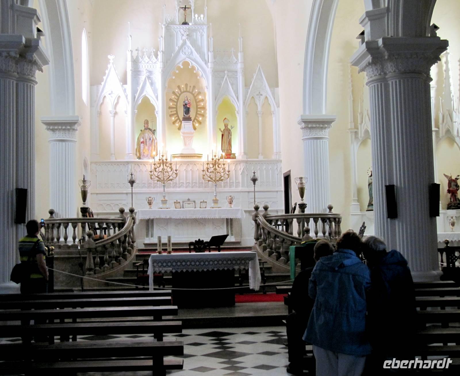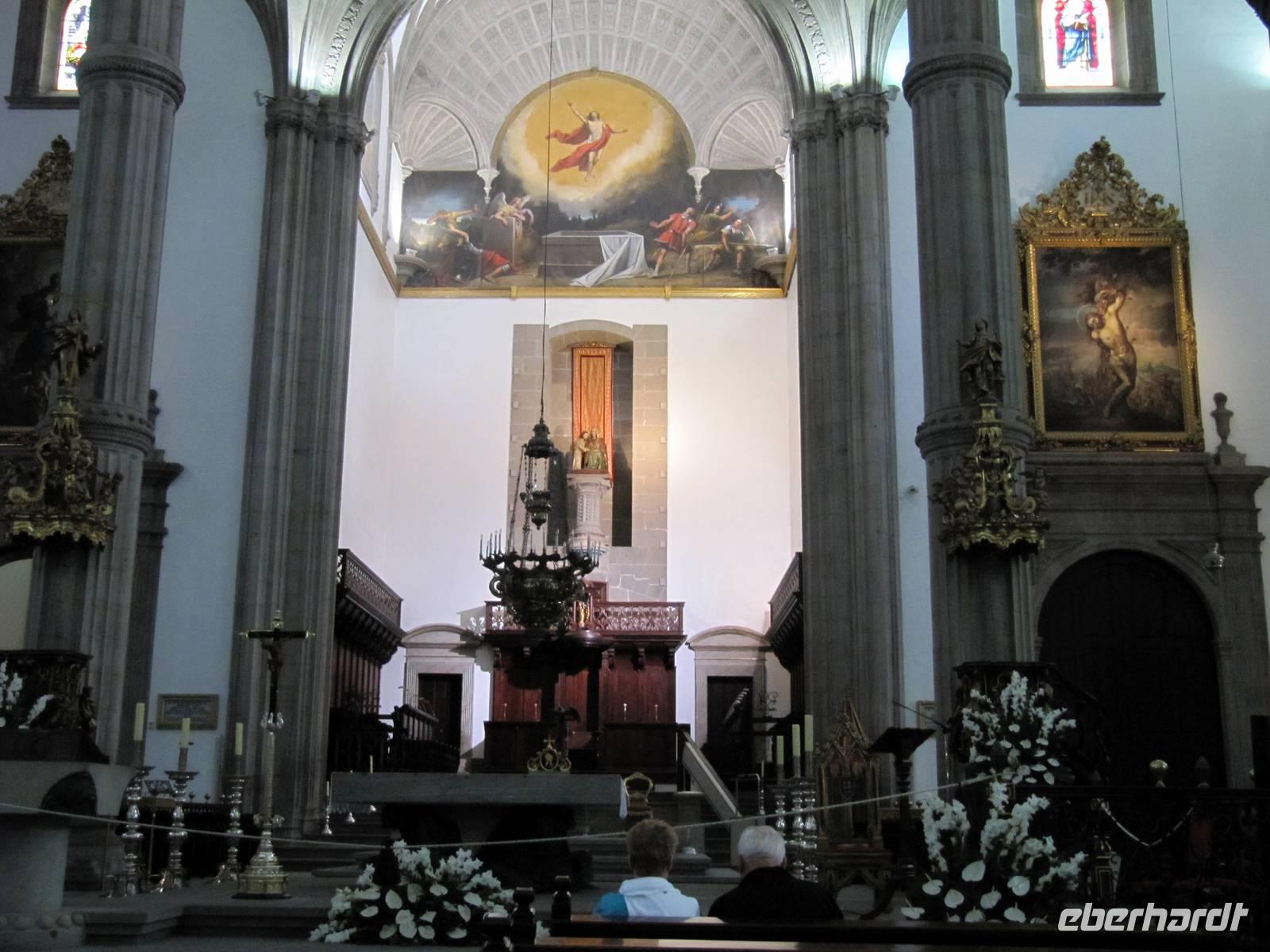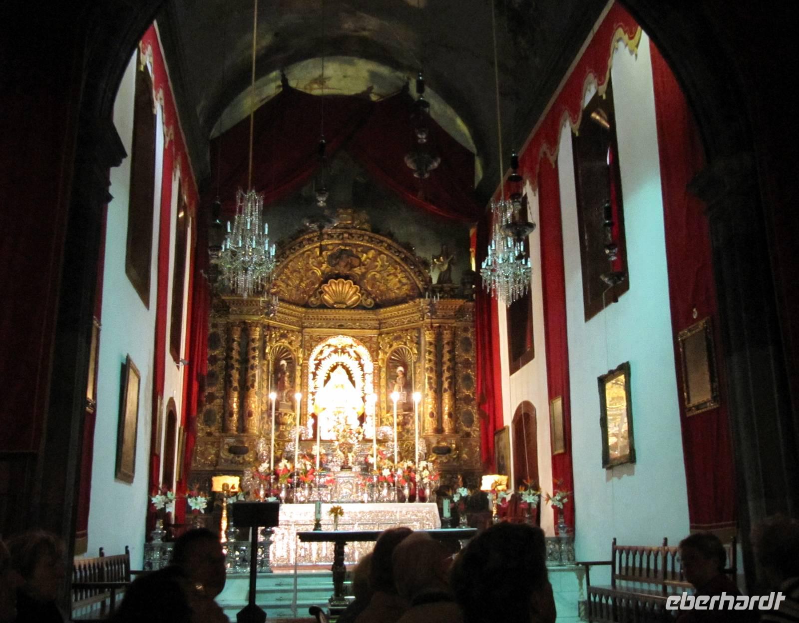Der Atlantik war heute etwas ruhiger und so schlummerten wir der Insel La Palma entgegen. Nach dem Frühstück erblickten wir die Vulkaninsel am Horizont und 09.00 Uhr erreichten wir den Hafen der Inselhauptstadt Santa Cruz de la Palma. Einige Gäste nutzten den Vormittag zu einem Spaziergang in den Gassen von Santa Cruz. 13.15 Uhr trafen wir uns an der Rezeption zu unserem Eberhardt-Inklusiv-Ausflug. Im Hafen erwarteten uns bereits Ulrike Langer, eine Österreicherin, die ihre zweite Heimat auf La Palma fand, und unser Chauffeur Miguel. Nach einer herzlichen Begrüßung war unsere erste Besuchsstation das Inselheiligtum von Las Nieves, die kleine Wallfahrtskirche „Santuario de la Virgen de las Nieves" mit der Schutzpatronin der Insel, der Jungfrau vom Schnee. Leise klassische Musik und die bereits weihnachtlich geschmückte Kirche ließen uns kurz innehalten.