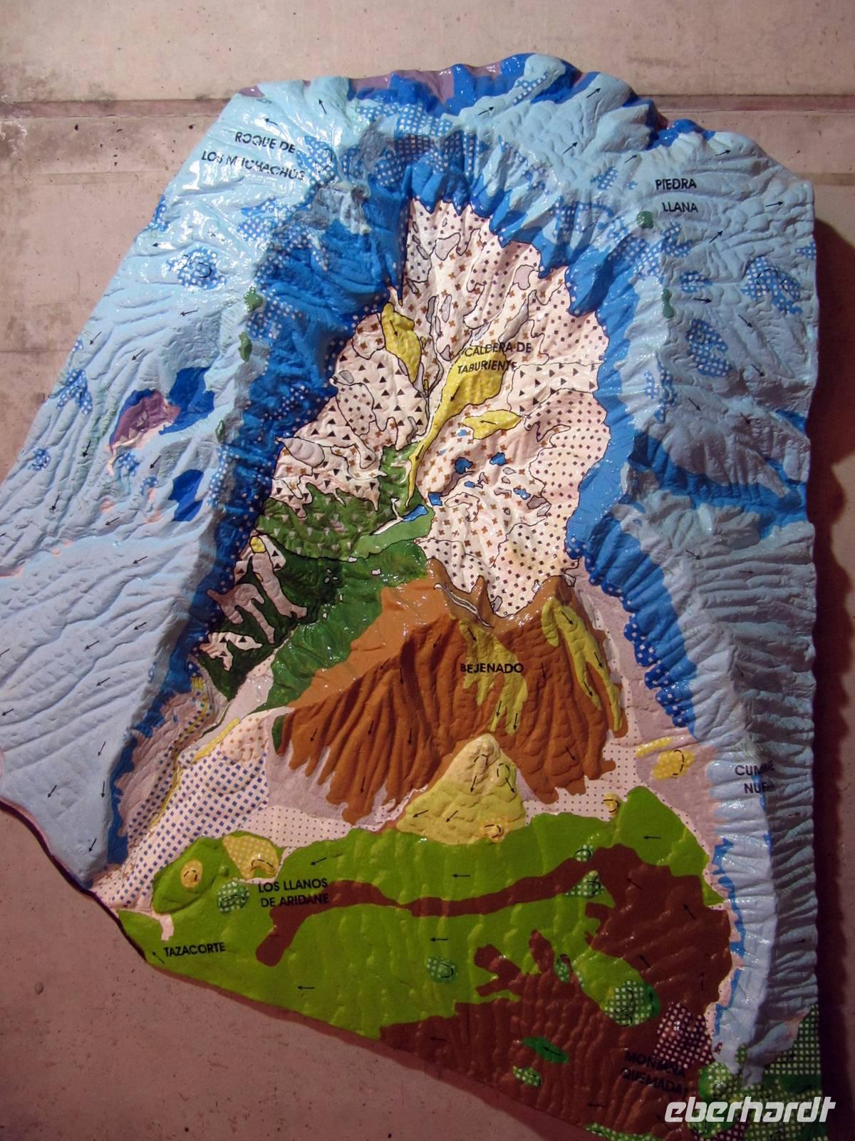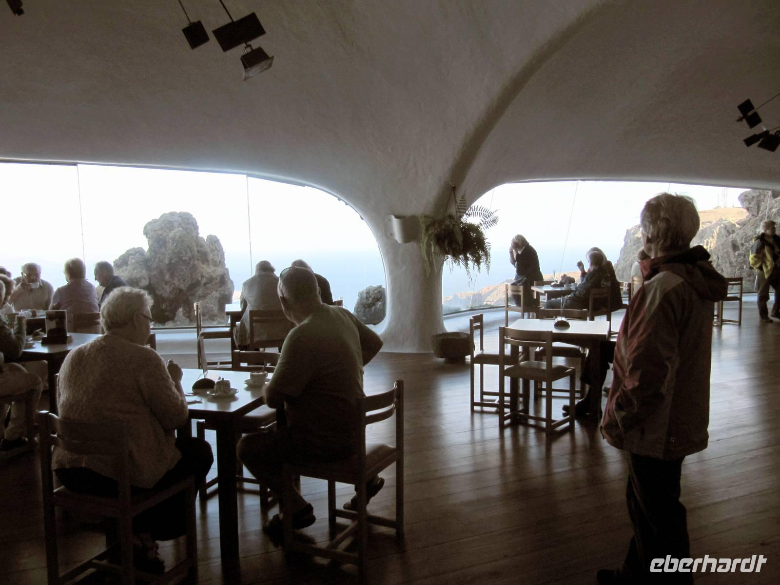 Das entmutigte uns nicht, denn Ulrike verwies darauf, dass es sich schnell ändert. Vom Mirador de la Concepción genossen wir den Ausblick auf die Inselhauptstadt Santa Cruz ganz unten. Durch den Himmelstunnel fuhren wir zum Besucherzentrum des Nationalparks Caldera de Taburiente. Von meinem Aufenthalt vor vier Jahren wusste ich, dass genau dieser Tunnel die Wetterscheide ist und oft im Süden wesentlich besseres Wetter sein kann. Mal schauen, wie es heute sein sollte ... Es zeigten sich wirklich Wolkenlücken mit zartem Blau, aber leider über der Caldera de Taburiente dichter Nebel und dicke, schwarze Regenwolken, ergänzt mit einem doppelten Regenbogen. Ulrike erklärte uns im Besucherzentrum anschaulich die Geologie der Insel und gab viele interessante Erläuterungen zur Caldera, die mit 10 Kilometern Durchmesser, Höhenunterschieden von bis zu 2.000 Metern und Gipfeln von 2.400 Metern Höhe zu den größten Kratern der Kanaren gehört. Zugleich erhielten wir viele Informationen zu aktuellen Vulkanaktivitäten rund um Kanarischen Inseln mit dem Hotspot in der Nähe der Insel El Hierro. Wir stimmten uns angesichts des Wetters ab und änderten unser Programm. In der Caldera hätten wir bei dichtem Nebel nichts sehen können, schade!