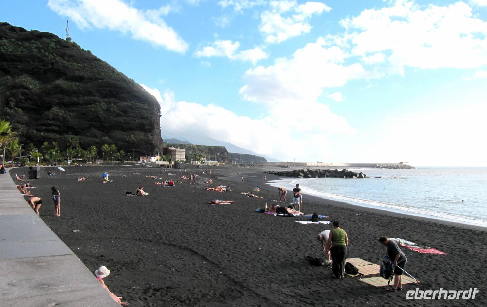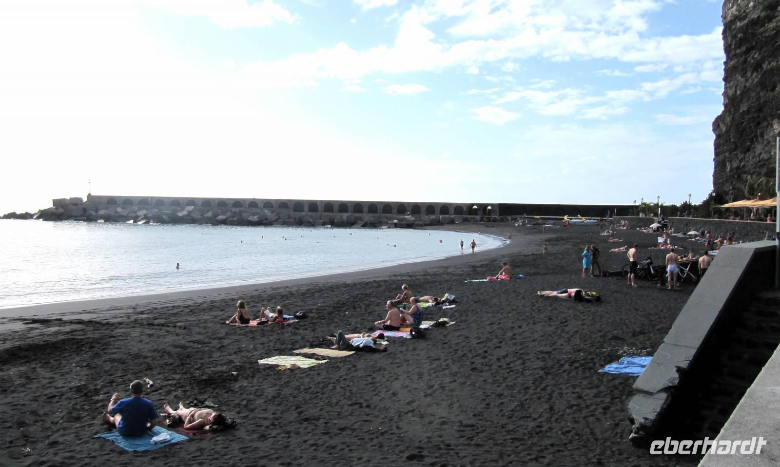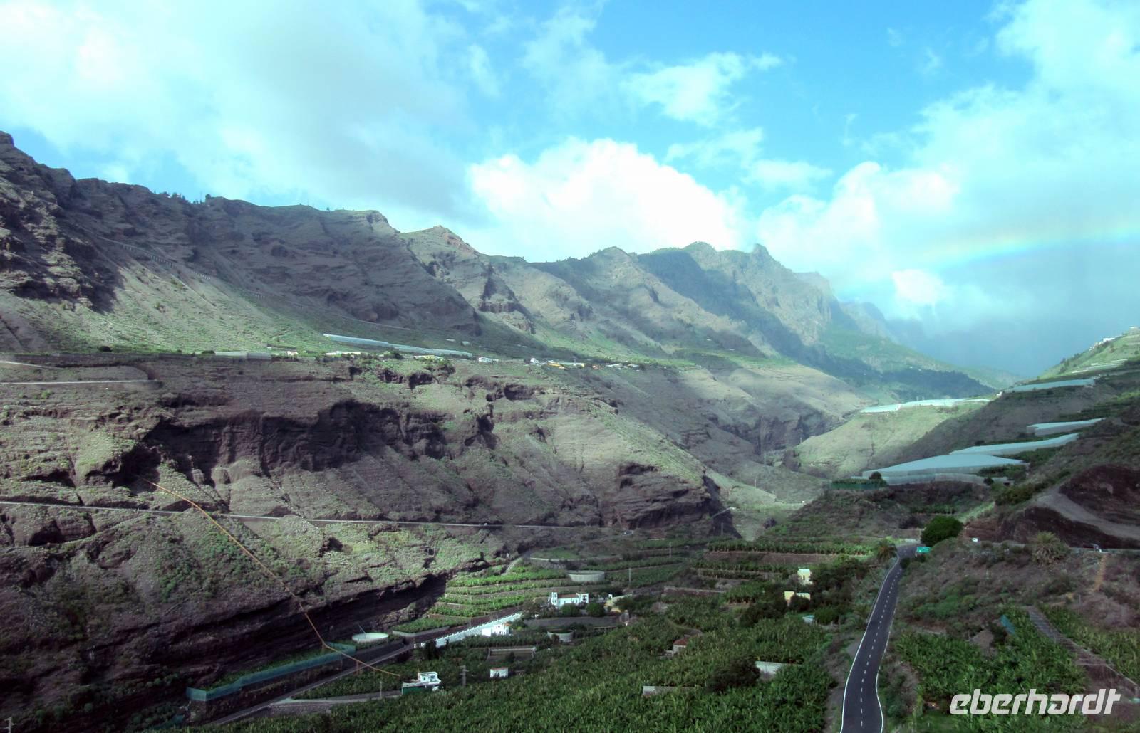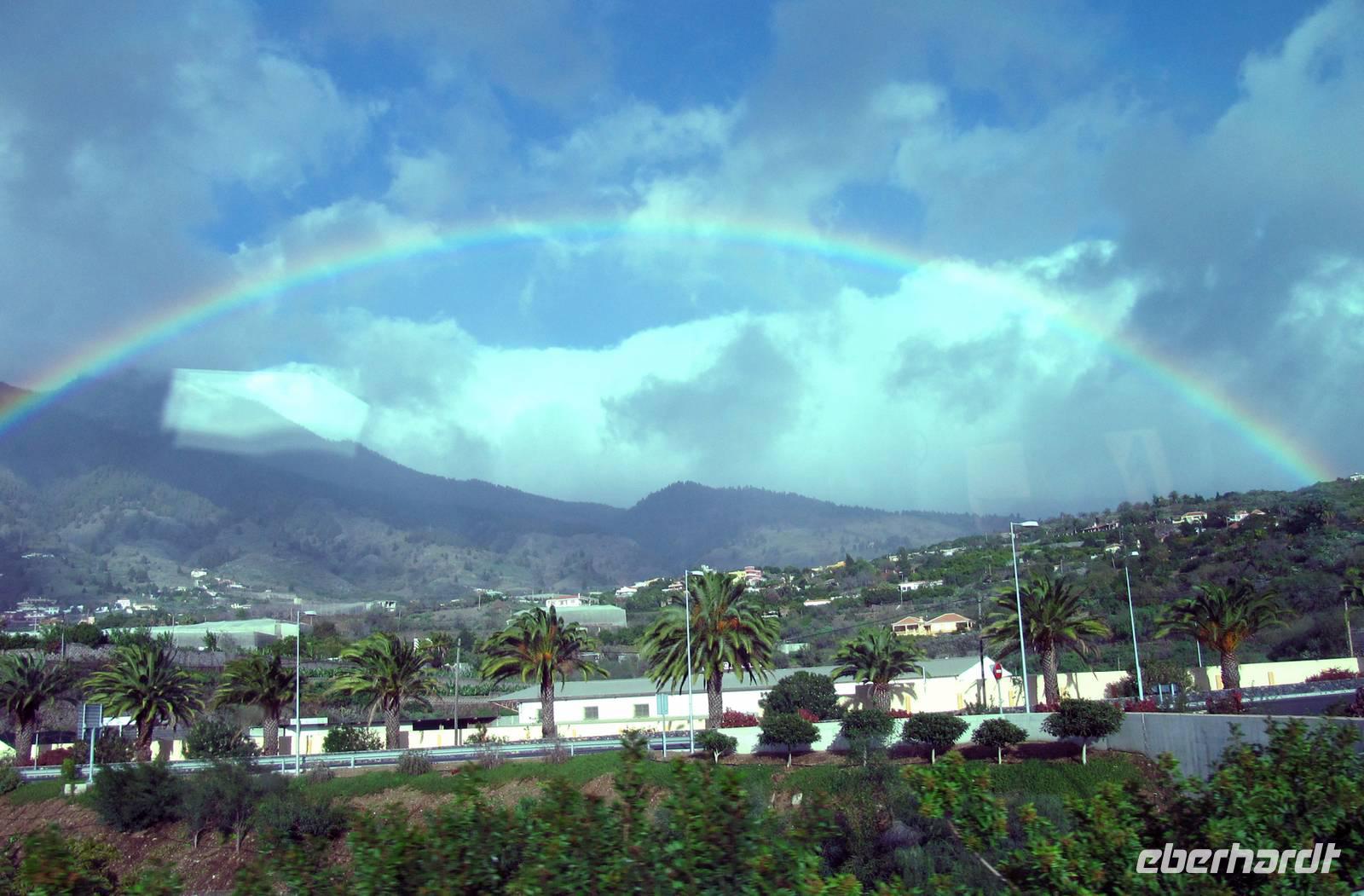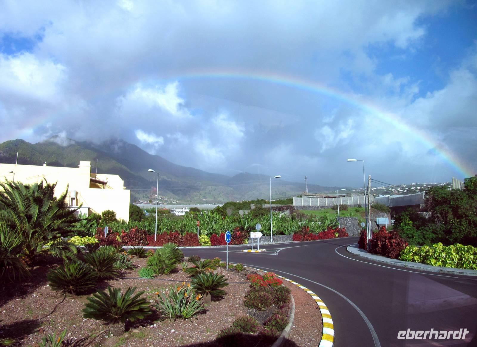 Also fuhren wir weiter in den Westen der Insel, vorbei an der großen Schlucht der Caldera, entlang von riesigen Bananenterrassen nach Porto Tazacorte. Ulrike berichtete, dass genau an diesem Ort 1492 die Spanier unter Fernández de Lugo anlandeten und die Ureinwohner, die Guanchen, besiegten. Ihr Hauptling, Tazo, fiel in diesem Kampf. Er gab dem Ort seinen Namen. Wir spazierten in der Sonne bei sommerlichen 24 °C und erfreuten uns an den kleinen Gassen, den gepflegten Fassaden und dem kleinen Park. Bei einem Glas Carajillo (Kaffee mit Cognac) oder Cortado (Kaffee mit viel Kondensmilch) verweilten wir im Hafen mit Blick zum schwarzen Lavastrand und auf den Atlantik. Viel zu schnell verging die Zeit und wir traten unsere Rückfahrt nach Santa Cruz an. Immer wieder sahen wir Regenbögen über der Caldera de Taburiente. Auch wenn wir nicht direkt in sie hineinschauen konnten, so war dieser Anblick traumhaft schön ...
