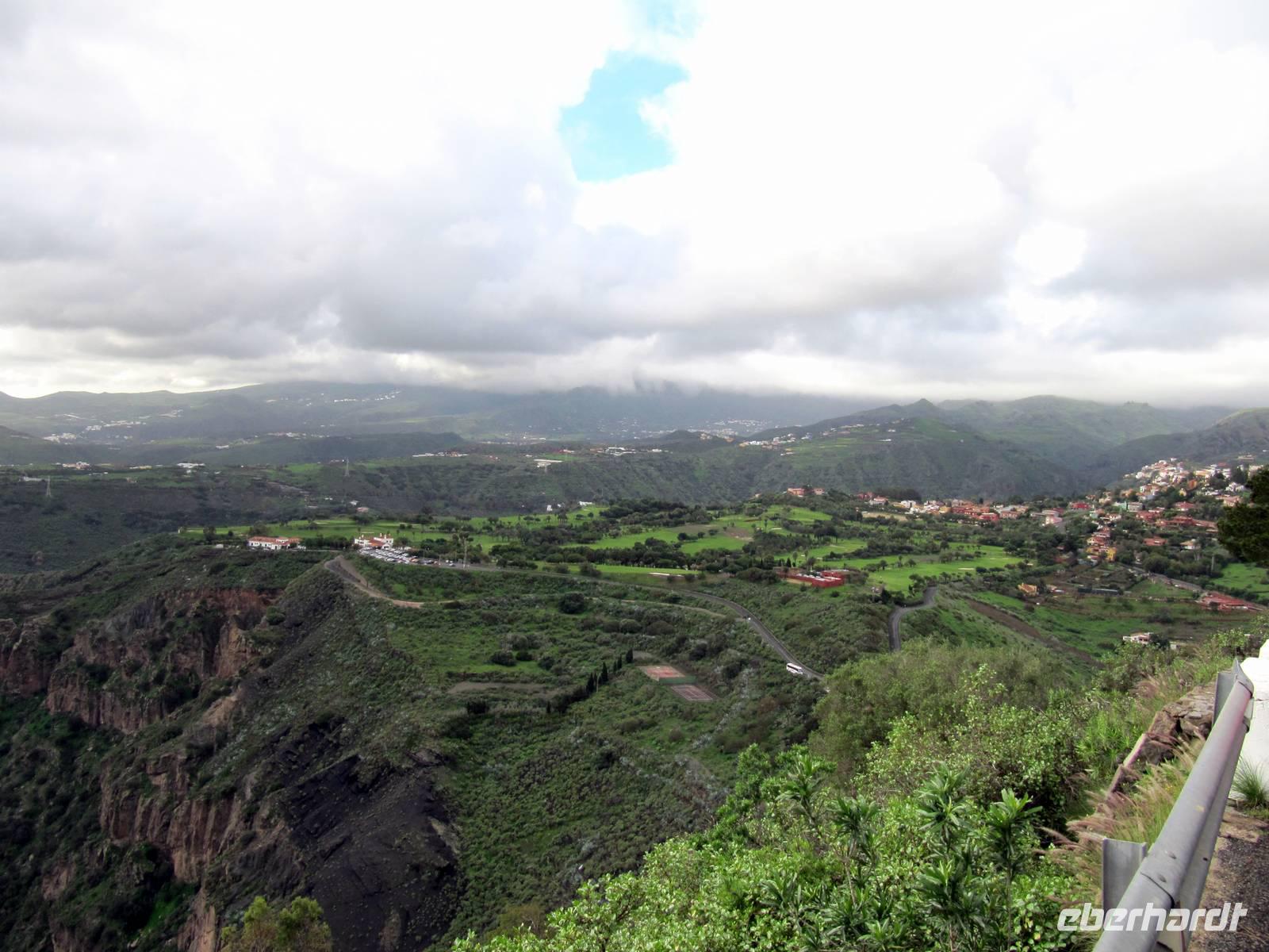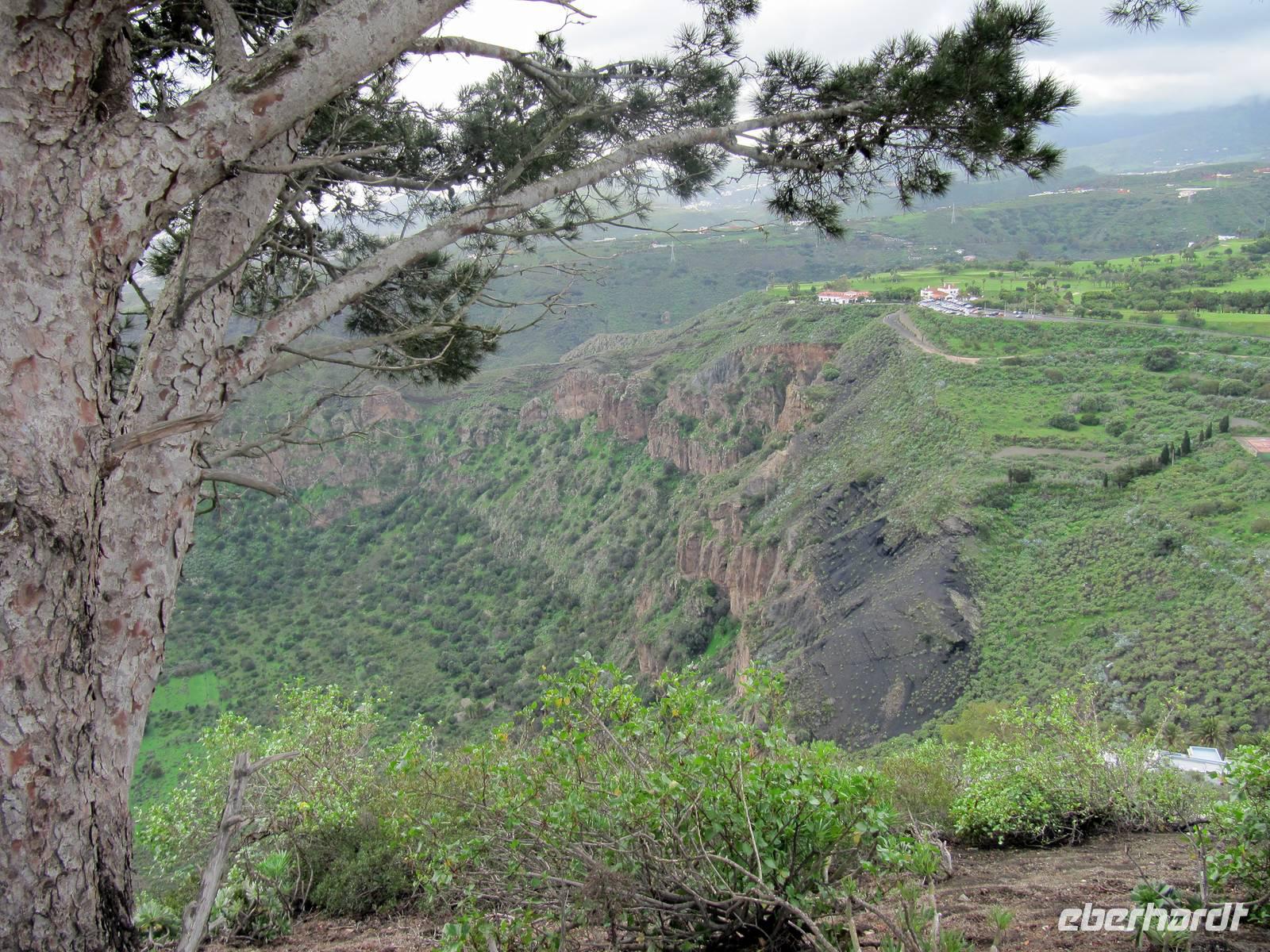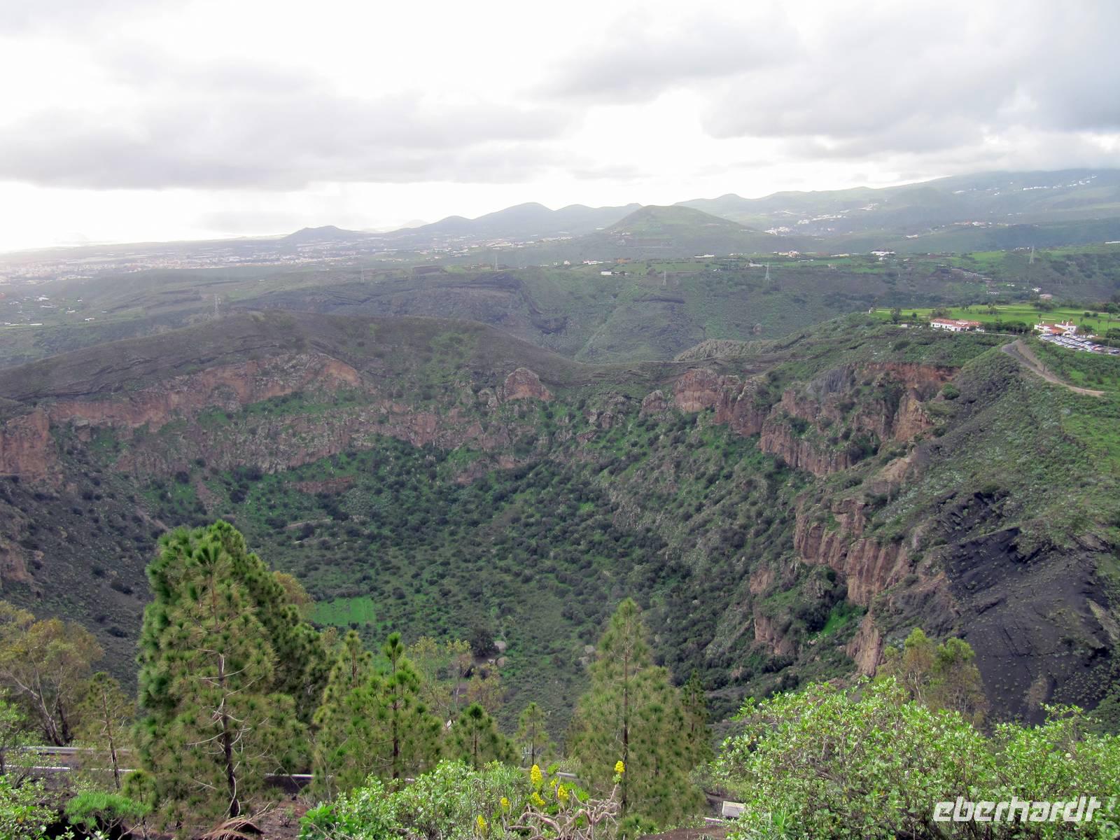 Marion weilte mit Gästen im Parque Doramas am Nobel-Hotel Santa Catalina und am Pueblo-Canario. Nun hieß es für den Bus klettern. Wir fuhren hinauf zum Bandama-Krater und zum Pico de Bandama (570 Meter über dem Meer). Von hier eröffnete sich uns ein imposanter Blick bis nach Las Palmas. Noch viel eindrucksvoller der Blick in den Krater: 200 Meter steil nach unten schauten wir voller Erfurcht hinab. Ein Bauer soll den Krater bewirtschaften. Ihn haben wir nicht gesehen, aber kleine Gebäude und gepflegte Handtuchfelder.