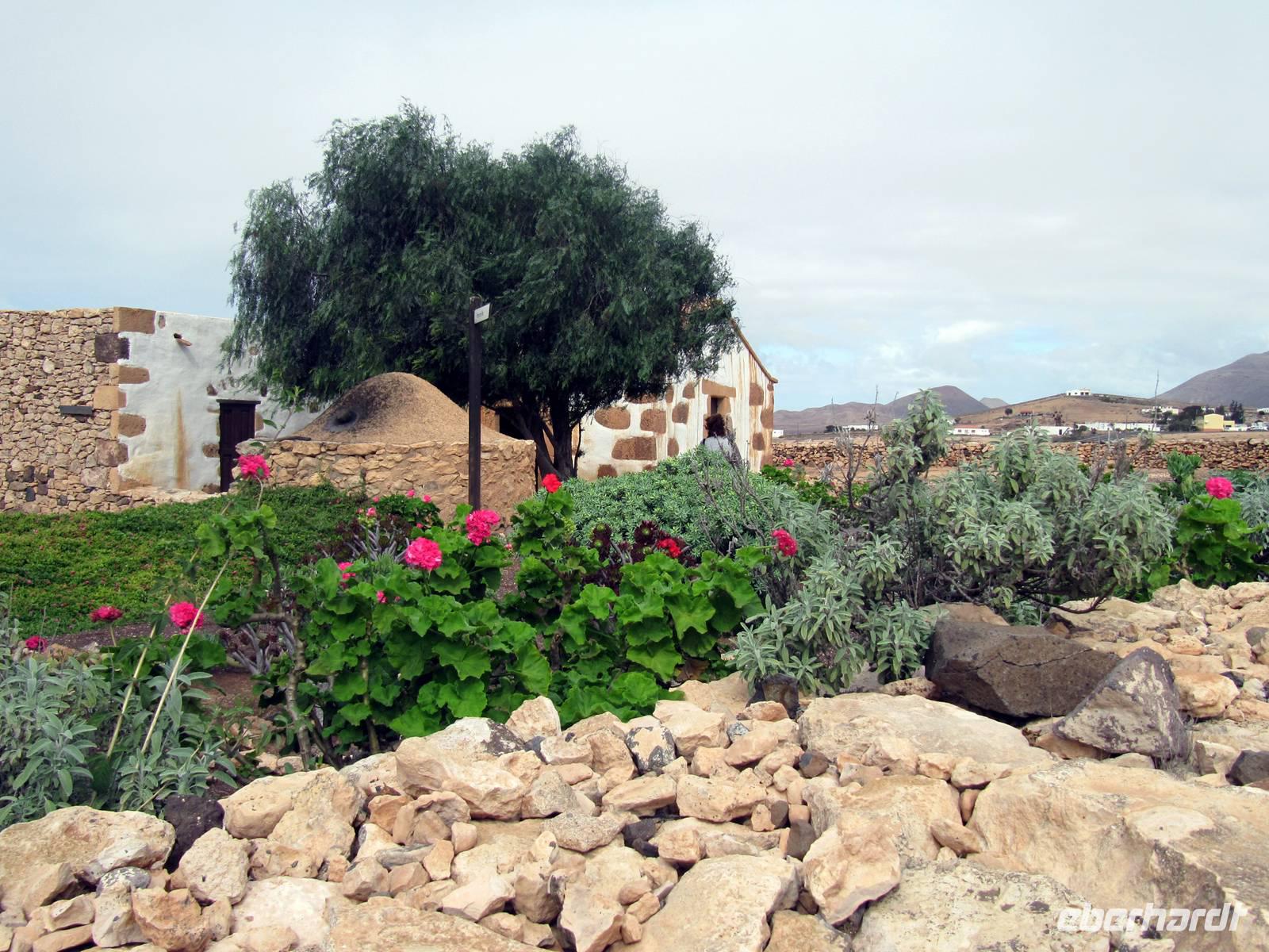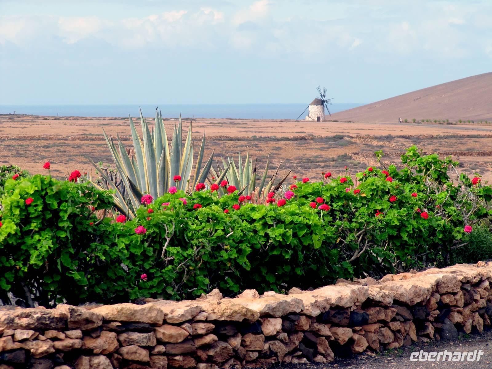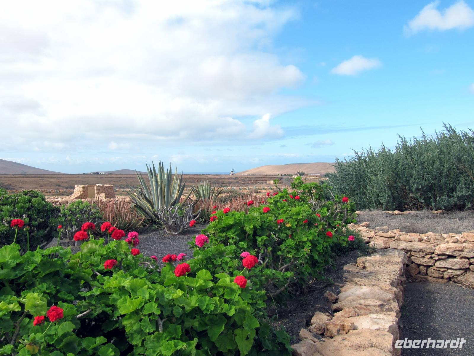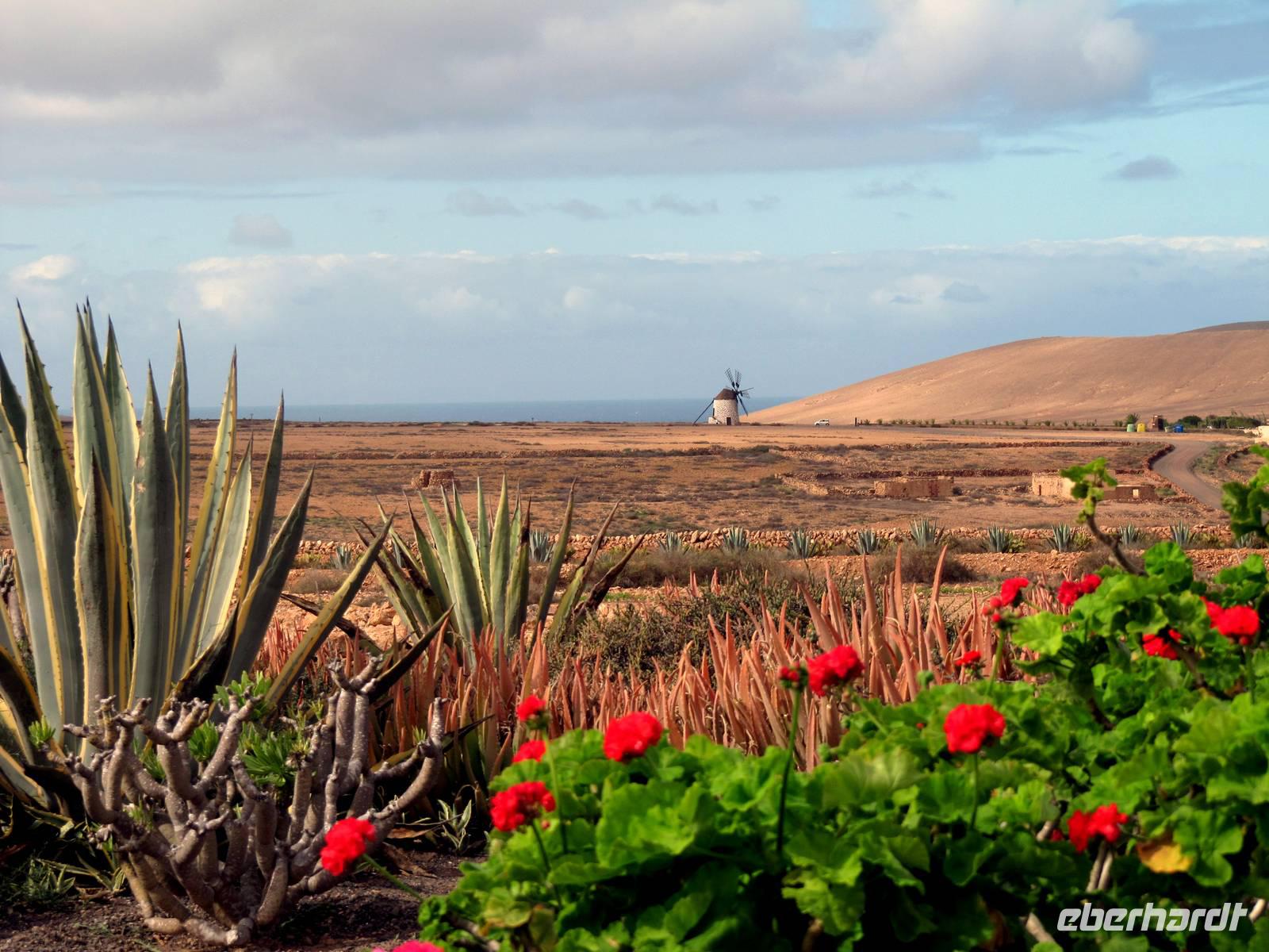Marion entdeckte mit weiteren 15 Gästen auf einer kleinen Inselrundfahrt zuerst mitten in einem Hochtal die alte Inselhauptstadt Betancuria. In der Casa Santa Maria bestaunten wir eine Multivisionsshow, die uns Fuerteventura zu allen Jahreszeiten präsentiert. Kaum vorzustellen, dass auf diesen kahlen Vulkanbergen bunte Blumenwiesen blühen. In der Aloe-Fabrik AVISA, der wohl ältesten ihrer Art in Europa, erfuhren wir viel Wissenswertes zur Geschichte und Wirkung dieser Heilpflanze, einer Lilienart. Einige Gäste erhielten zudem eine kleine Nackenmassage.
