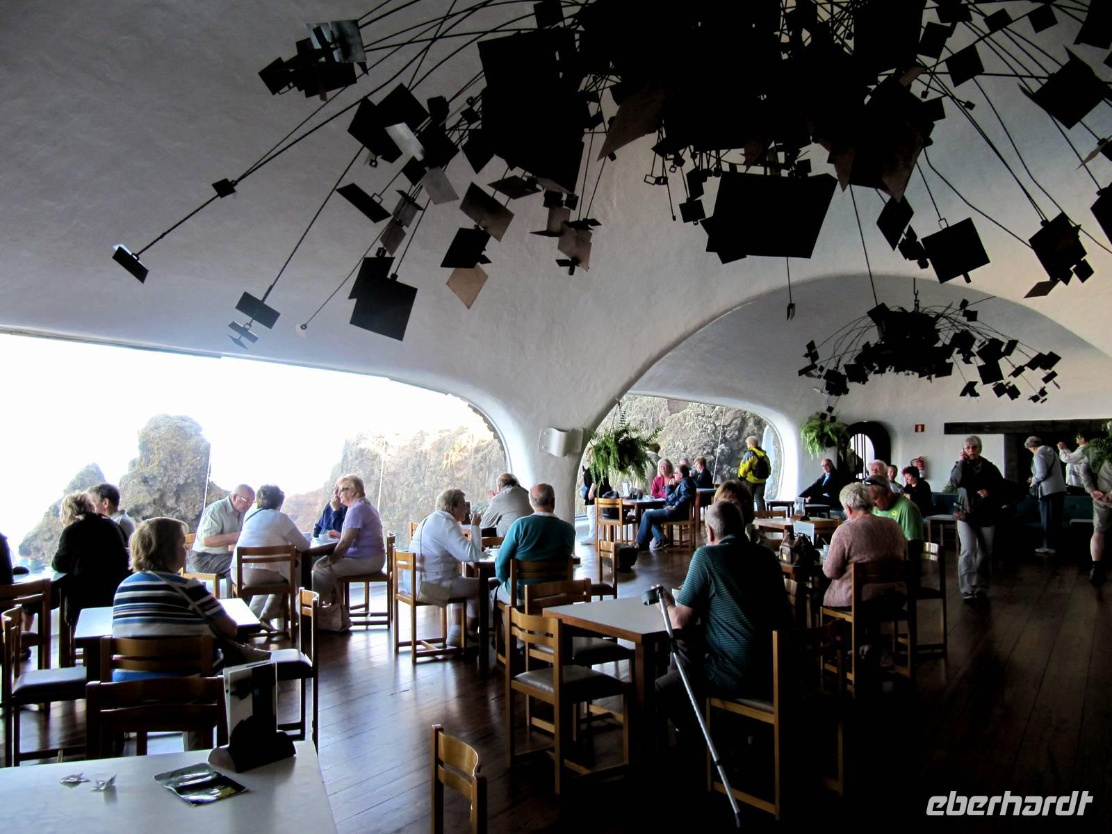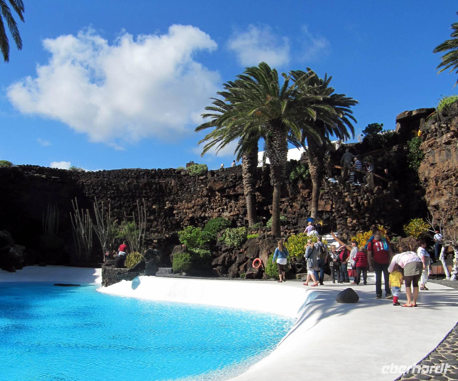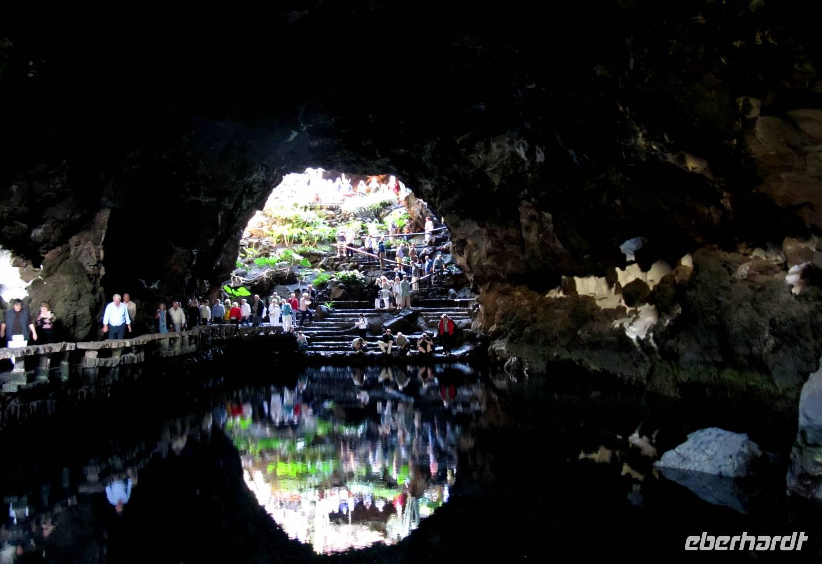 Beide Gruppen verweilten zudem an zwei der bedeutenden Schöpfungen des Malers, Architekten und Bildhauers César Manrique. Er will uns die Augen öffnen, mit der Landschaft sorgsam umzugehen und als Mensch so Hand anzulegen, dass die Landschaft verschönt wird. Am Mirador del Rio standen wir vor einem Felseneingang, der sich harmonisch in das Landschaftsbild einfügte. Groß unser Erstaunen als wir durch die „Augen des Künstlers" von der 479 Meter hohen Klippe auf den Atlantik und die Nachbarinsel La Graciosa blickten. Nächste Station war die Jameos del Agua. Auch hier war von außen wenig von der Einzigartigkeit und der Schönheit zu sehen. Über eine Holztreppe betraten wir die 100 Meter lange offene Lava-Blase mit dem unterirdischen Salzwassersee, dem Lebensraum der kleinen, blinden Albinokrebse, die sonst nur in der Tiefsee vorkommen.