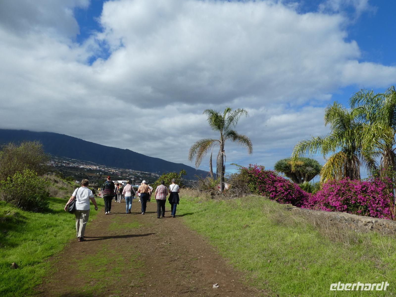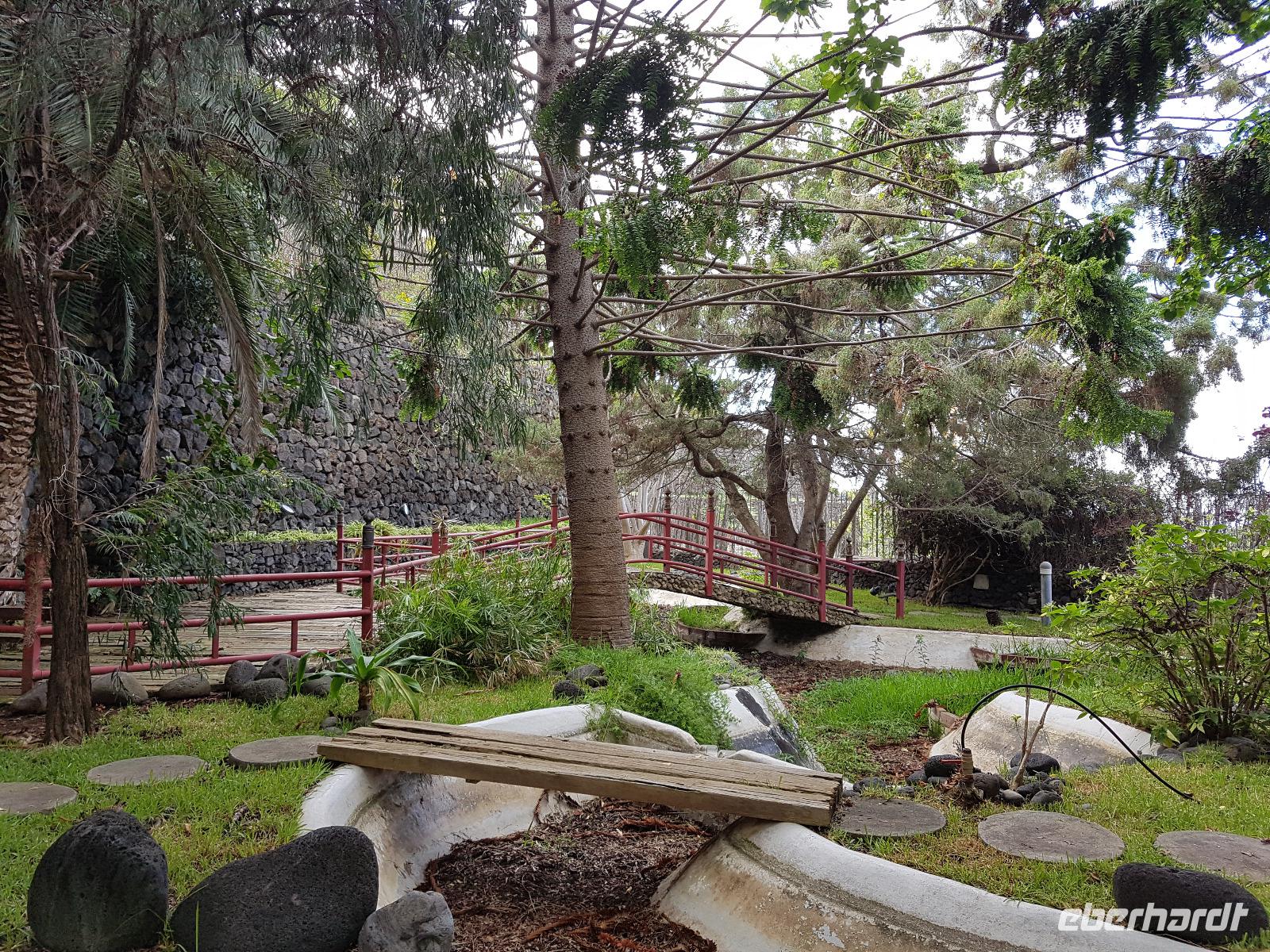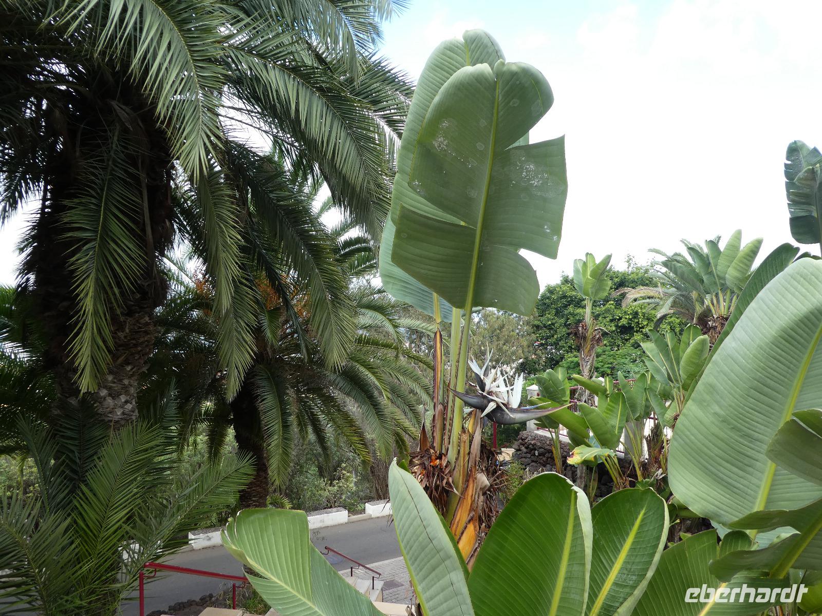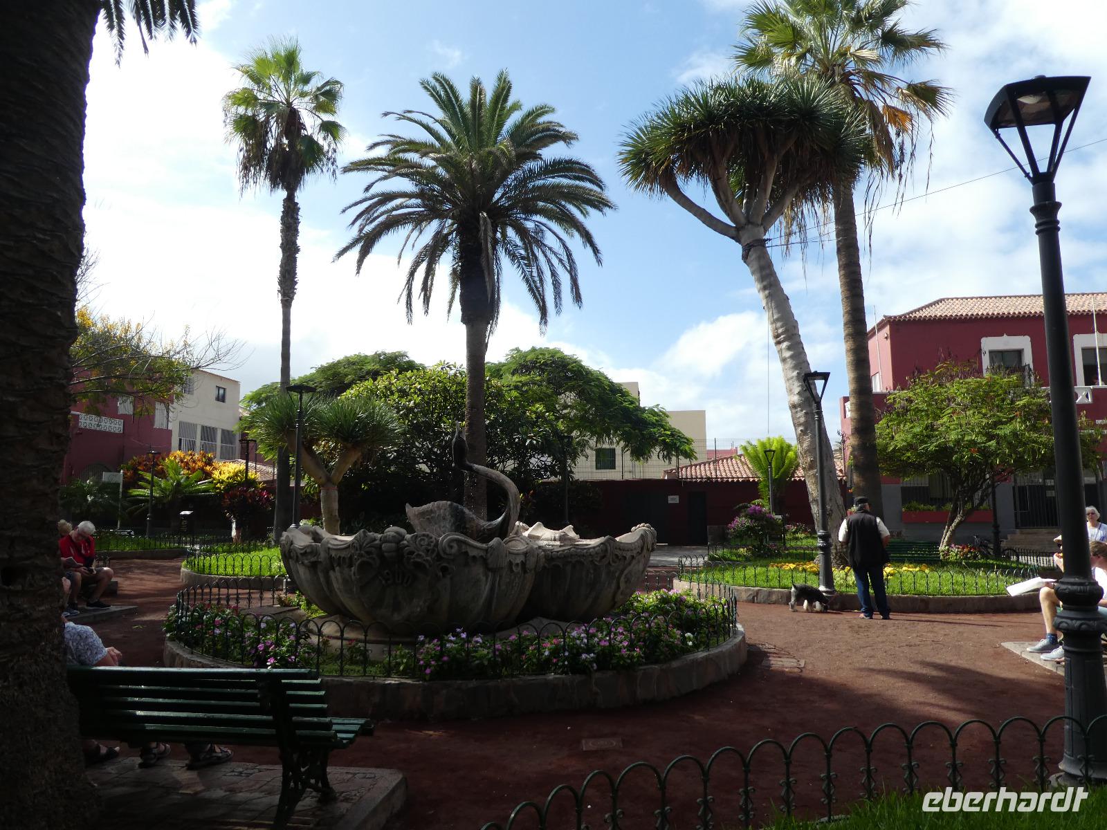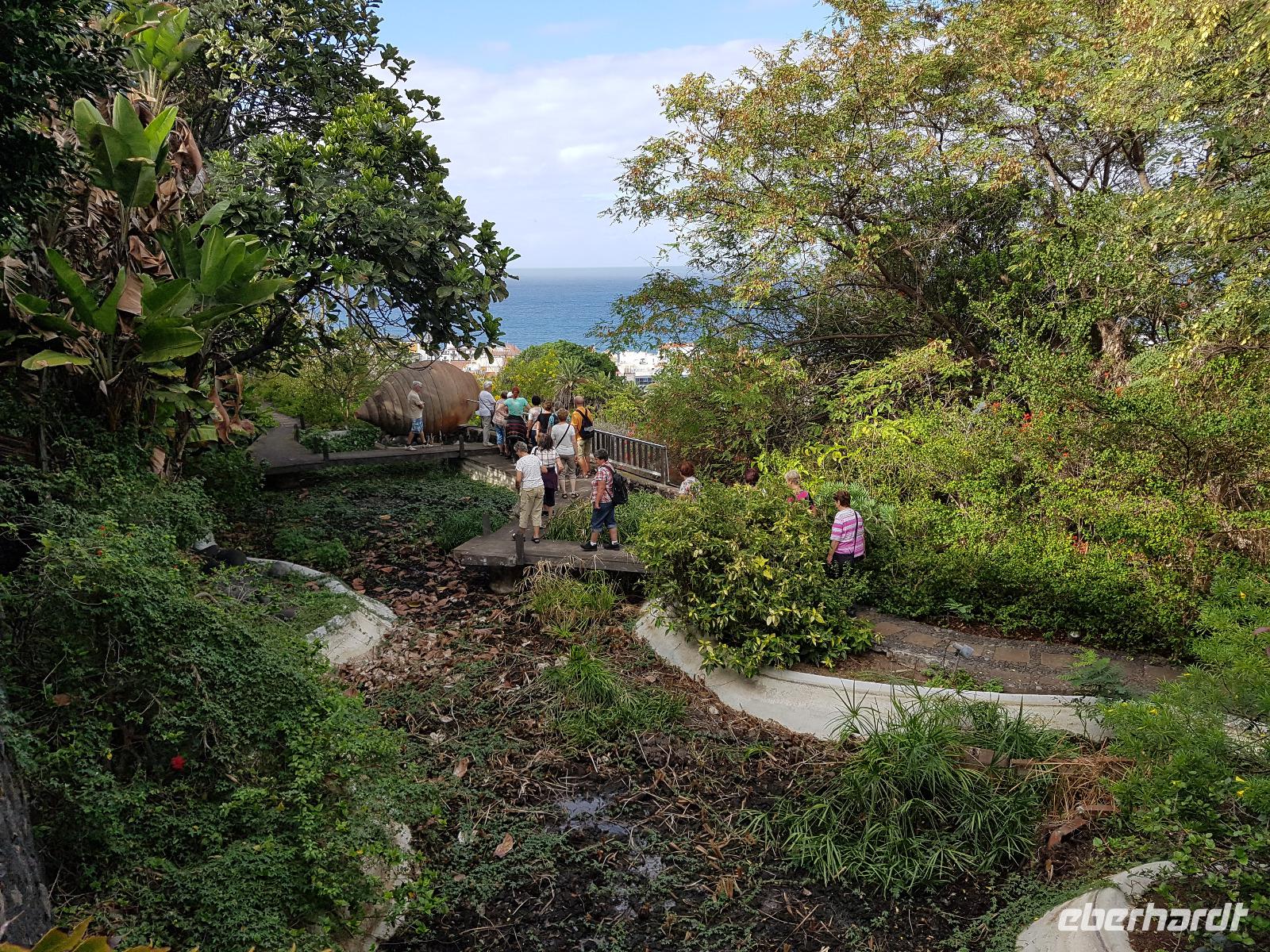 Zu Fuss spazierten wir hinauf zum Taoro Park über Treppen und viele Serpentinen. Schöne Aussichtsterrassen, Wasserfälle und Bachläufe säumten den Weg und viele Pflanzen standen noch in voller Blüte. Im Zentrum des Parks steht das ehemalige Grand Hotel Taoro aus dem Jahr 1890. Bis 2004 beherbergte es das Casino der Stadt und nun soll es wieder ein Luxus Hotel werden. Auf Empfehlung besuchten wir dann den Risco Bello Wassergarten. Leider wurden die Teiche saniert und hatten kein Wasser und so konnten wir uns nur an der herrlichen Pflanzenwelt erfreuen. Zum Kaffeetrinken suchten wir dann das Cafe im Taoro Park auf und schöpften wieder neue Kräfte für den Rückweg. Unser Hotel war Luftlinie vom Cafe nicht weit entfernt, aber es lag ein gewaltiger Höhenunterschied und ein Tal dazwischen. So spazierten wir wieder hinunter zum Charco Platz und von dort durch eine Fussgängerzone zurück zum Hotel. Immerhin waren 15 km zusammen gekommen und so konnte jeder guten Gewissens das üppige Buffet beim Abendessen geniessen.