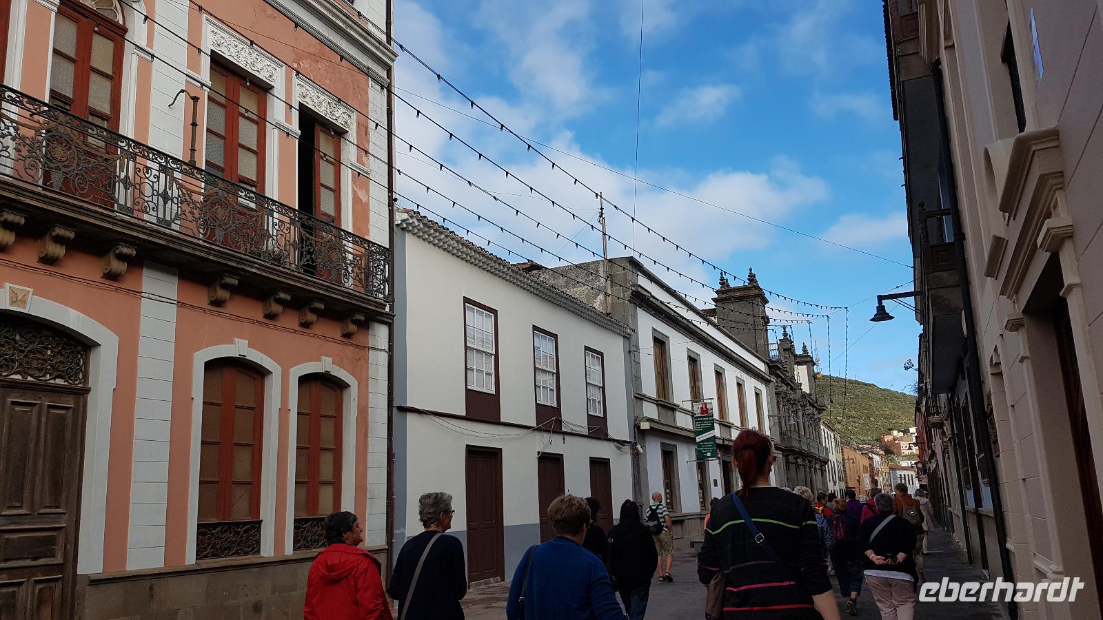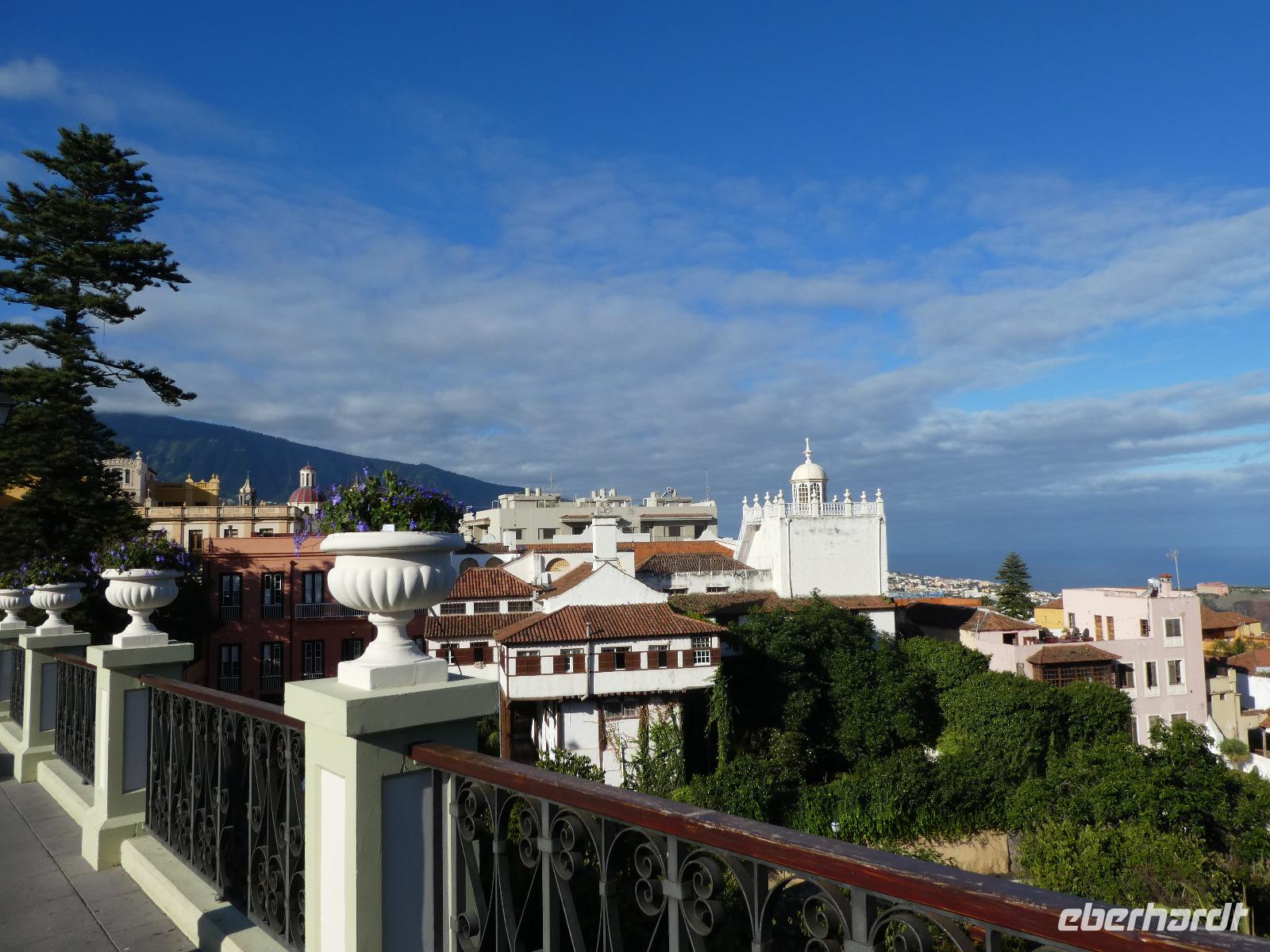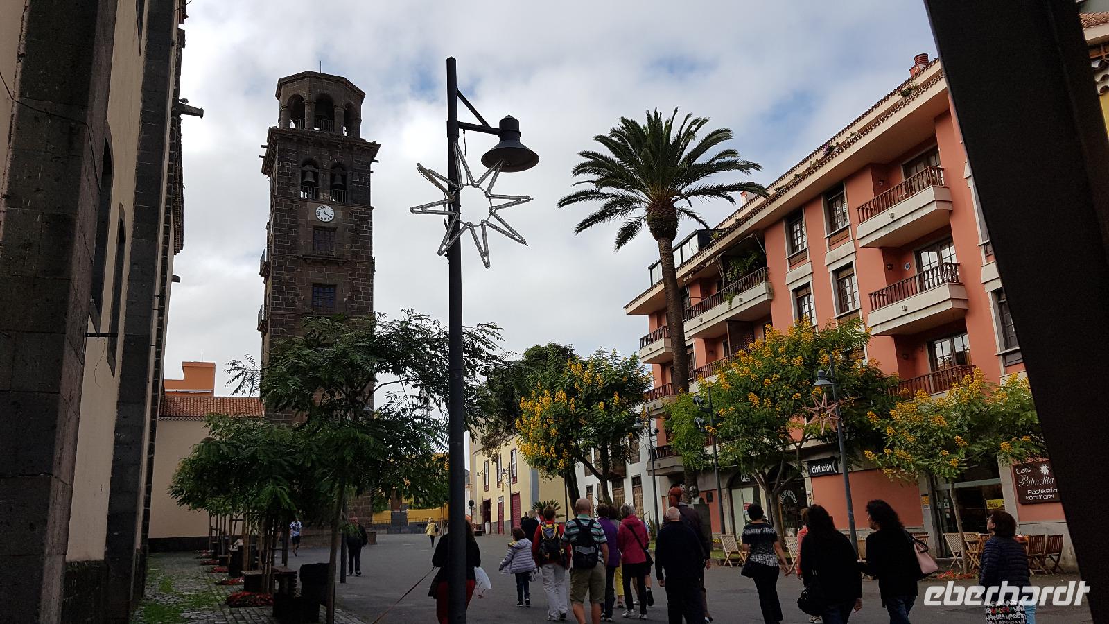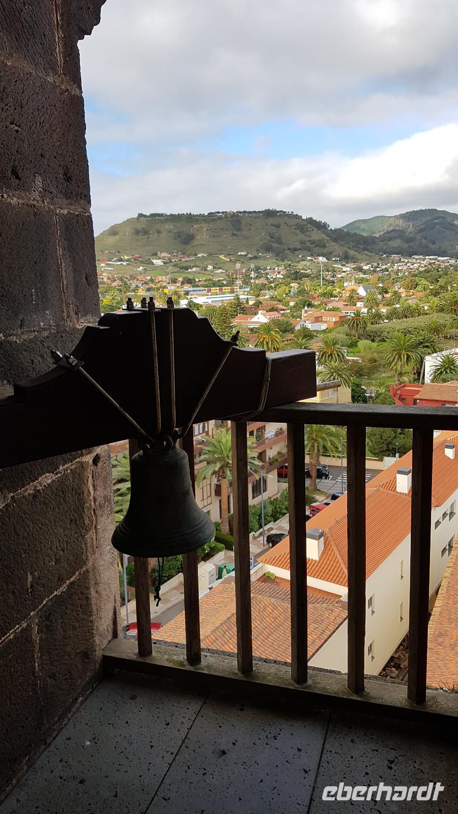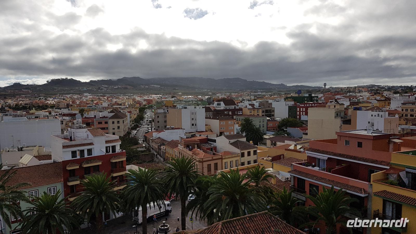 Unsere ausgedehnte Mittagspause verbrachten wir in der alten Universitätsstadt La Laguna. Die Stadt liegt auf 600 m Höhe und wurde Ende des 15.Jahrhunderts gegründet. Schachbrettartig sind die alten Strasse angelegt und um die Stadt verläuft eine Bergkette. So konnte man sich eine Stadtmauer sparen. Wir spazierten durch die alten Gassen und kehrten ein im Patio Canario - ein Restaurant mit Kanarischem Innenhof. In 7 Gängen probierten wir kanarische Spezialitäten und dazu gab es einen hervorragenden Rotwein. Danach brauchen wir Bewegung und gingen zum Kirchturm der Iglesia de la Conception. Wir steigen 99 Stufen hinauf und aus einer Höhe von 36 Metern hatten wir einen fantastischen Rundblick zu den Bergen, auf die Gassen der Stadt und zur Start- und Landebahn des Flughafens Teneriffa Nord. Auf dem Rückweg zum Parkplatz besuchen wir den Innenhof des Bischofspalastes und das Haus der Italiener.