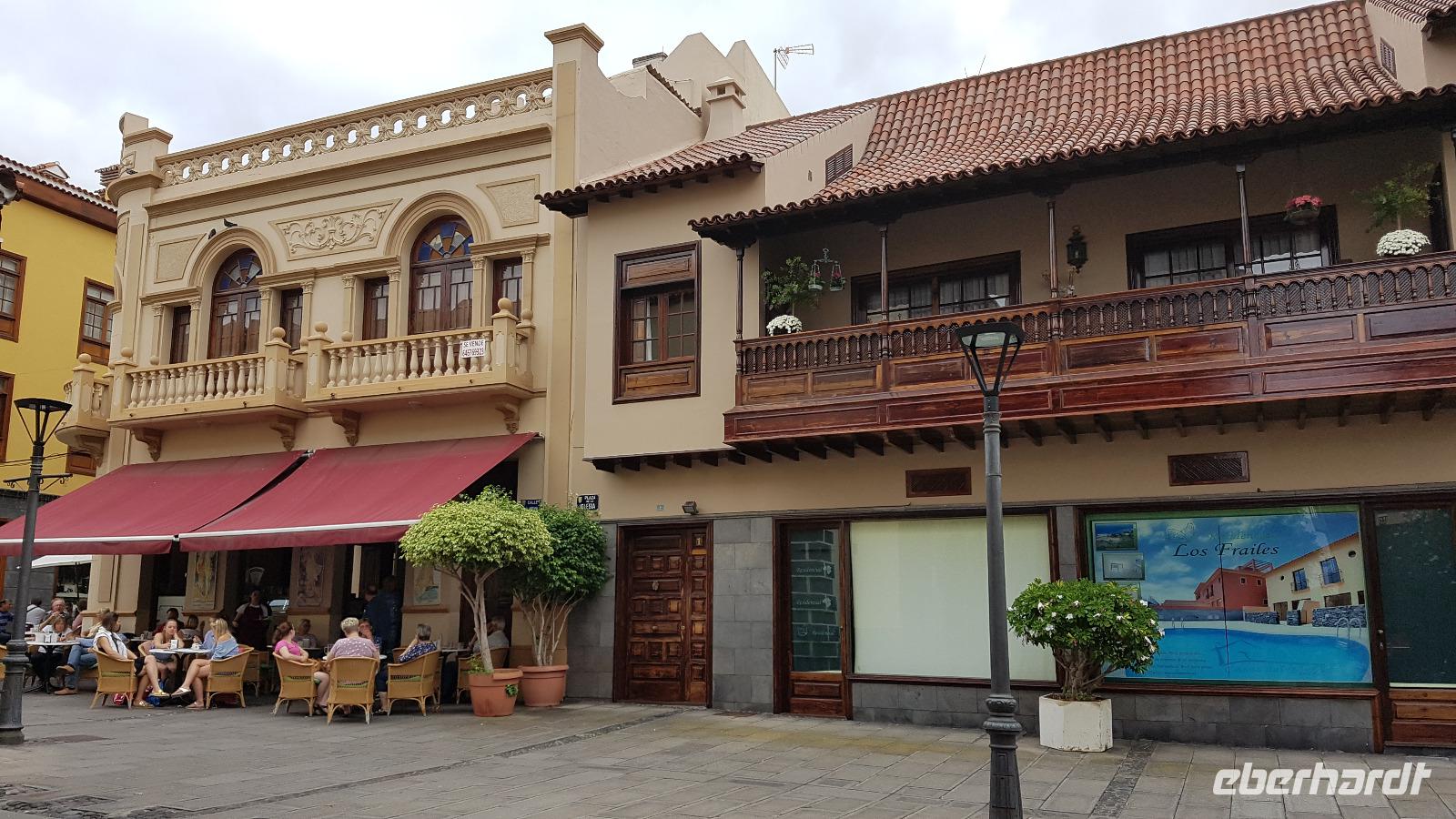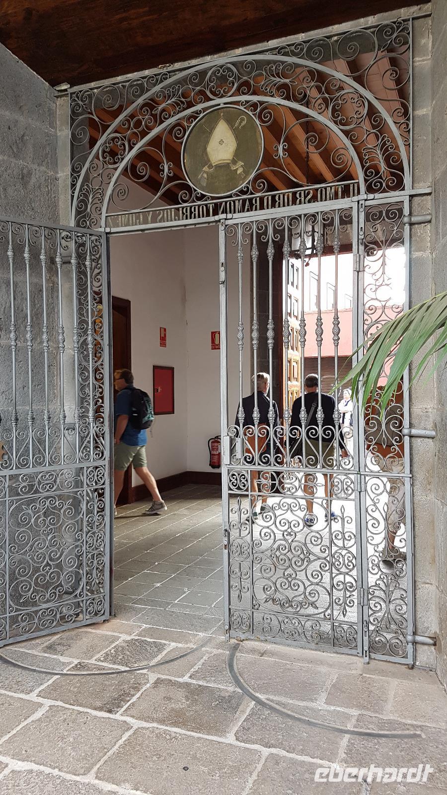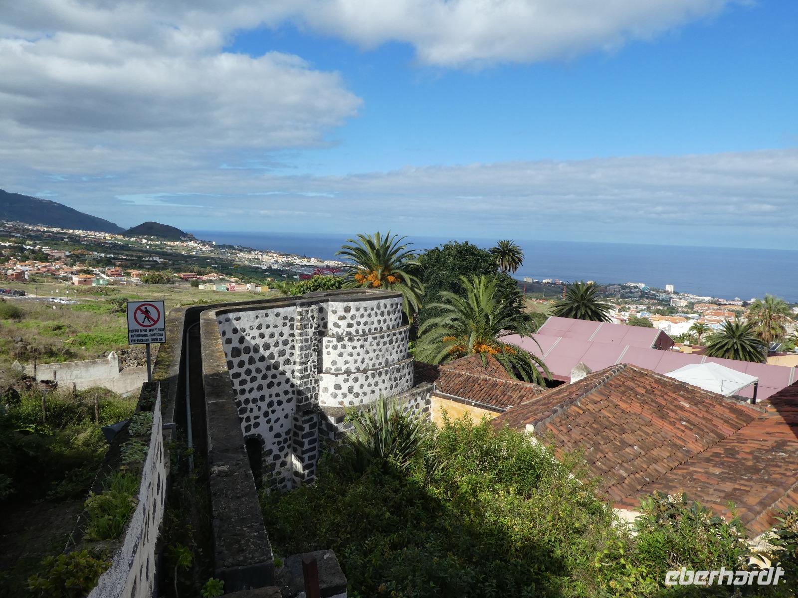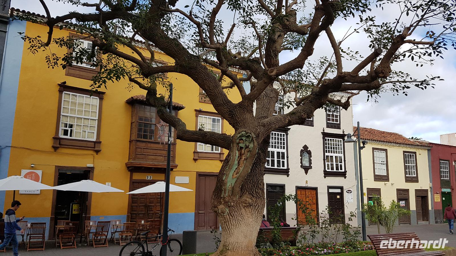 Unsere ausgedehnte Mittagspause verbrachten wir in der alten Universitätsstadt La Laguna. Die Stadt liegt auf 600 m Höhe und wurde Ende des 15.Jahrhunderts gegründet. Schachbrettartig sind die alten Strasse angelegt und um die Stadt verläuft eine Bergkette. So konnte man sich eine Stadtmauer sparen. Wir spazierten durch die alten Gassen und kehrten ein im Patio Canario - ein Restaurant mit Kanarischem Innenhof. In 7 Gängen probierten wir kanarische Spezialitäten und dazu gab es einen hervorragenden Rotwein. Danach brauchen wir Bewegung und gingen zum Kirchturm der Iglesia de la Conception. Wir steigen 99 Stufen hinauf und aus einer Höhe von 36 Metern hatten wir einen fantastischen Rundblick zu den Bergen, auf die Gassen der Stadt und zur Start- und Landebahn des Flughafens Teneriffa Nord. Auf dem Rückweg zum Parkplatz besuchen wir den Innenhof des Bischofspalastes und das Haus der Italiener.