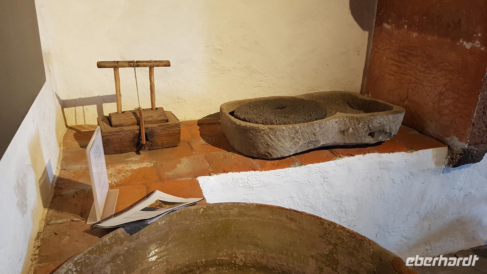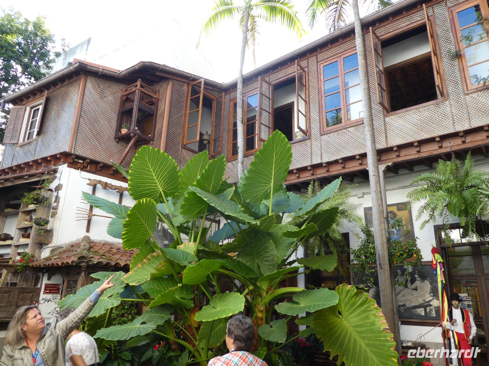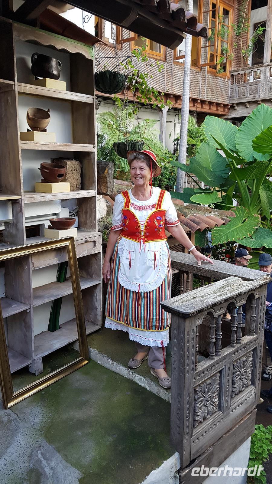 Unweit des Bauernmarktes befindet sich ein ehemaliges Herrenhaus aus dem 18.Jahrhundert, welches zum Museum umgestaltet wurde. In der Casa de Carta im Valle der Guerra sahen wir die Volkstrachten der verschiedenen kanarischen Inseln, eine Tabakpresse, verschiedene Töpfer- und Korbwaren, Musikinstrumente, eine vollständig eingerichtete Küche, eine "Wasserwaage", Gofiomühlen und und... Xandra und unser Fahrer Jose ergänzten sich bei der Führung hervorragend und Jose geriet ins Schwärmen beim Anblick der alten Gerätschaften und er konnte die Wirkungsweise sehr anschaulich erklären. Auch der Garten des Anwesens war sehr gepflegt und beherbergte viele typische Pflanzen der Kanaren. Da es bis zum Mittagessen noch Zeit war, fuhren wir hinunter ans Meer nach Punta del HIDALGO und am Meer über Bajamar zurück. Leider regnete es und so begnügten wir uns mit der Besichtigung aus den Busfenstern. Dann gings aber nach oben zur Valle Molina, wo uns verschiedenen kanarische Speisen und 4 Weine des Weingutes zur Verkostung angeboten wurden. Die berühmte rote Mojosause wurde von der Hausherrin unter unseren neugierigen Blicken hergestellt und dann gleich serviert. Wir speisten vorzüglich und fuhren danach zurück ins Hotel. Bis zum Abendessen besuchten wir nochmals Purto de la Cruz und genossen Kaffee und Eis in der Sonne.