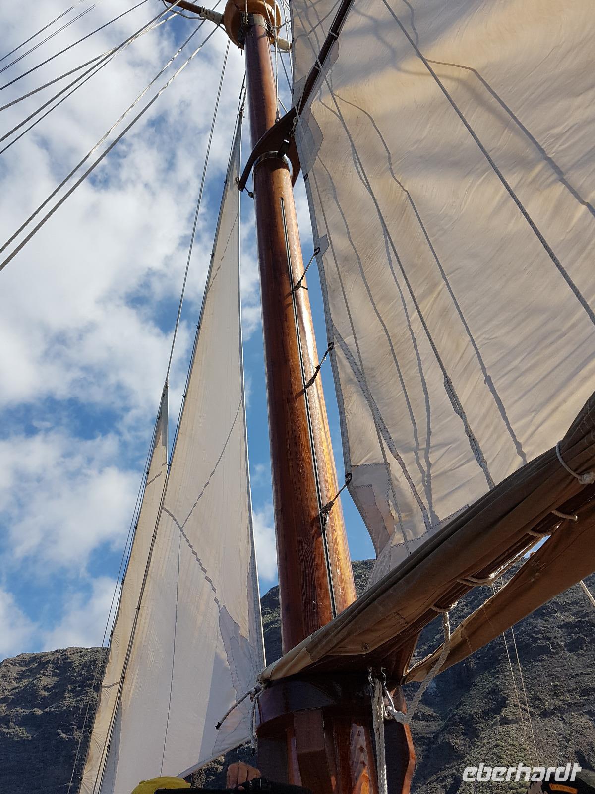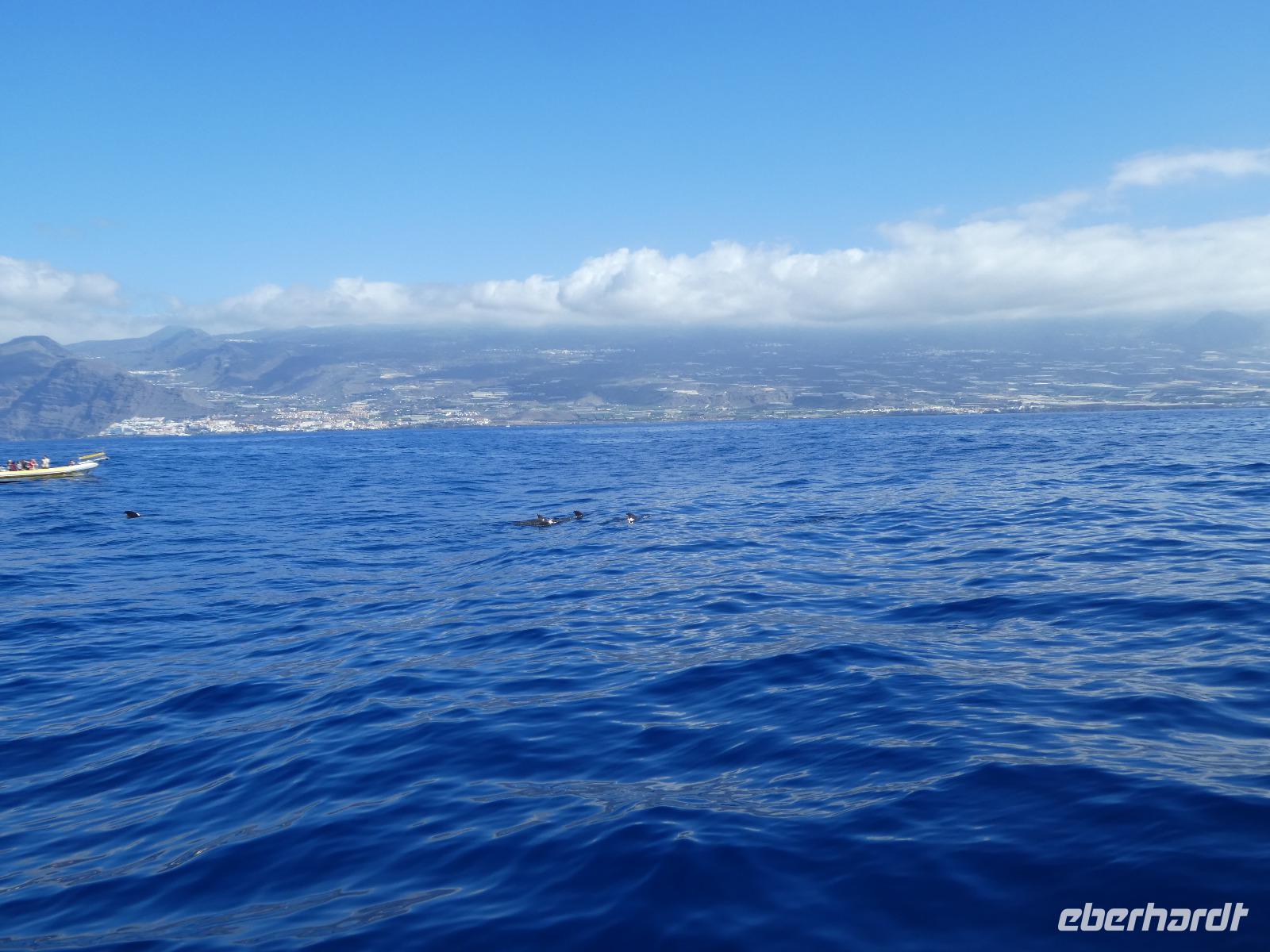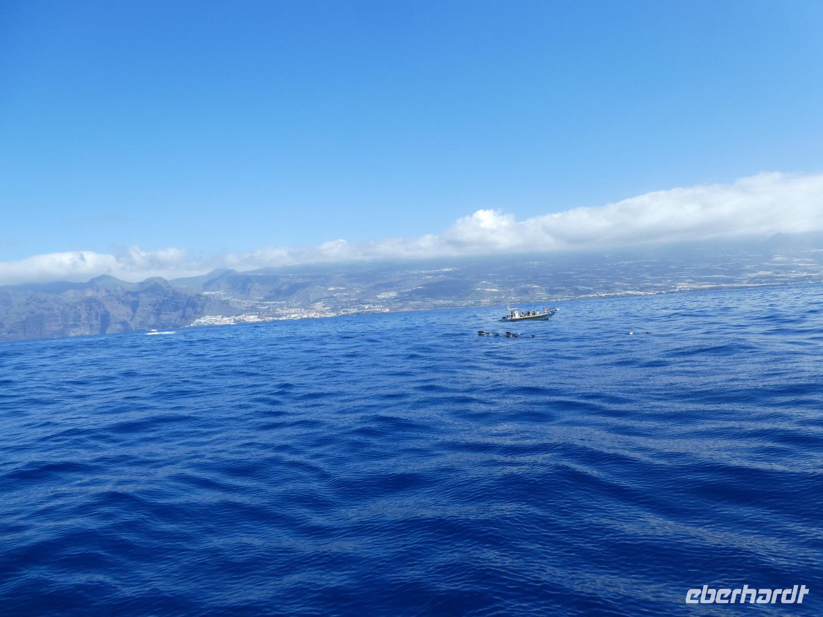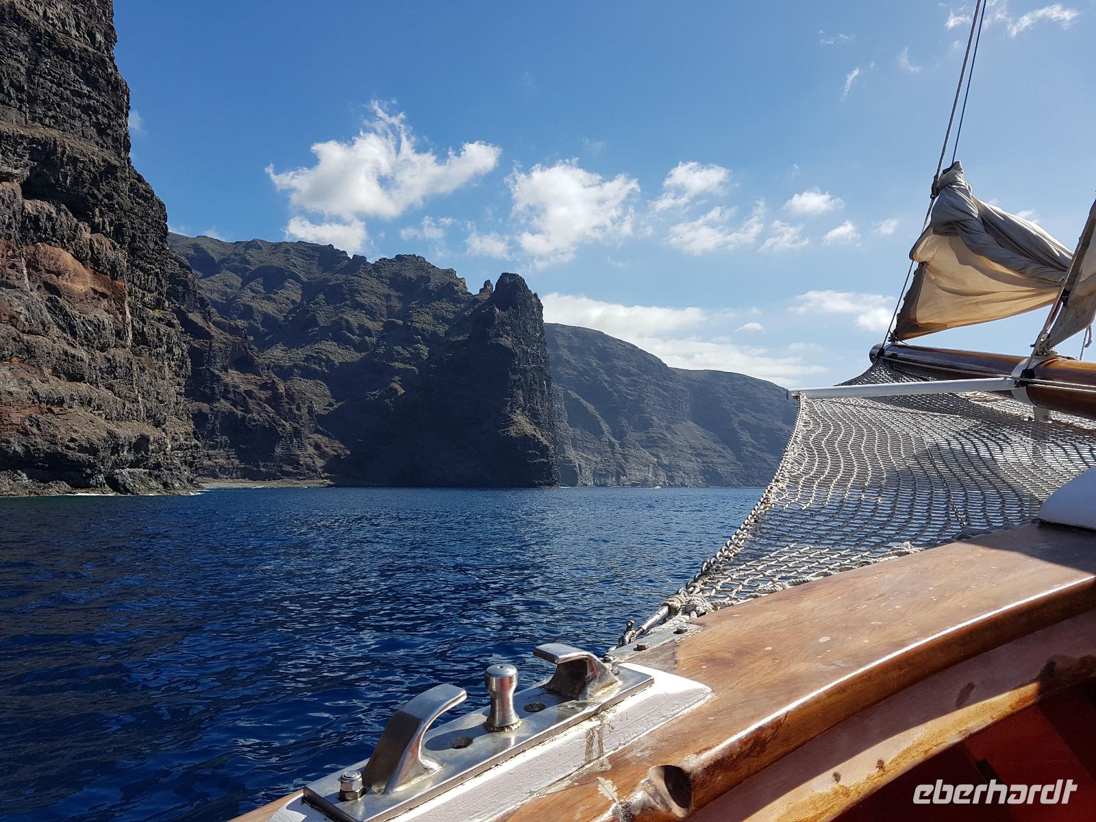 Nach dem Frühstück trafen wir Xandra, unsere örtliche Reiseleiterin und Jose, unseren Fahrer. Mit dem Bus fuhren wir entlang der Küste nach Icod de los Vinos und besuchten den Park mit dem ältesten Drachenbaum der Kanaren. Im Park gab es noch eine Höhle mit einer Mumie eines Guanchen, einen Dreschplatz und eine Köhlerei zu besichtigen. Auf der Weiterfahrt stoppten wir am Aussichtspunkt oberhalb von Garachico für eine Wohlfühlpause. Dann folgte eine kurvenreiche Strasse nach Santiago del Teide und weiter hinunter an die Steilküste von Los Gigantes. Wir gingen an Bord des Segelbootes Flipper UNO, die Segel wurden gesetzt und los ging unsere Fahrt immer entlang der Steilküste. Unterwegs konnten wir Grindwale ganz aus der Nähe beobachten. Die Crew versorgte uns mit Paella und Getränken. Ganz in der Nähe der Masca Schlucht ankerte dann unser Boot für eine Badepause. Über Treppen oder mit einem kühnen Sprung ging es in den Atlantik zum Schwimmen und wir waren positiv über die hohe Wassertemperatur überrascht. Wieder zurück in Los Gigantes spazierten wir zu unserem Bus.
