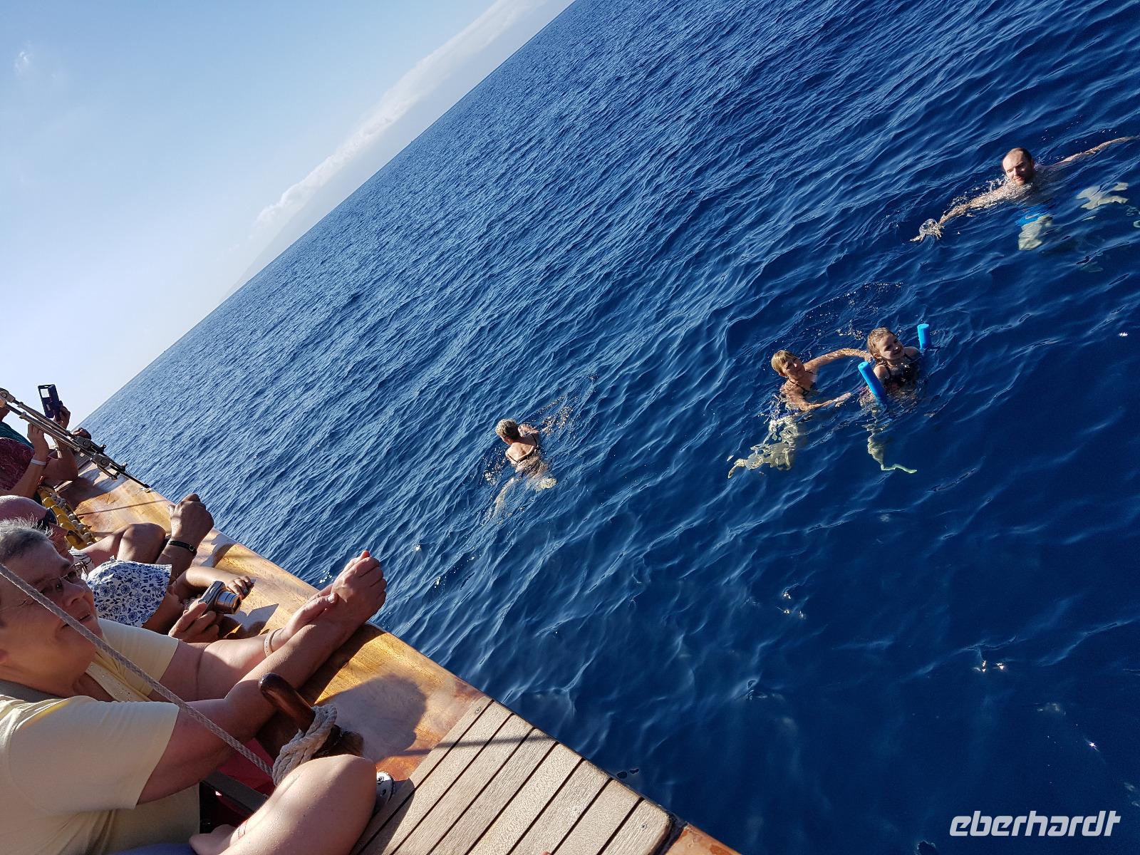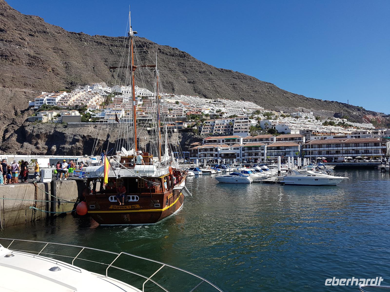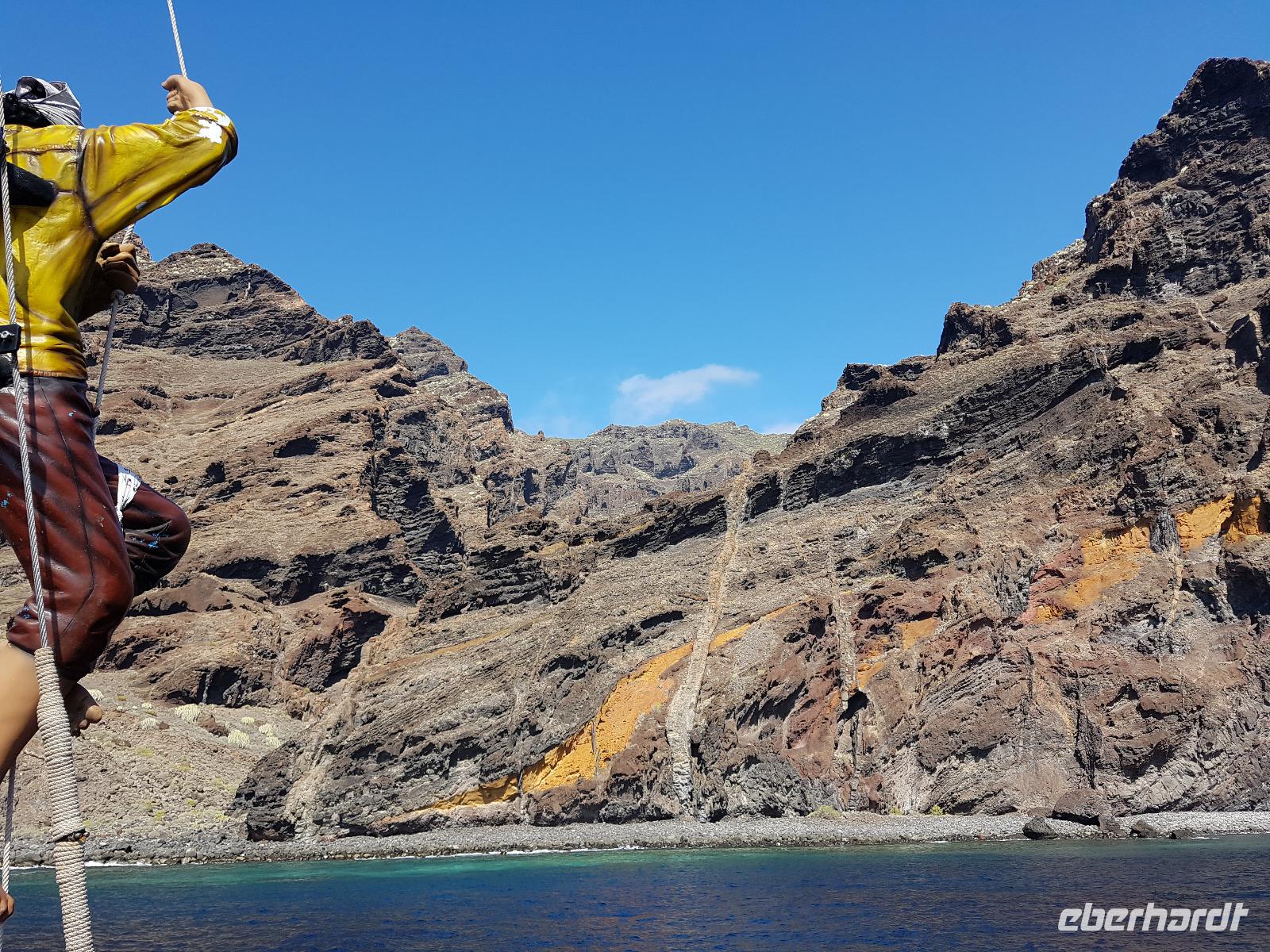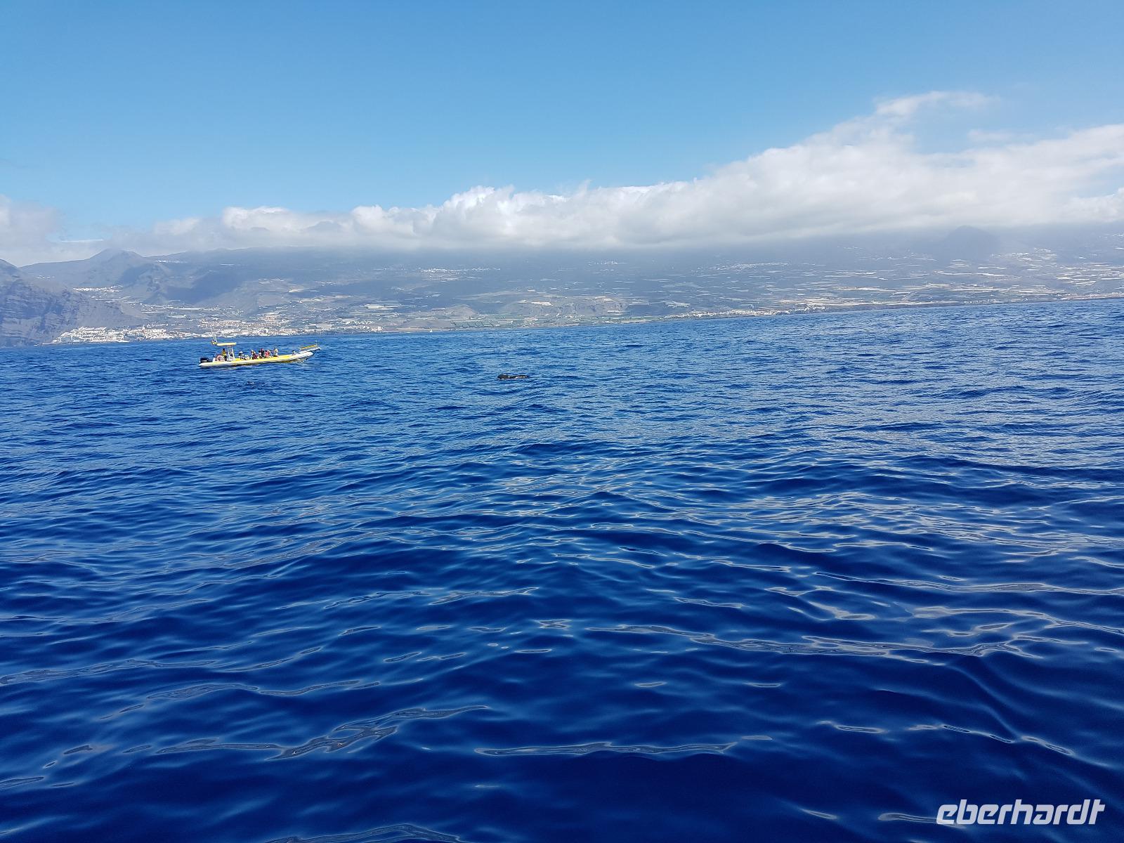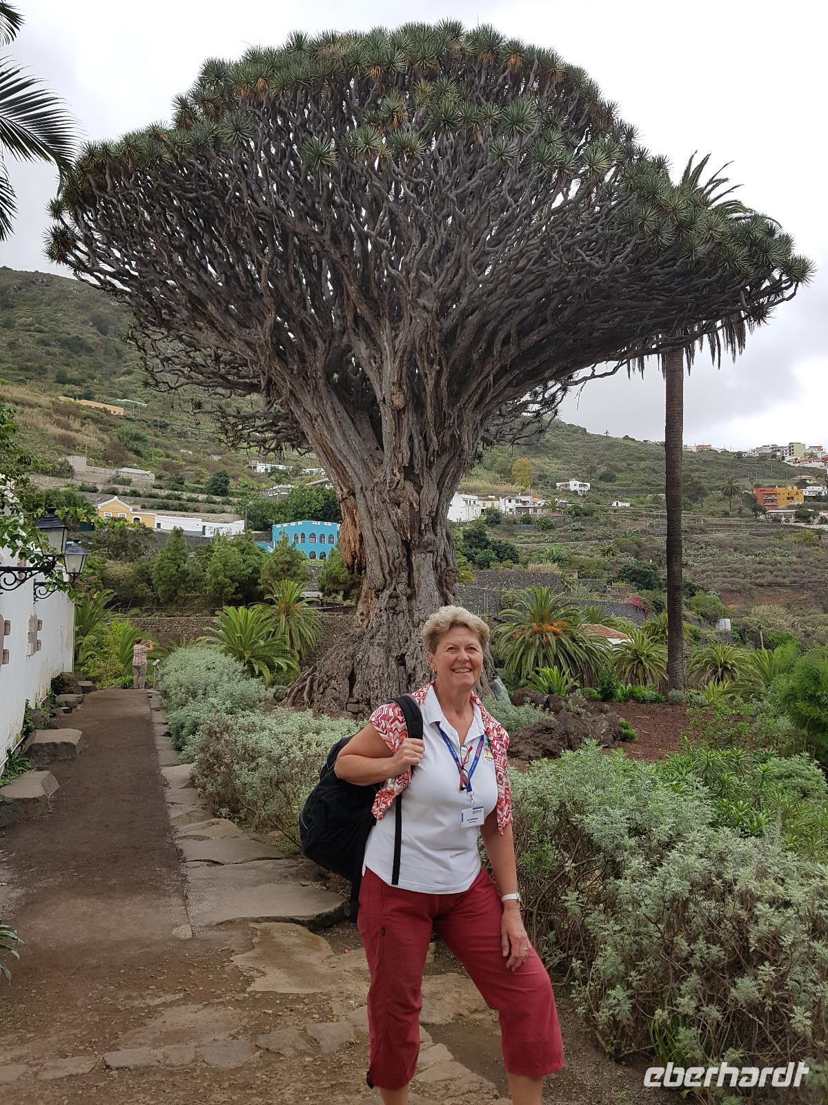 Nach dem Frühstück trafen wir Xandra, unsere örtliche Reiseleiterin und Jose, unseren Fahrer. Mit dem Bus fuhren wir entlang der Küste nach Icod de los Vinos und besuchten den Park mit dem ältesten Drachenbaum der Kanaren. Im Park gab es noch eine Höhle mit einer Mumie eines Guanchen, einen Dreschplatz und eine Köhlerei zu besichtigen. Auf der Weiterfahrt stoppten wir am Aussichtspunkt oberhalb von Garachico für eine Wohlfühlpause. Dann folgte eine kurvenreiche Strasse nach Santiago del Teide und weiter hinunter an die Steilküste von Los Gigantes. Wir gingen an Bord des Segelbootes Flipper UNO, die Segel wurden gesetzt und los ging unsere Fahrt immer entlang der Steilküste. Unterwegs konnten wir Grindwale ganz aus der Nähe beobachten. Die Crew versorgte uns mit Paella und Getränken. Ganz in der Nähe der Masca Schlucht ankerte dann unser Boot für eine Badepause. Über Treppen oder mit einem kühnen Sprung ging es in den Atlantik zum Schwimmen und wir waren positiv über die hohe Wassertemperatur überrascht. Wieder zurück in Los Gigantes spazierten wir zu unserem Bus.
