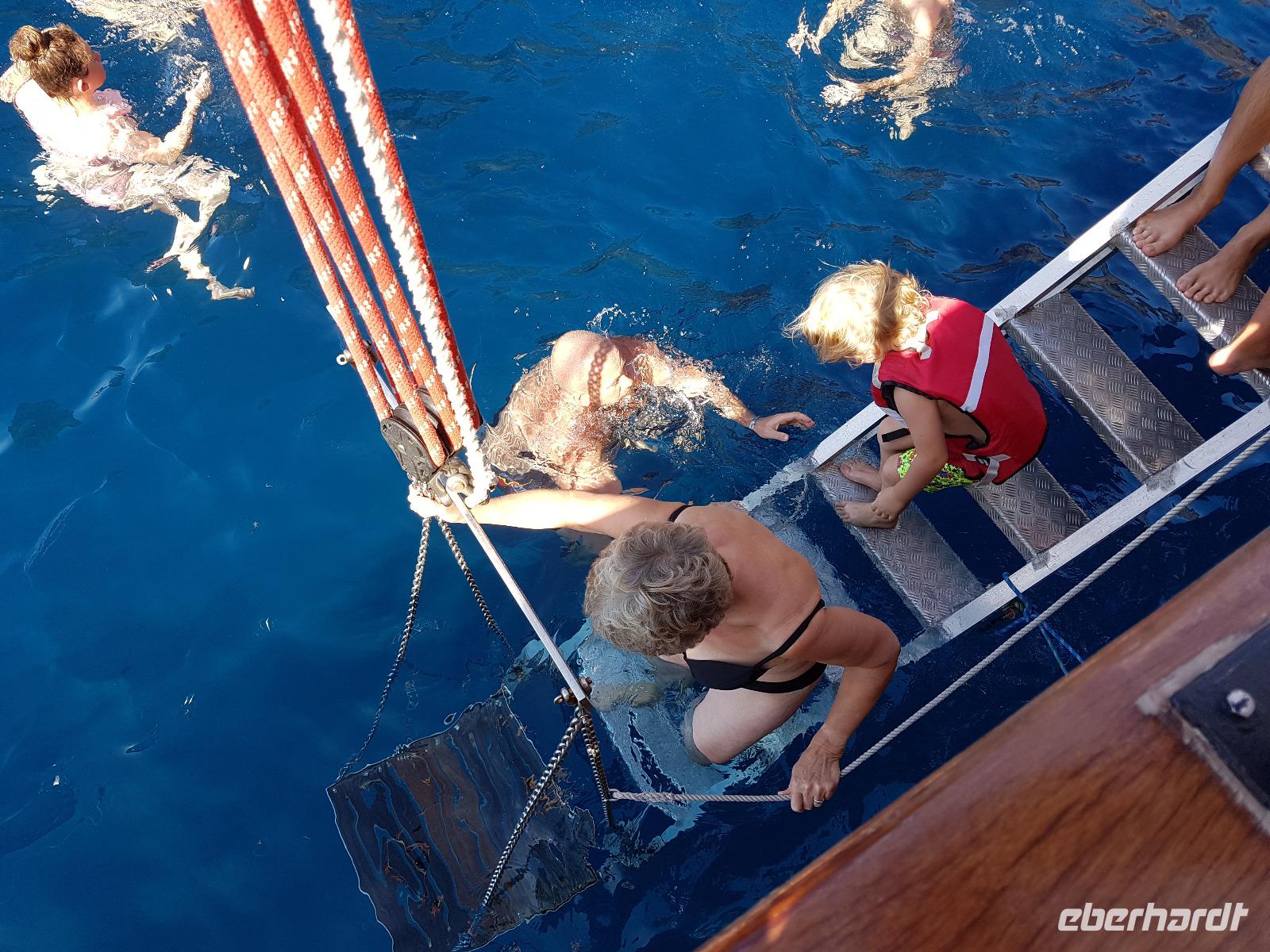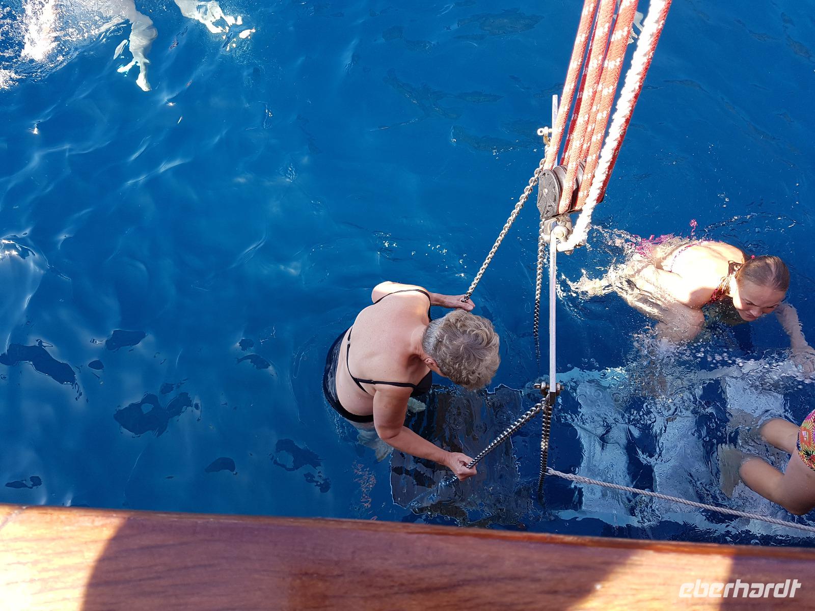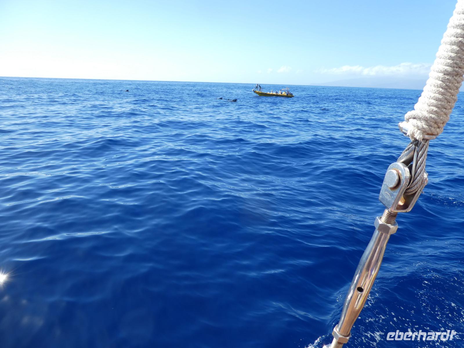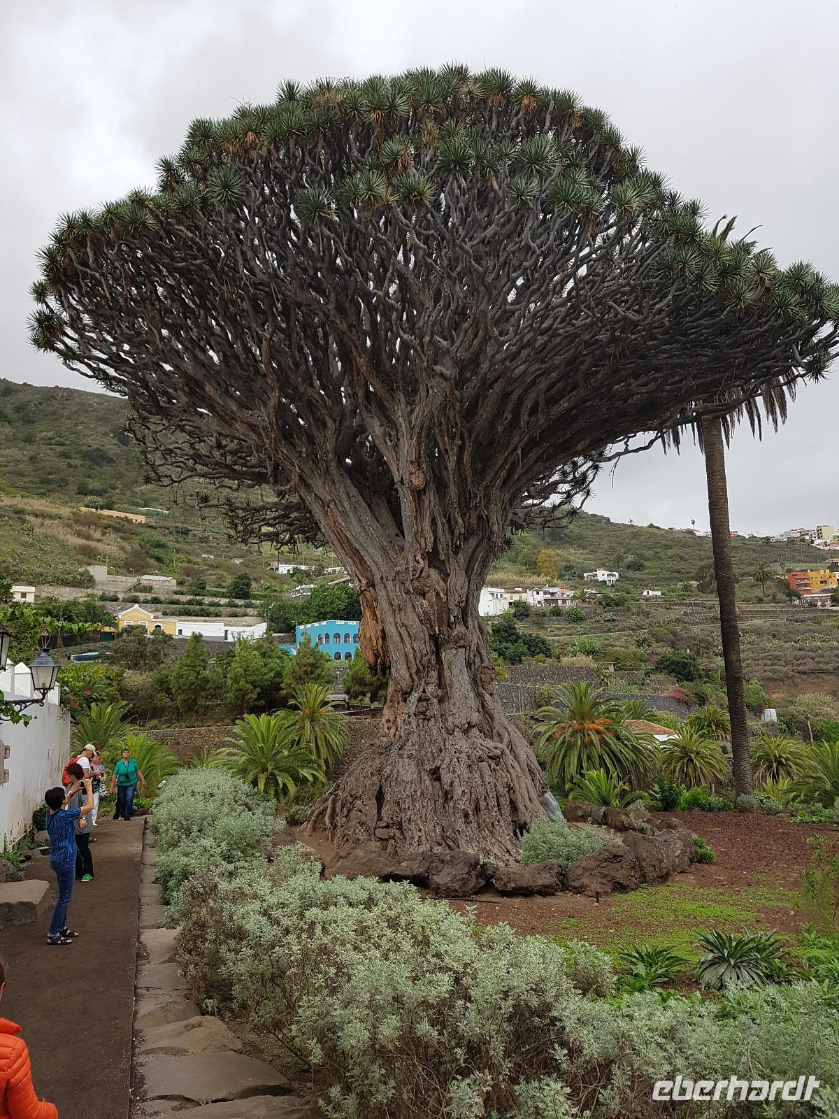 Nach dem Frühstück trafen wir Xandra, unsere örtliche Reiseleiterin und Jose, unseren Fahrer. Mit dem Bus fuhren wir entlang der Küste nach Icod de los Vinos und besuchten den Park mit dem ältesten Drachenbaum der Kanaren. Im Park gab es noch eine Höhle mit einer Mumie eines Guanchen, einen Dreschplatz und eine Köhlerei zu besichtigen. Auf der Weiterfahrt stoppten wir am Aussichtspunkt oberhalb von Garachico für eine Wohlfühlpause. Dann folgte eine kurvenreiche Strasse nach Santiago del Teide und weiter hinunter an die Steilküste von Los Gigantes. Wir gingen an Bord des Segelbootes Flipper UNO, die Segel wurden gesetzt und los ging unsere Fahrt immer entlang der Steilküste. Unterwegs konnten wir Grindwale ganz aus der Nähe beobachten. Die Crew versorgte uns mit Paella und Getränken. Ganz in der Nähe der Masca Schlucht ankerte dann unser Boot für eine Badepause. Über Treppen oder mit einem kühnen Sprung ging es in den Atlantik zum Schwimmen und wir waren positiv über die hohe Wassertemperatur überrascht. Wieder zurück in Los Gigantes spazierten wir zu unserem Bus.