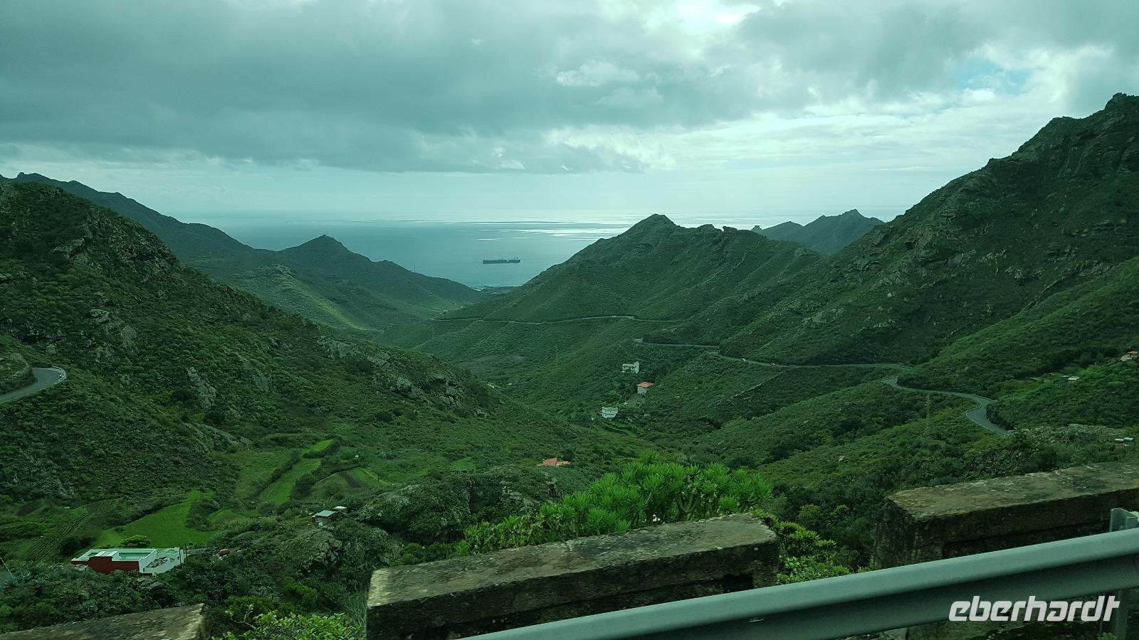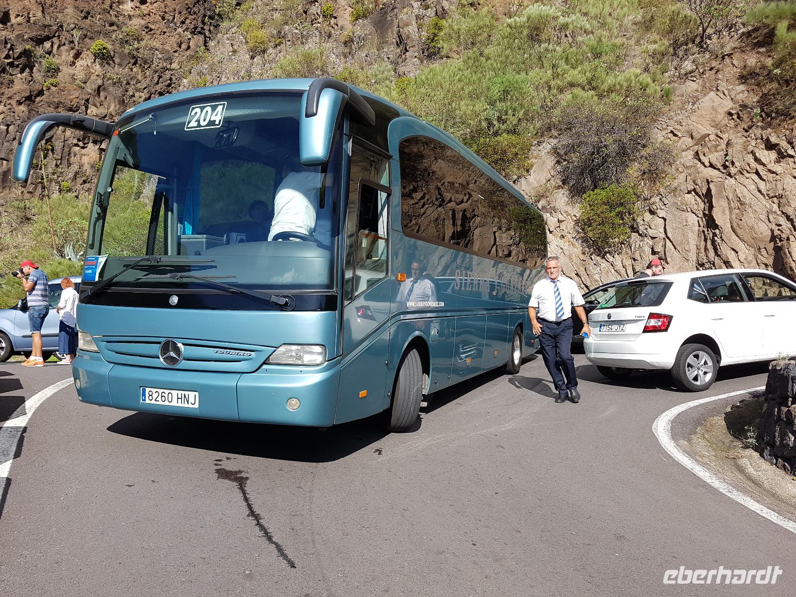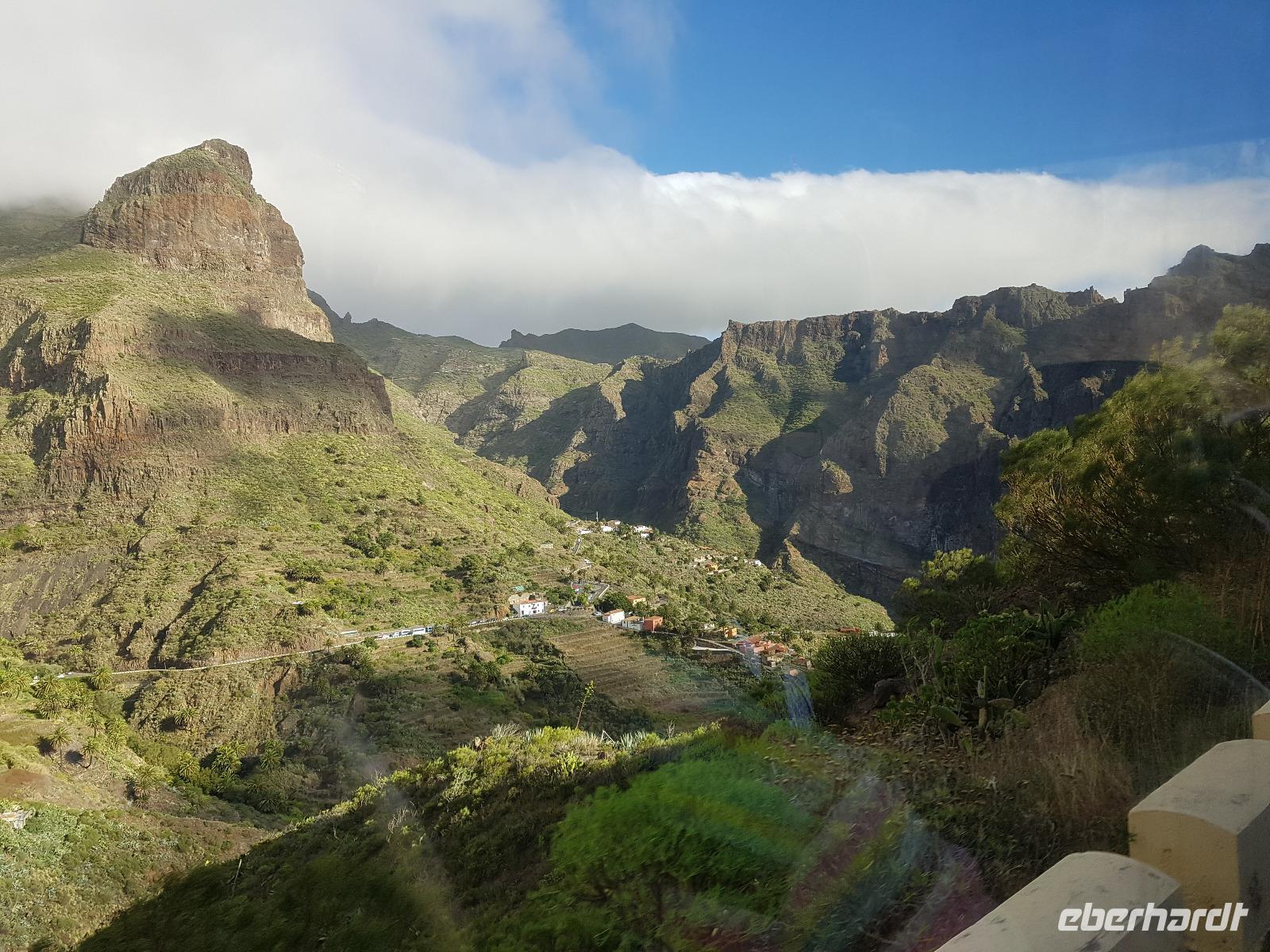 Die Fahrt ging wieder über zahlreiche Serpentinen hinauf zum Kamm des Tenogebirges und dann hinunter nach Masca. Für diese Strasse ist schon einiges fahrerisches Geschick gefragt und Angst sollte man auch nicht haben. Für unseren Fahrer Jose war das selbstverständlich, aber die vielen Urlauber in den Mietwagen hielten den Verkehr auf. In einer Kurve stiess dann auch noch ein Pkw mit unserem Bus zusammen und Jose war sehr verärgert. Schliesslich erreichten wir Masca und machten eine schöne Kaffepause. Der Ort ist Ausgangspunkt für die spektakuläre Wanderung durch die Masca Schlucht bis hinunter ans Meer. Leider musste der Weg gesperrt werden bis März wegen der Schäden vom letzten Unwetter im Oktober. Zurück nahmen wir die Strasse über den Las Portelas Pass hinunter nach Buenavista del Norte. Von dort folgten wir der Küstenstrasse über Garachico zurück zum Hotel.