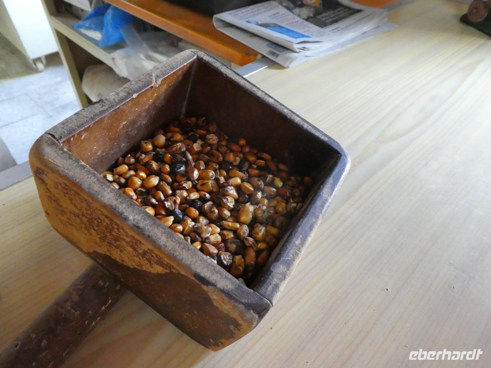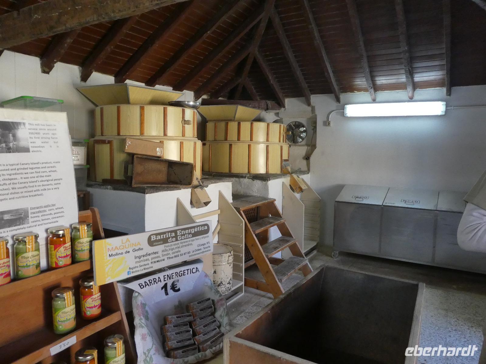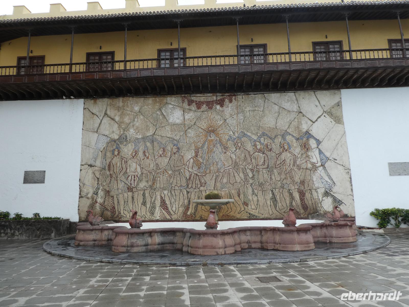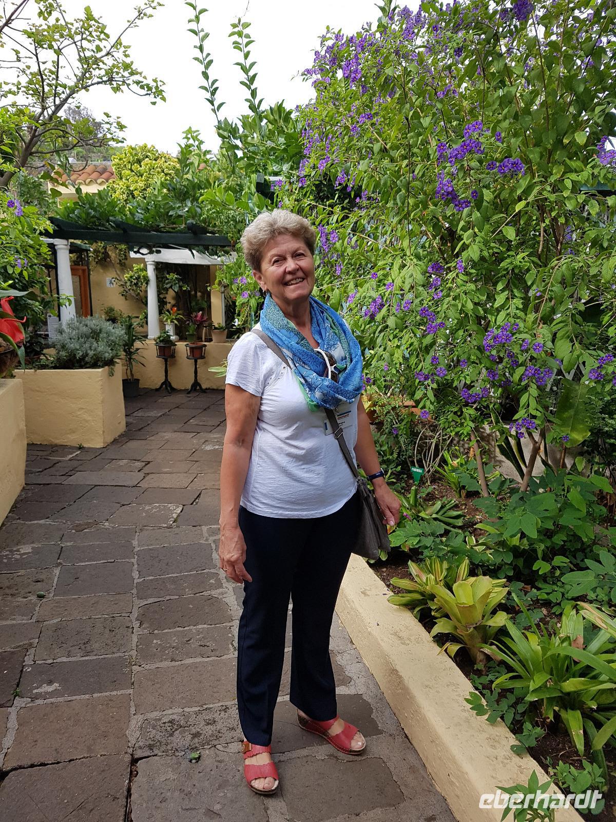 Heute fuhren wir nach La Orotava, in den Ort oberhalb von Puerto de la Cruz. Wir begannen unsere Besichtigung mit dem Botanischen Garten, gingen dann hinunter zum Rathaus und sahen dort die wertvollen Wandteppiche und dann steil bergan zum Volkskunde Museum in der Casa de los Balcones. Das Haus stammt aus dem Jahr 1632 und hat einen wunderschönen Innenhof mit Holzbalkonen. Im ersten Stock sind einige möblierte Zimmer zu sehen und im Erdgeschoss ist das Stickereimuseum untergebracht. Dort erklärte uns Xandra die mühevolle Arbeit der kanarischen Stickerei. Im HAUS gegenüber waren kunstvolle Sandgemählde zu bewundern und von der Terrasse hatte man einen fantastischen Blick hinunter nach Puerto de la Cruz und zum Atlantik. Wieder ein Spaziergang durch Gassen und wir erreichten eine alte Gofiomühle, die noch in Betrieb war. Dort konnten wir das Urgetreide begutachten und ich kaufte für jeden einen Gofioriegel zum Probieren. Das Getreide der Guanchen ist heute wieder in Mode gekommen und gilt als Sättigungsbeilage, süss oder herzhaft zubereitet. Ein kleines Stück auf einem alten Ziegenpfad spazierten wir zu unserem Bus zurück.