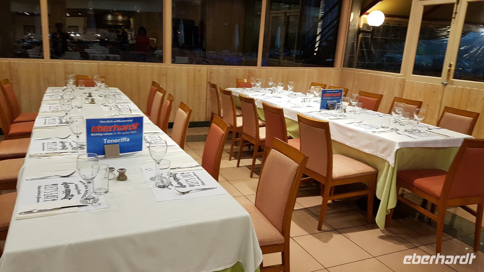 Kurz vor dem Abendessen erreichte dann die letzte Teilnehmerin aus Nürnberg kommend das Hotel und so konnten wir unser erstes gemeinsames Abendessen an 2 für unsere Gruppe reservierten Tischen geniessen. Wein und Wasser waren inclusive und das umfangreiche Buffet mussten wir erst einmal erkunden. Nach dem Essen richtete sich jeder in seinem Zimmer ein und einige trafen sich danach noch in der Bar.