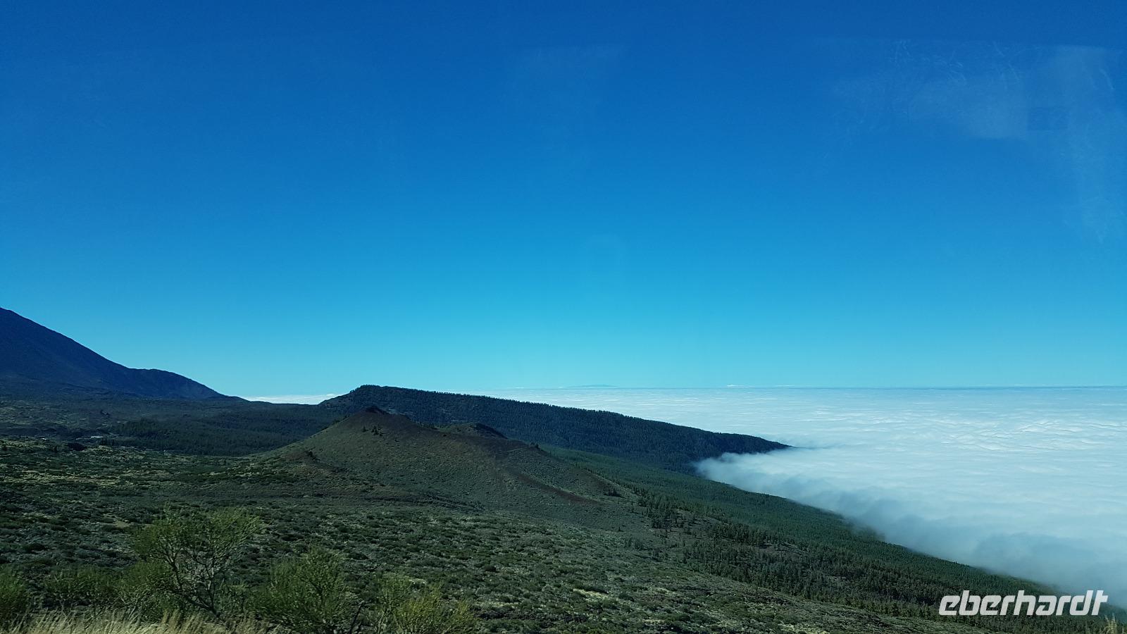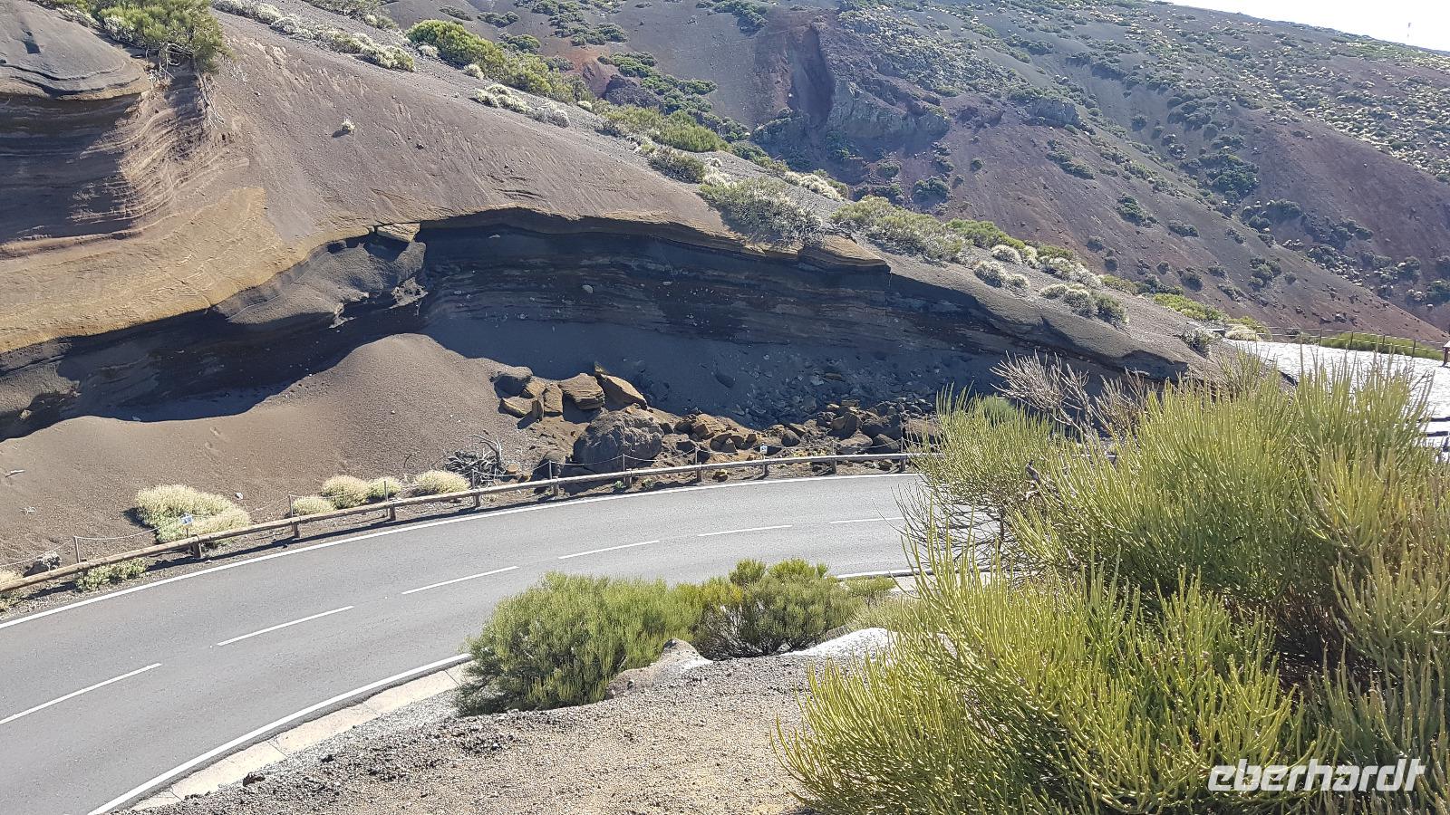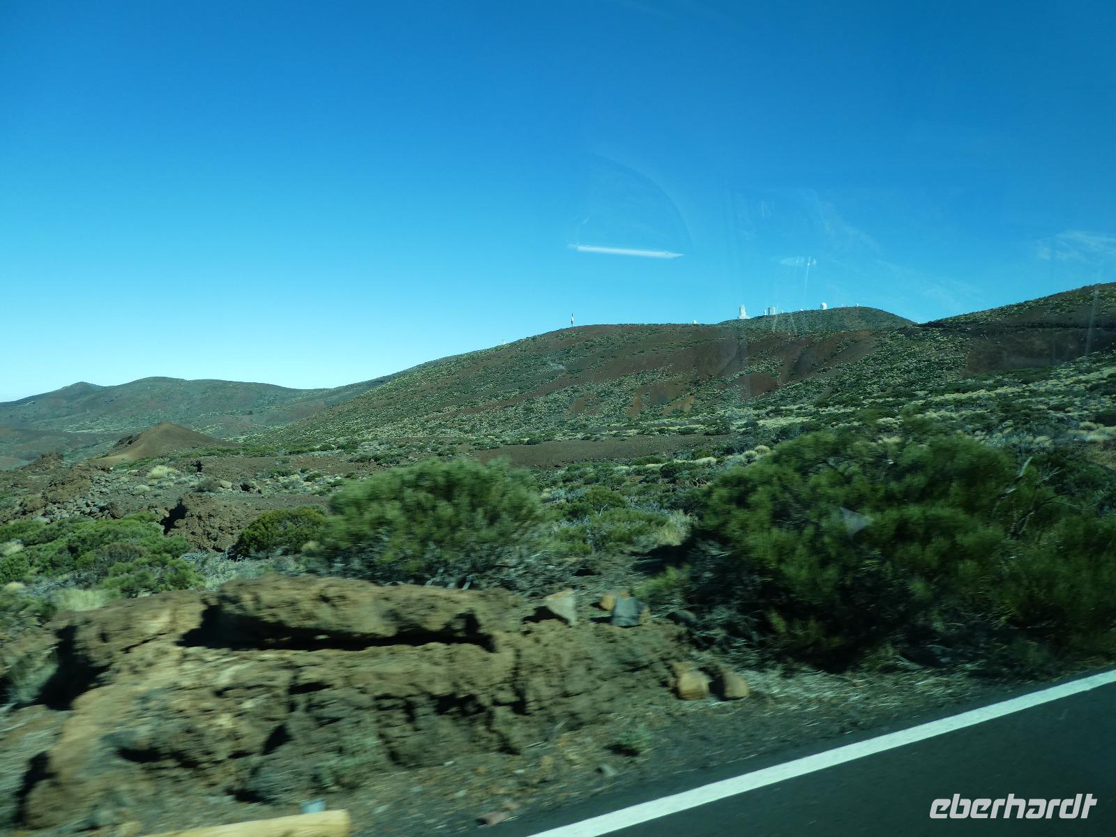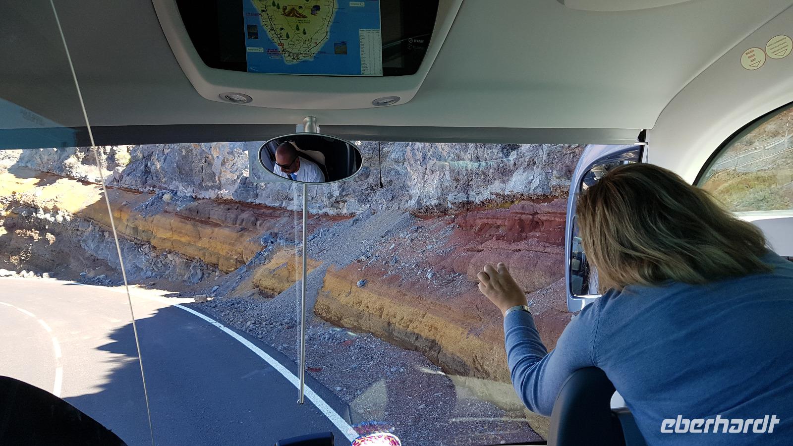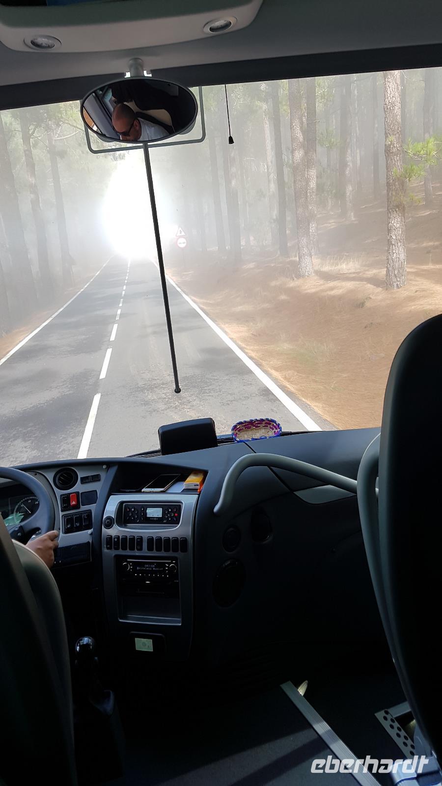 Nun fuhren wir in grossen Serpentinen ständig bergan. In einer Höhe von 1000 bis ca. 1900 Meter Höhe wächst die kanarische Kiefer mit ihren extrem langen Nadeln. Sie nimmt das benötigte Wasser von den Passatwolken, die sich in dieser Höhe ständig halten. Über der Baumgrenze erreichten wir die riesige Caldera und auf fast 2200 m Höhe stärkten wir uns bei einem kleinen Imbiss im La Bambi auf der Terrasse und mit Blick zum Teide. Es war erstaunlich warm in der Sonne trotz der grossen Höhe. Dann fuhren wir weiter durch den Nationalpark auf der einzigen Strasse. In der Nähe des Paradors verliessen wir den Bus, um Fotos vom Los Roques, auch Daumen Gottes genannt, und dem Teide zu machen. Gerne wären wir an diesem magischen Ort in der Sonne noch länger geblieben, aber das Programm hatte noch viel zu bieten an unserem letzten Ausflugstag. Auf gleicher Strasse fuhren wir zurück und dann weiter direkt auf dem Kamm in Richtung der Observatorien. Die gehören weltweit zu den 4 wichtigsten. Wegen des klaren Himmels und der Höhe können 83 Konstellation von Himmelskörpern im Jahr beobachtet werden. Am Strassenrand waren sehr gut die einzelnen farbigen Gesteinsschichten auszumachen und bei einem kurzen Fotostopp auch im Bild festzuhalten. Durch den Esperanzawald im Nebel fuhren wir dann stetig bergab und erreichten beim Flughafen Teneriffa Nord die Ebene von La Laguna.