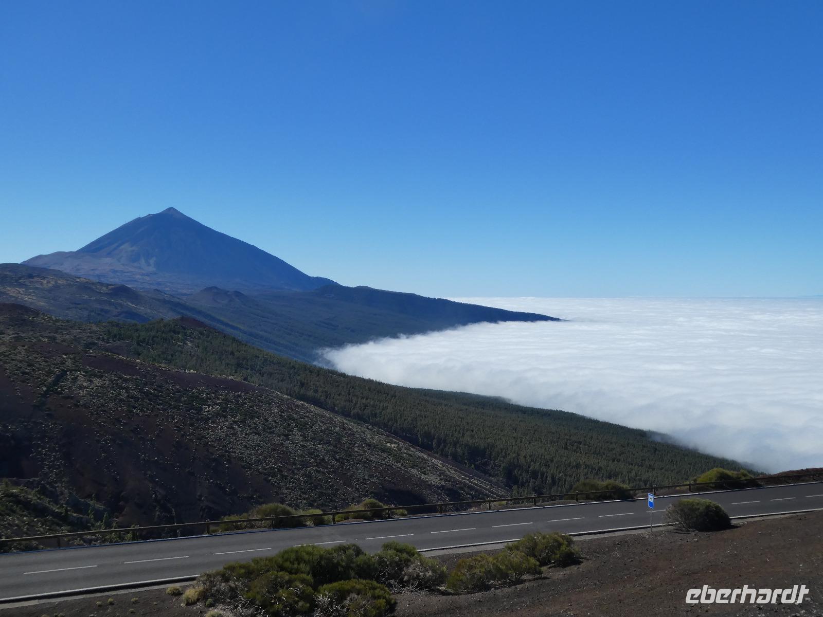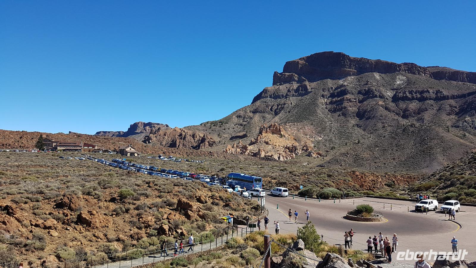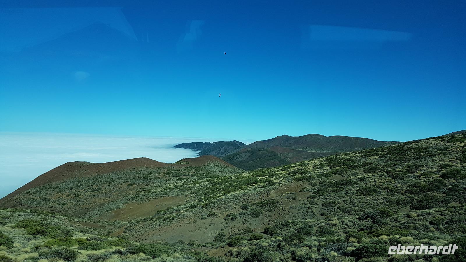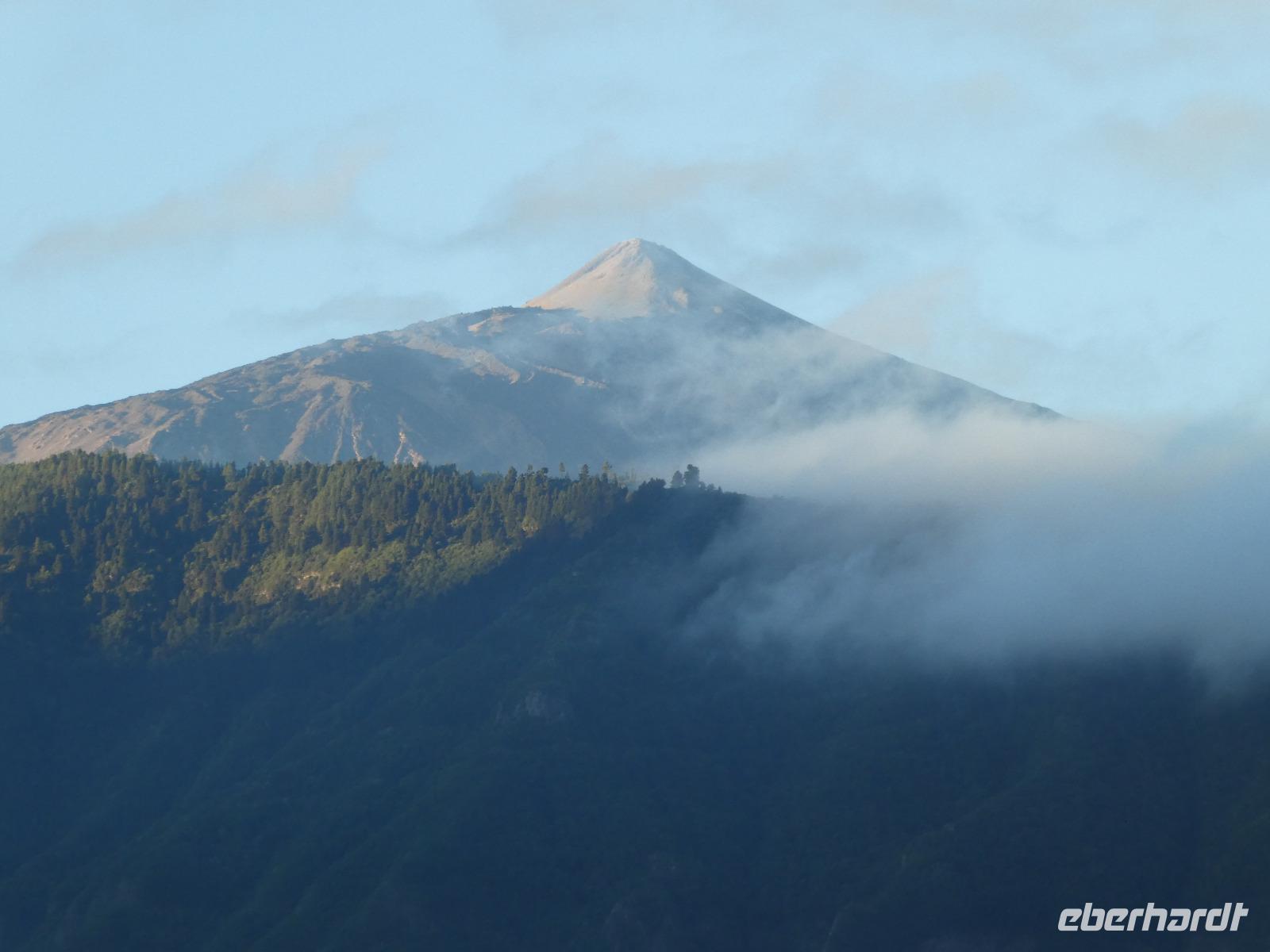 Nun fuhren wir in grossen Serpentinen ständig bergan. In einer Höhe von 1000 bis ca. 1900 Meter Höhe wächst die kanarische Kiefer mit ihren extrem langen Nadeln. Sie nimmt das benötigte Wasser von den Passatwolken, die sich in dieser Höhe ständig halten. Über der Baumgrenze erreichten wir die riesige Caldera und auf fast 2200 m Höhe stärkten wir uns bei einem kleinen Imbiss im La Bambi auf der Terrasse und mit Blick zum Teide. Es war erstaunlich warm in der Sonne trotz der grossen Höhe. Dann fuhren wir weiter durch den Nationalpark auf der einzigen Strasse. In der Nähe des Paradors verliessen wir den Bus, um Fotos vom Los Roques, auch Daumen Gottes genannt, und dem Teide zu machen. Gerne wären wir an diesem magischen Ort in der Sonne noch länger geblieben, aber das Programm hatte noch viel zu bieten an unserem letzten Ausflugstag. Auf gleicher Strasse fuhren wir zurück und dann weiter direkt auf dem Kamm in Richtung der Observatorien. Die gehören weltweit zu den 4 wichtigsten. Wegen des klaren Himmels und der Höhe können 83 Konstellation von Himmelskörpern im Jahr beobachtet werden. Am Strassenrand waren sehr gut die einzelnen farbigen Gesteinsschichten auszumachen und bei einem kurzen Fotostopp auch im Bild festzuhalten. Durch den Esperanzawald im Nebel fuhren wir dann stetig bergab und erreichten beim Flughafen Teneriffa Nord die Ebene von La Laguna.