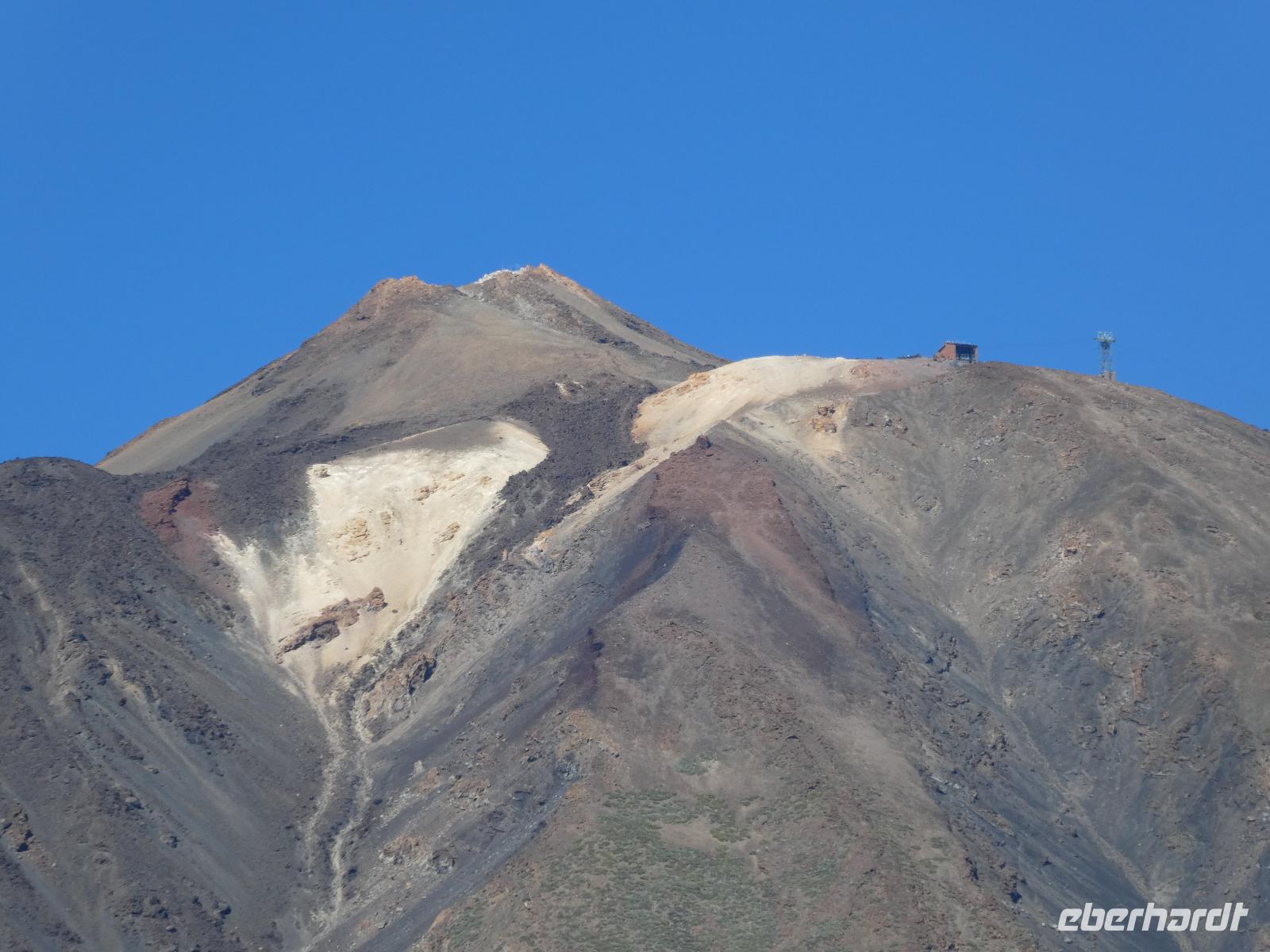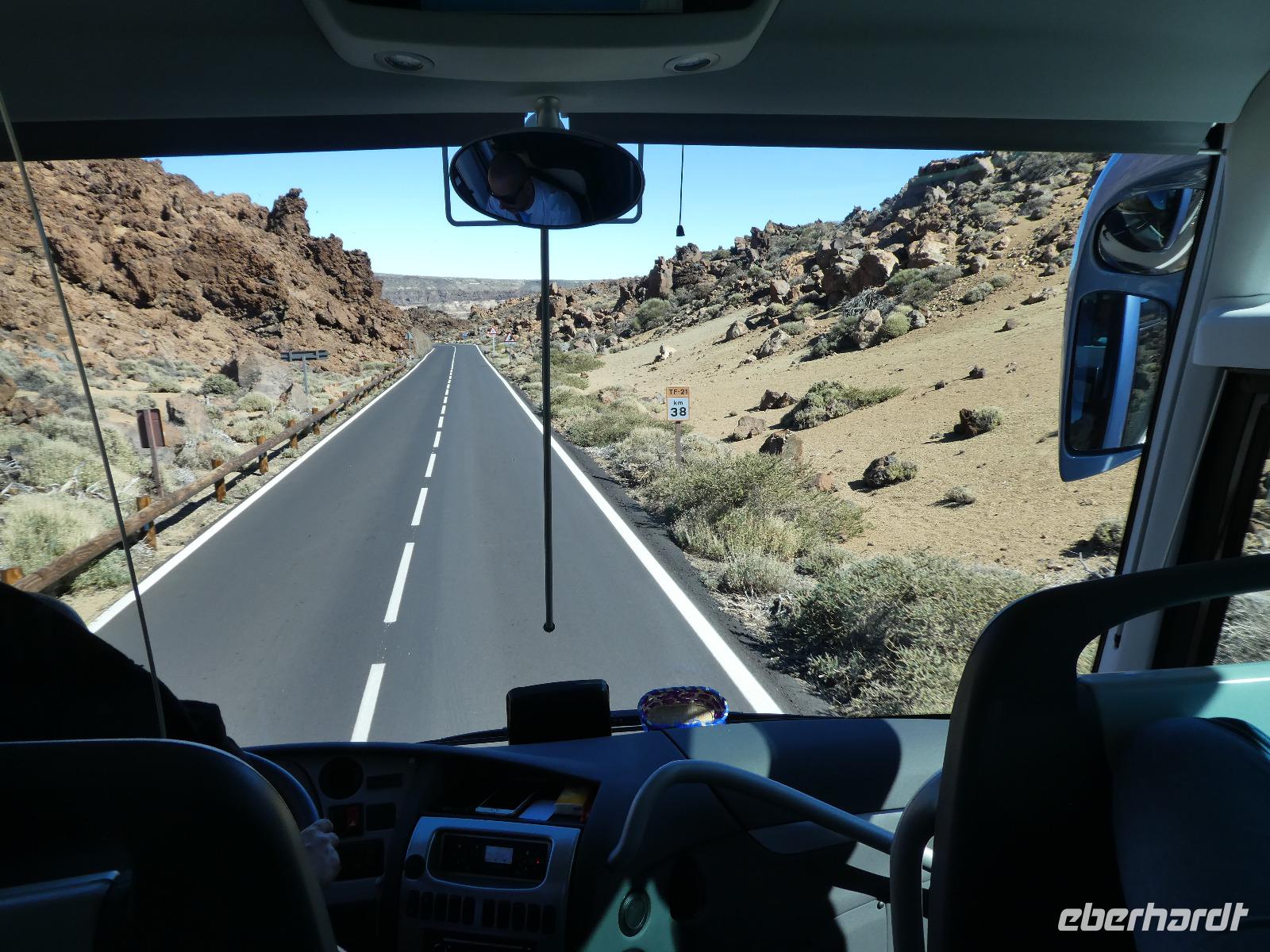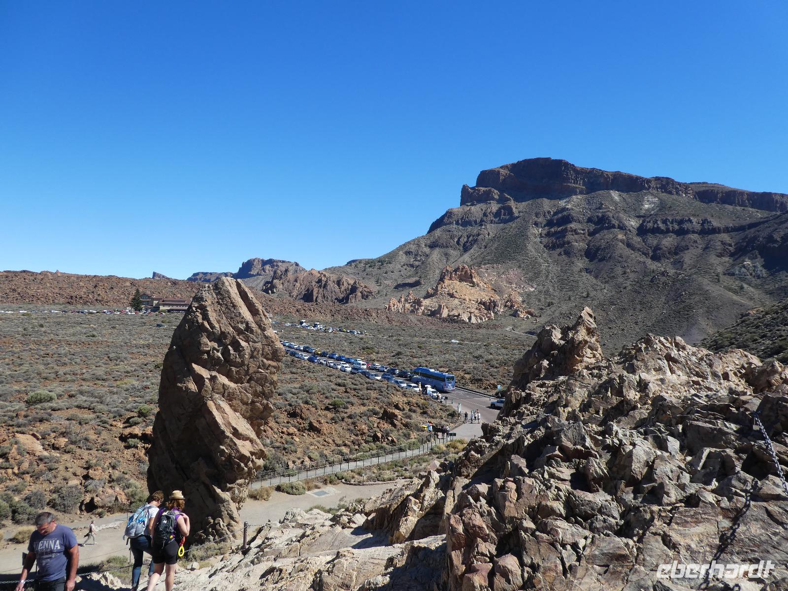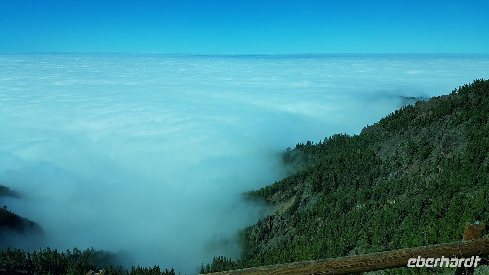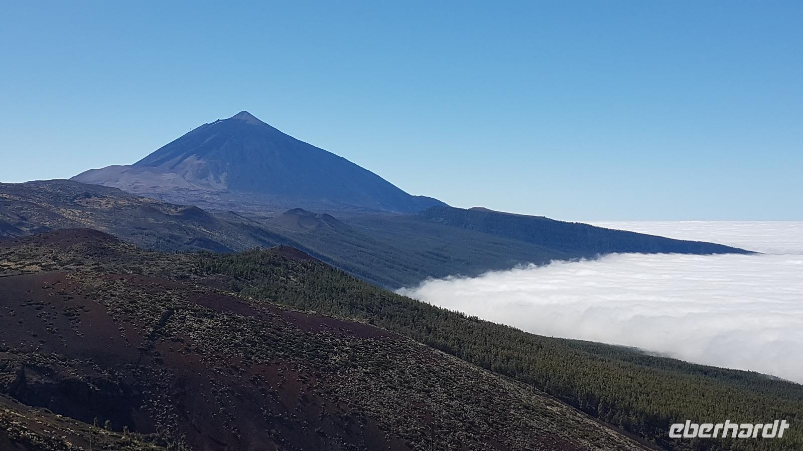 Nun fuhren wir in grossen Serpentinen ständig bergan. In einer Höhe von 1000 bis ca. 1900 Meter Höhe wächst die kanarische Kiefer mit ihren extrem langen Nadeln. Sie nimmt das benötigte Wasser von den Passatwolken, die sich in dieser Höhe ständig halten. Über der Baumgrenze erreichten wir die riesige Caldera und auf fast 2200 m Höhe stärkten wir uns bei einem kleinen Imbiss im La Bambi auf der Terrasse und mit Blick zum Teide. Es war erstaunlich warm in der Sonne trotz der grossen Höhe. Dann fuhren wir weiter durch den Nationalpark auf der einzigen Strasse. In der Nähe des Paradors verliessen wir den Bus, um Fotos vom Los Roques, auch Daumen Gottes genannt, und dem Teide zu machen. Gerne wären wir an diesem magischen Ort in der Sonne noch länger geblieben, aber das Programm hatte noch viel zu bieten an unserem letzten Ausflugstag. Auf gleicher Strasse fuhren wir zurück und dann weiter direkt auf dem Kamm in Richtung der Observatorien. Die gehören weltweit zu den 4 wichtigsten. Wegen des klaren Himmels und der Höhe können 83 Konstellation von Himmelskörpern im Jahr beobachtet werden. Am Strassenrand waren sehr gut die einzelnen farbigen Gesteinsschichten auszumachen und bei einem kurzen Fotostopp auch im Bild festzuhalten. Durch den Esperanzawald im Nebel fuhren wir dann stetig bergab und erreichten beim Flughafen Teneriffa Nord die Ebene von La Laguna.