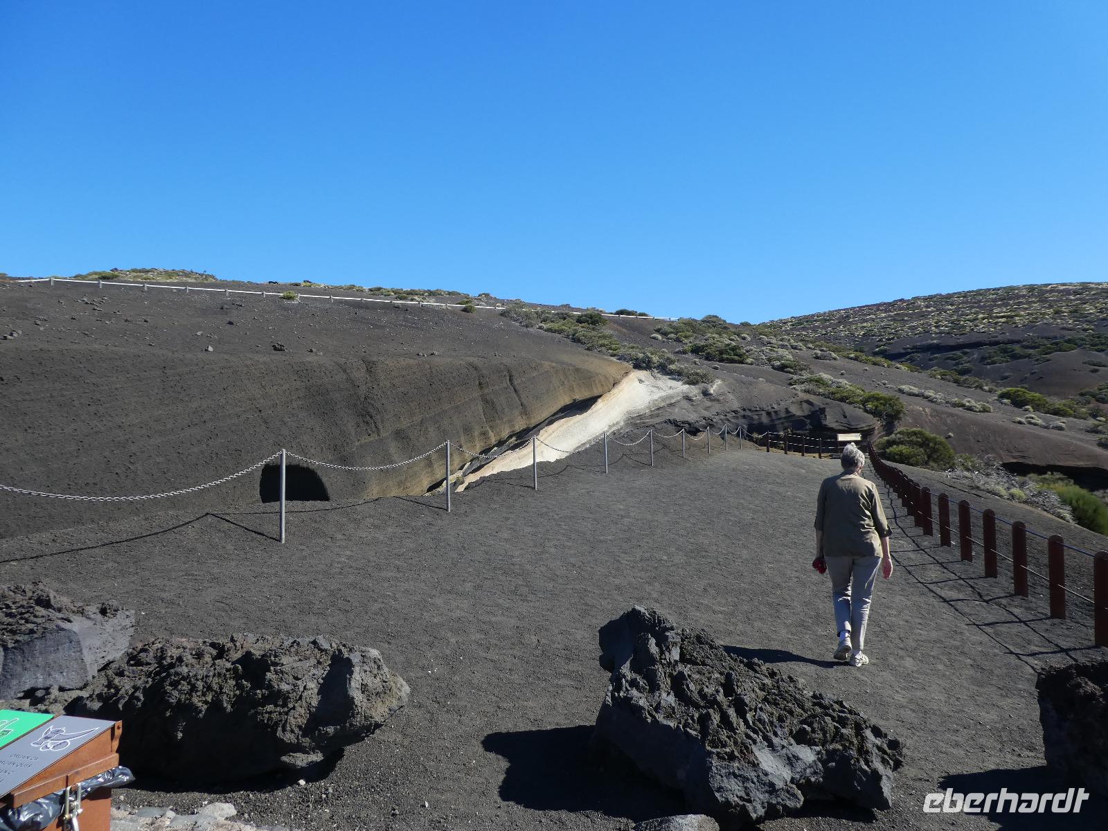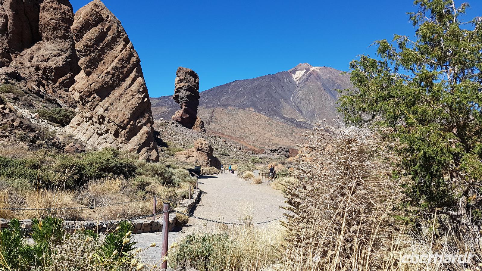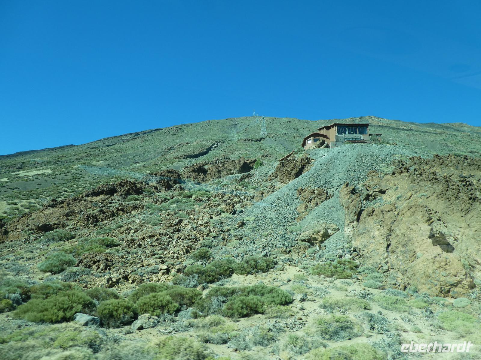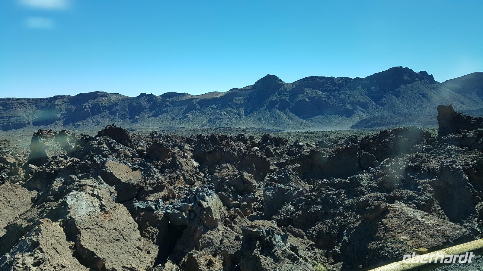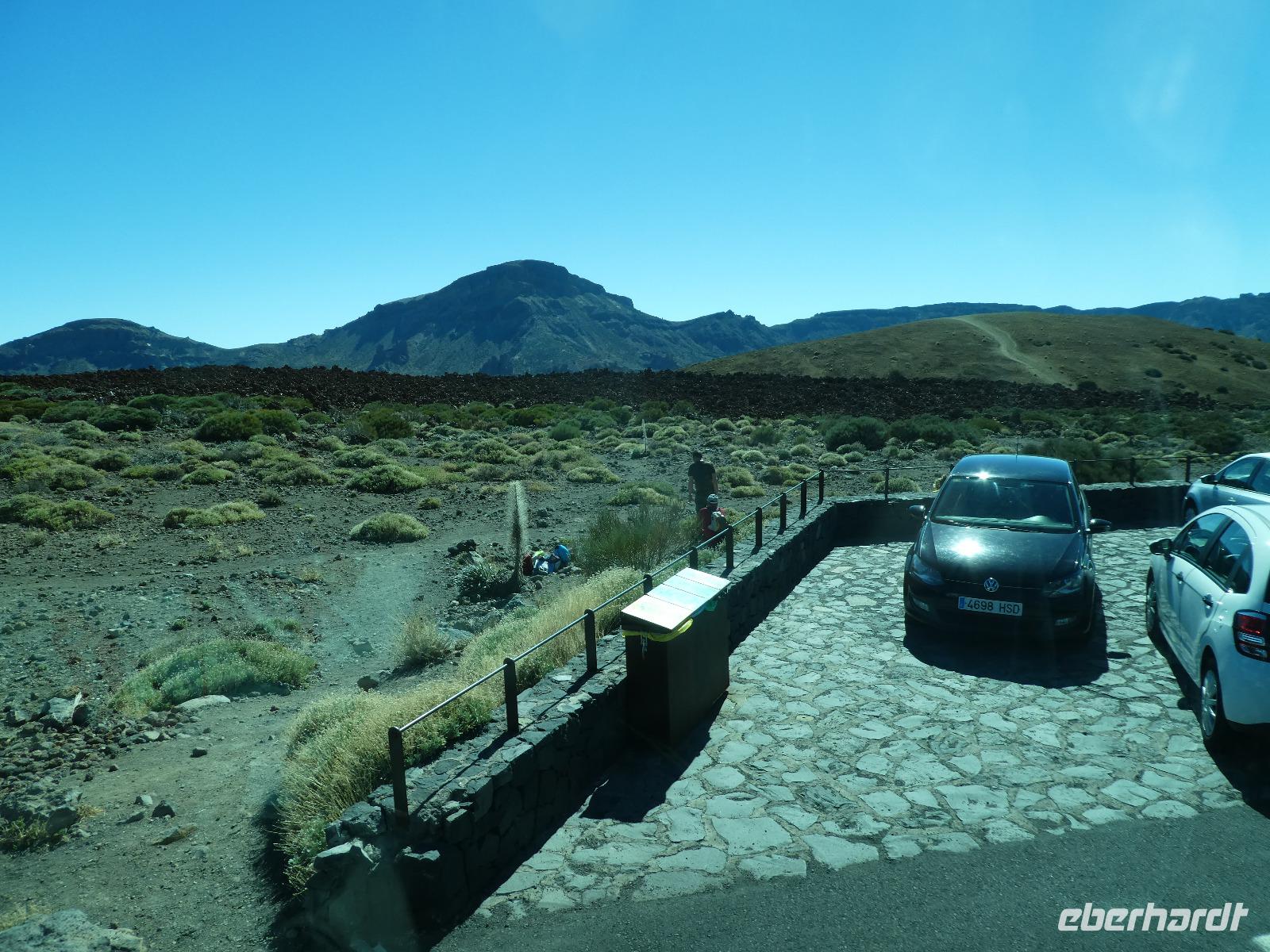 Nun fuhren wir in grossen Serpentinen ständig bergan. In einer Höhe von 1000 bis ca. 1900 Meter Höhe wächst die kanarische Kiefer mit ihren extrem langen Nadeln. Sie nimmt das benötigte Wasser von den Passatwolken, die sich in dieser Höhe ständig halten. Über der Baumgrenze erreichten wir die riesige Caldera und auf fast 2200 m Höhe stärkten wir uns bei einem kleinen Imbiss im La Bambi auf der Terrasse und mit Blick zum Teide. Es war erstaunlich warm in der Sonne trotz der grossen Höhe. Dann fuhren wir weiter durch den Nationalpark auf der einzigen Strasse. In der Nähe des Paradors verliessen wir den Bus, um Fotos vom Los Roques, auch Daumen Gottes genannt, und dem Teide zu machen. Gerne wären wir an diesem magischen Ort in der Sonne noch länger geblieben, aber das Programm hatte noch viel zu bieten an unserem letzten Ausflugstag. Auf gleicher Strasse fuhren wir zurück und dann weiter direkt auf dem Kamm in Richtung der Observatorien. Die gehören weltweit zu den 4 wichtigsten. Wegen des klaren Himmels und der Höhe können 83 Konstellation von Himmelskörpern im Jahr beobachtet werden. Am Strassenrand waren sehr gut die einzelnen farbigen Gesteinsschichten auszumachen und bei einem kurzen Fotostopp auch im Bild festzuhalten. Durch den Esperanzawald im Nebel fuhren wir dann stetig bergab und erreichten beim Flughafen Teneriffa Nord die Ebene von La Laguna.