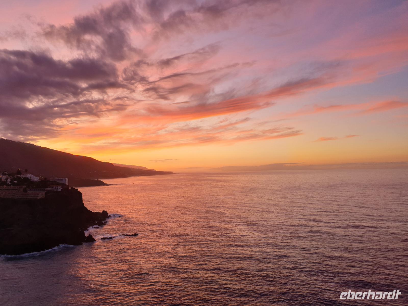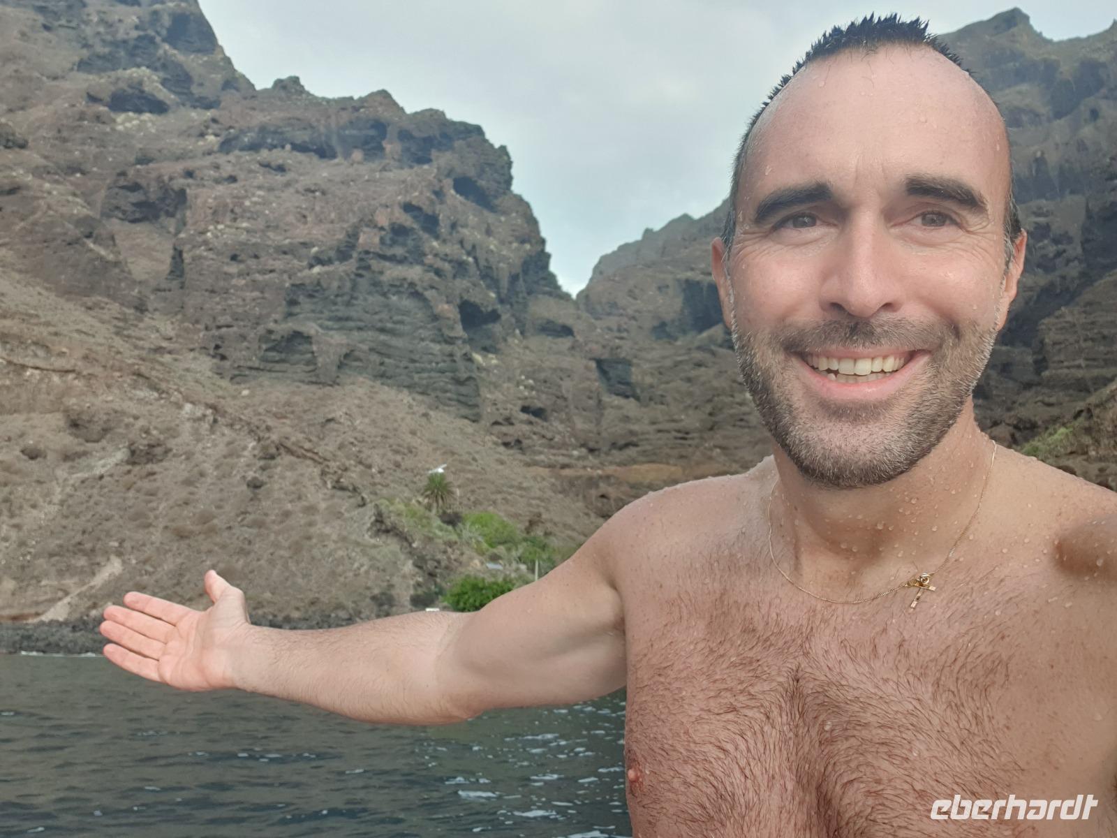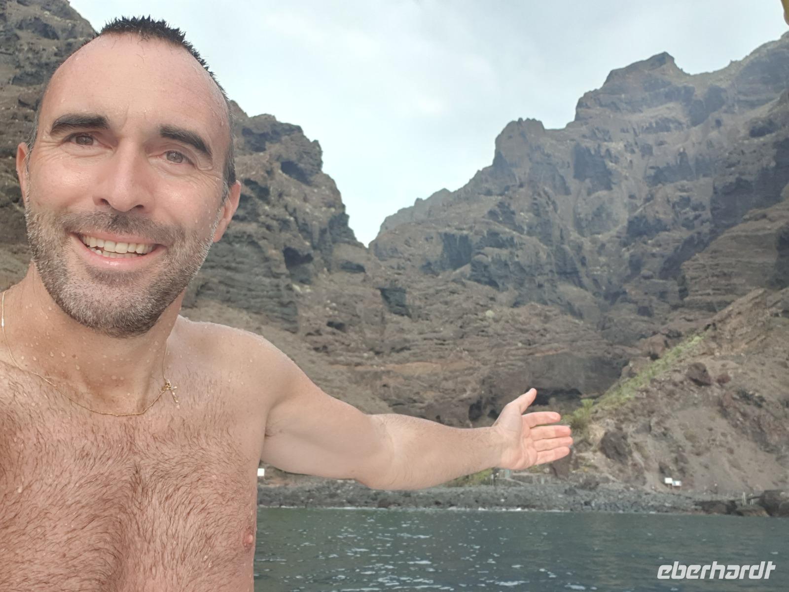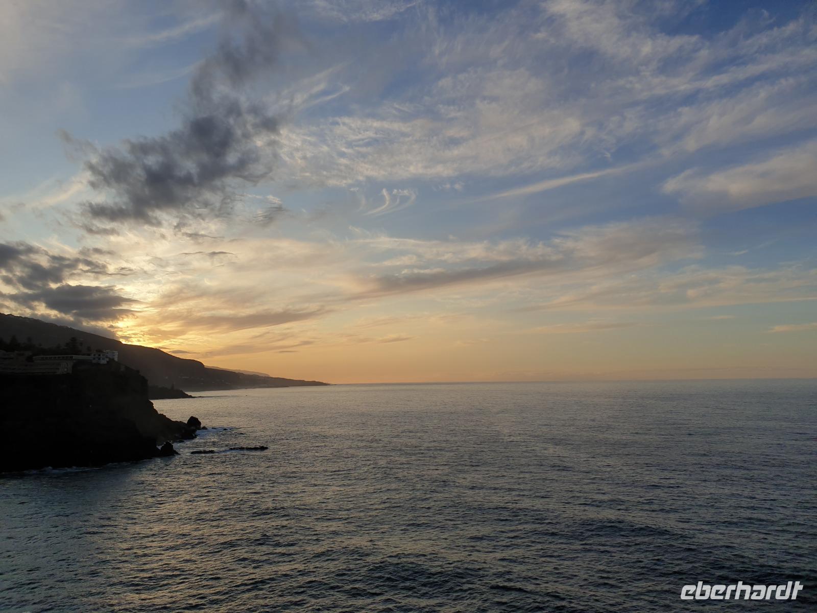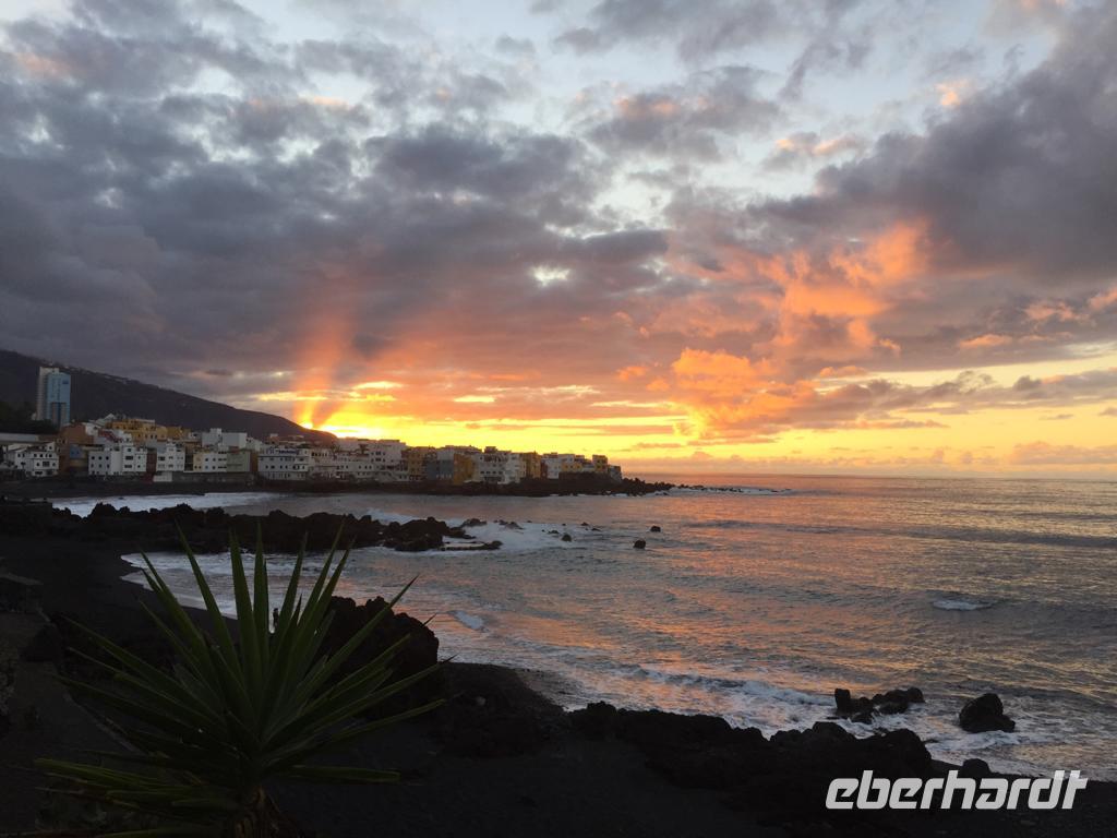 Wir fuhren weiter zu Europas zweitgrößter Steilküste und ihren impossanten Felsformation des Acantilados de Los Gigantes, den "Klippen der Riesen". Am frühen Nachmittag erwartet uns eine Bootsfahrt auf dem Atlantik. Vom kleinen Yachthafen in Los Gigantes aus fuhren wir entlang der pittoresken Steilküste zu den Kolonien der hier beheimateten Grindwale. Wir hatten Glück und sahen Delfinen. Aber nicht nur Delfinen! Bei dieser ca. 3 stündigen Bootsfahrt kann man auch Wale beobachten. Wir fuhren bis zur geschützten Badebucht Masca (oder Masca Schlucht Strand genannt) und dort konnten wir auch etwas essen und sogar baden. Vom Boot konnte man, wenn man es sich zutraute, direkt ins Meer springen und dann durch Treppen wieder am Bord kommen um sich abzutrocknen. Wir fast alle haben es zugetraut und es war einfach herrlich. Wir hatten auch kostenlose Getränke während der Fahrt und man kann nur sagen: mit Bier unter der Sonne und mit Salz auf der Haut vom Meerwasser an Deck zu entspannen ist ein einzigartiges Erlebeniss, oder? Zurück nach Puerto de la Cruz hatten wir heute wieder einen herrlichen Sonnenuntergang. Unvergesslich!