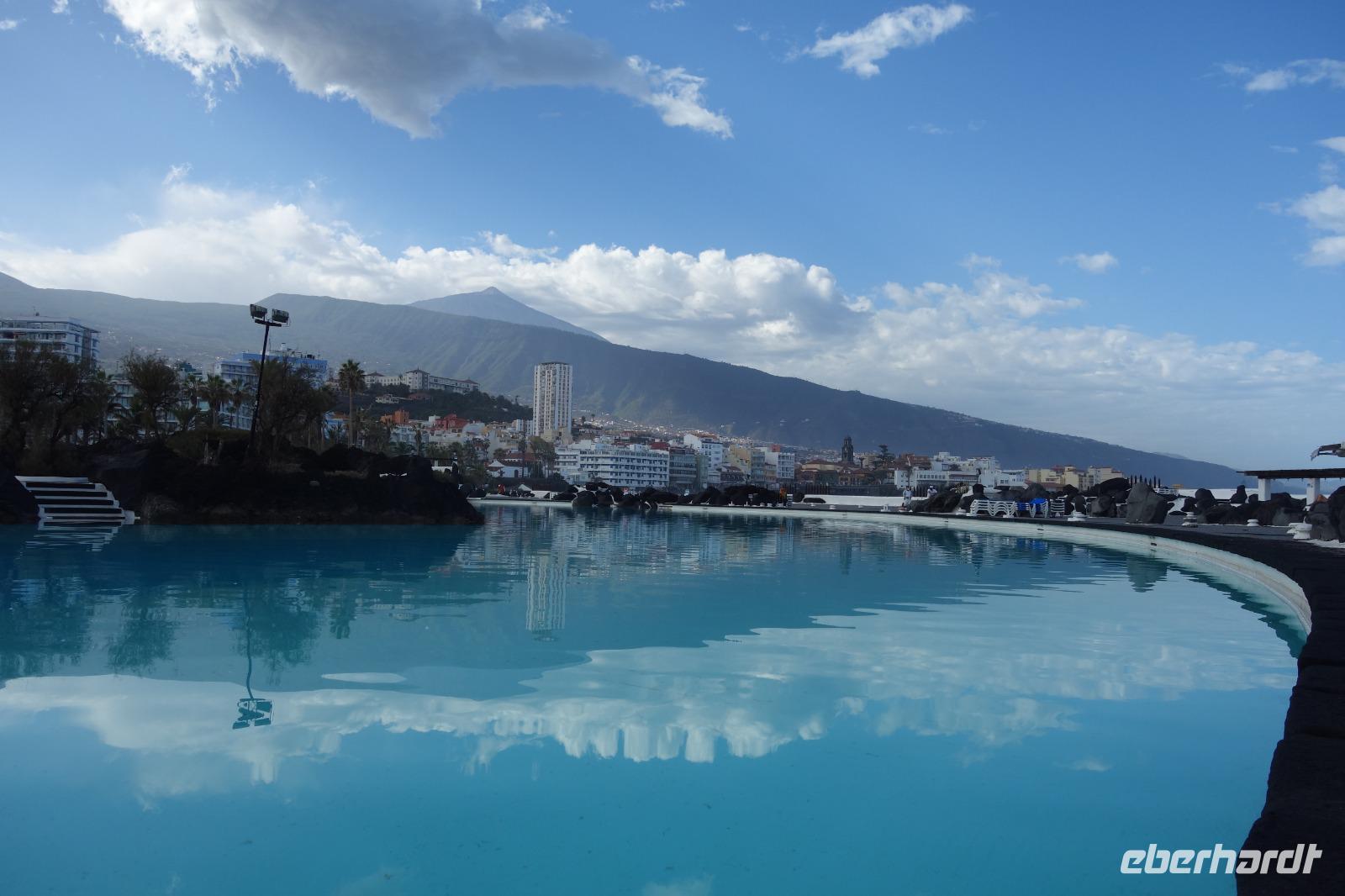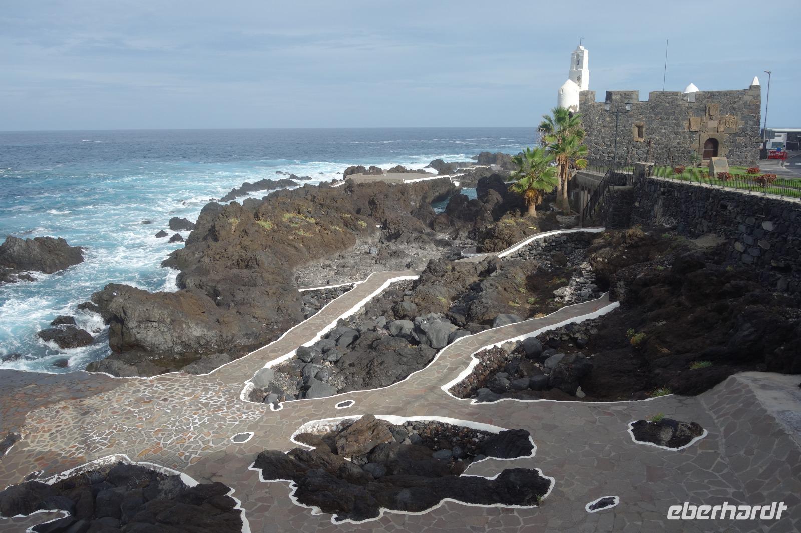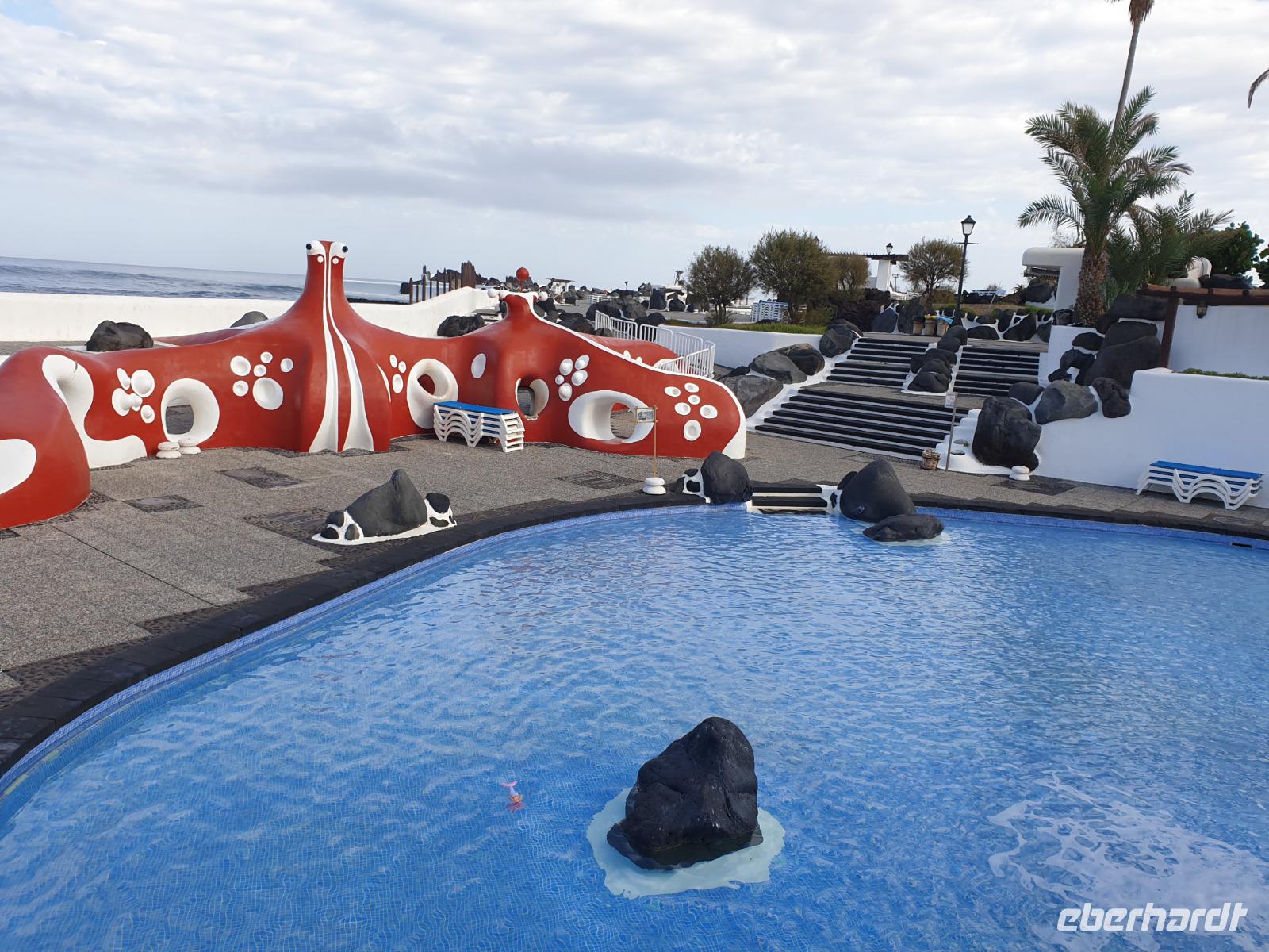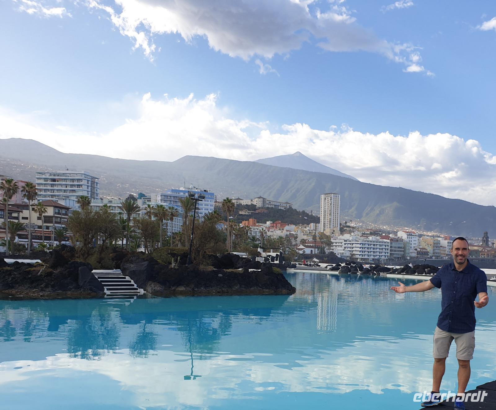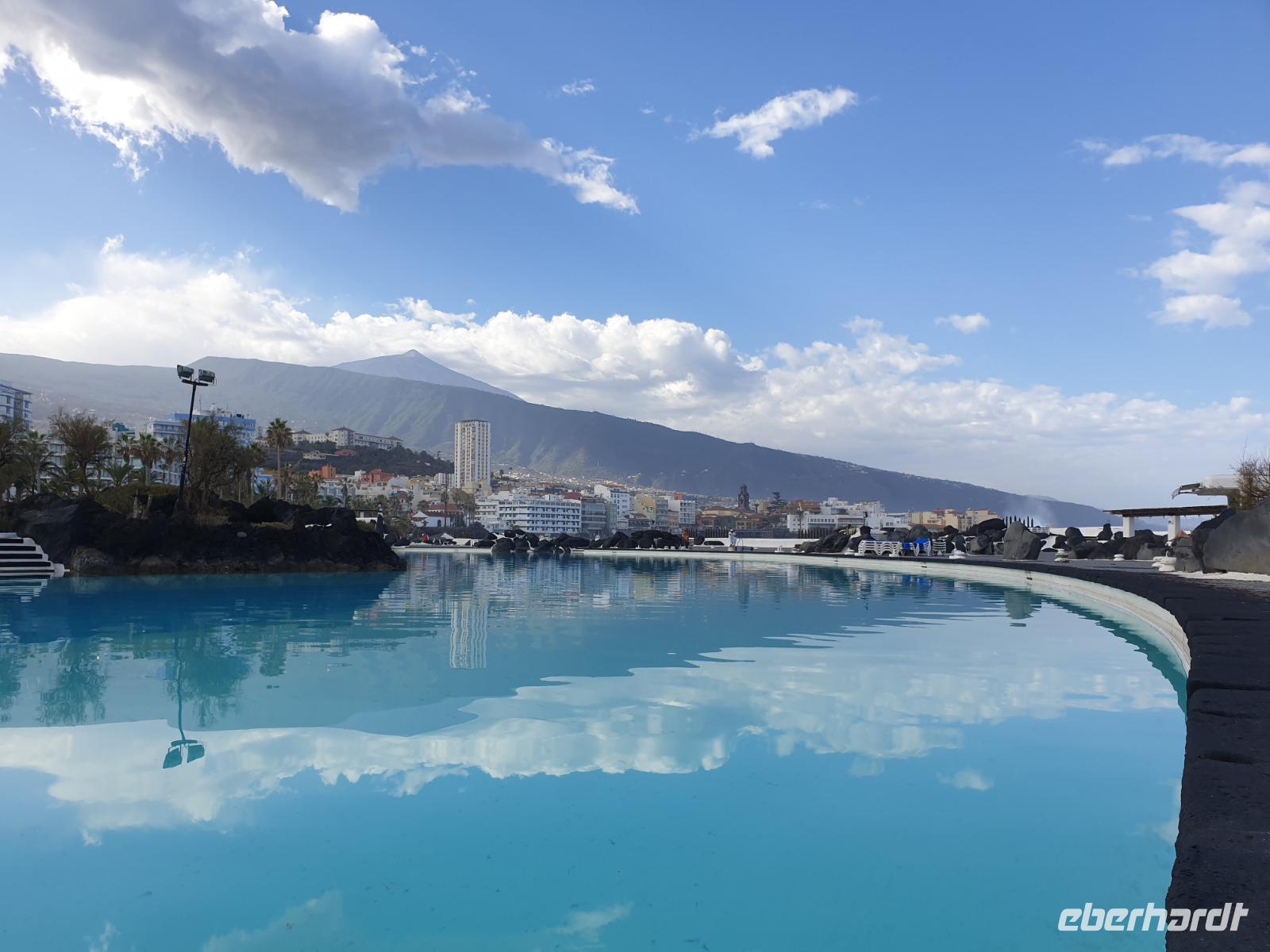 Wir lernen so heute weiter unseren Urlaubsort Puerto de la Cruz ein wenig mehr kennen. Gemeinsam mit Benjamin spazieren wir vom Hotel hinunter in die Altstadt. Wir laufen entlang der Promenade bis zu den von Cesar Manrique entworfenen Naturschwimmbädern. Auch wenn wir heute keine Zeit zum Baden mehr haben, dürfen wir aber kostenlos rein. In der großzügigen Anlage kann man sieben Skulpturen des Künstlers César Manrique bewundern, darunter ein Windspiel und Wasserfontänen.