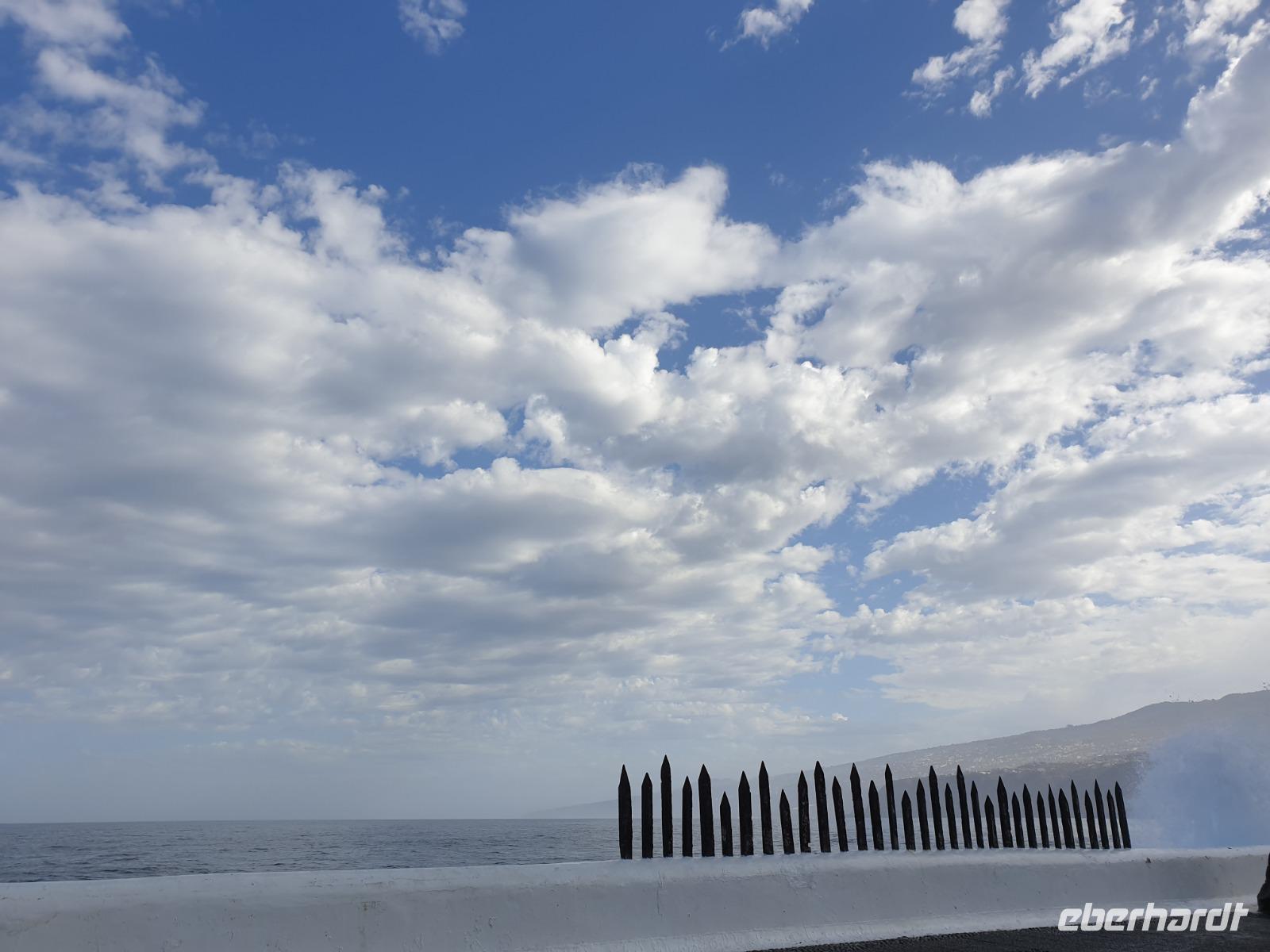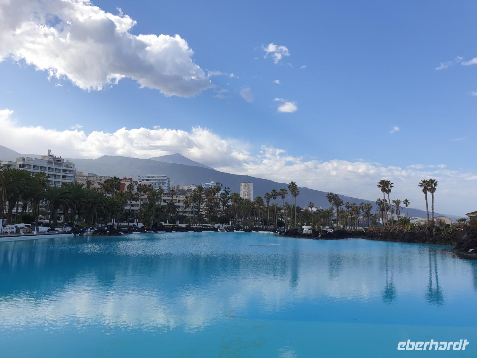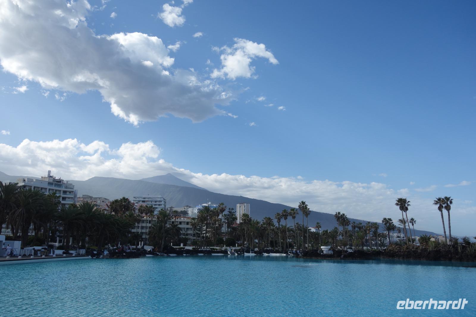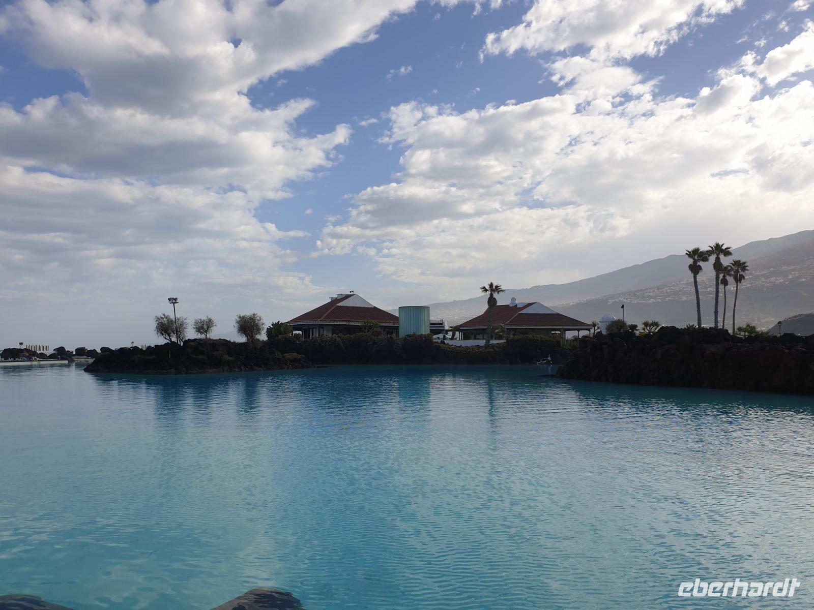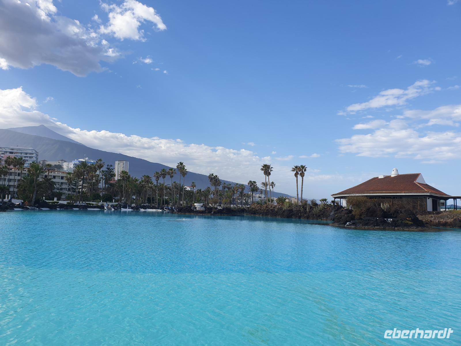 Wir lernen so heute weiter unseren Urlaubsort Puerto de la Cruz ein wenig mehr kennen. Gemeinsam mit Benjamin spazieren wir vom Hotel hinunter in die Altstadt. Wir laufen entlang der Promenade bis zu den von Cesar Manrique entworfenen Naturschwimmbädern. Auch wenn wir heute keine Zeit zum Baden mehr haben, dürfen wir aber kostenlos rein. In der großzügigen Anlage kann man sieben Skulpturen des Künstlers César Manrique bewundern, darunter ein Windspiel und Wasserfontänen.