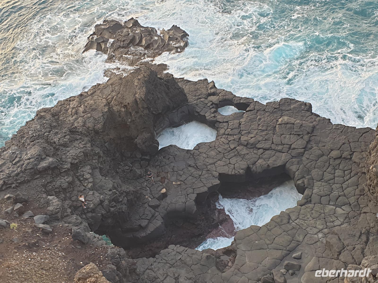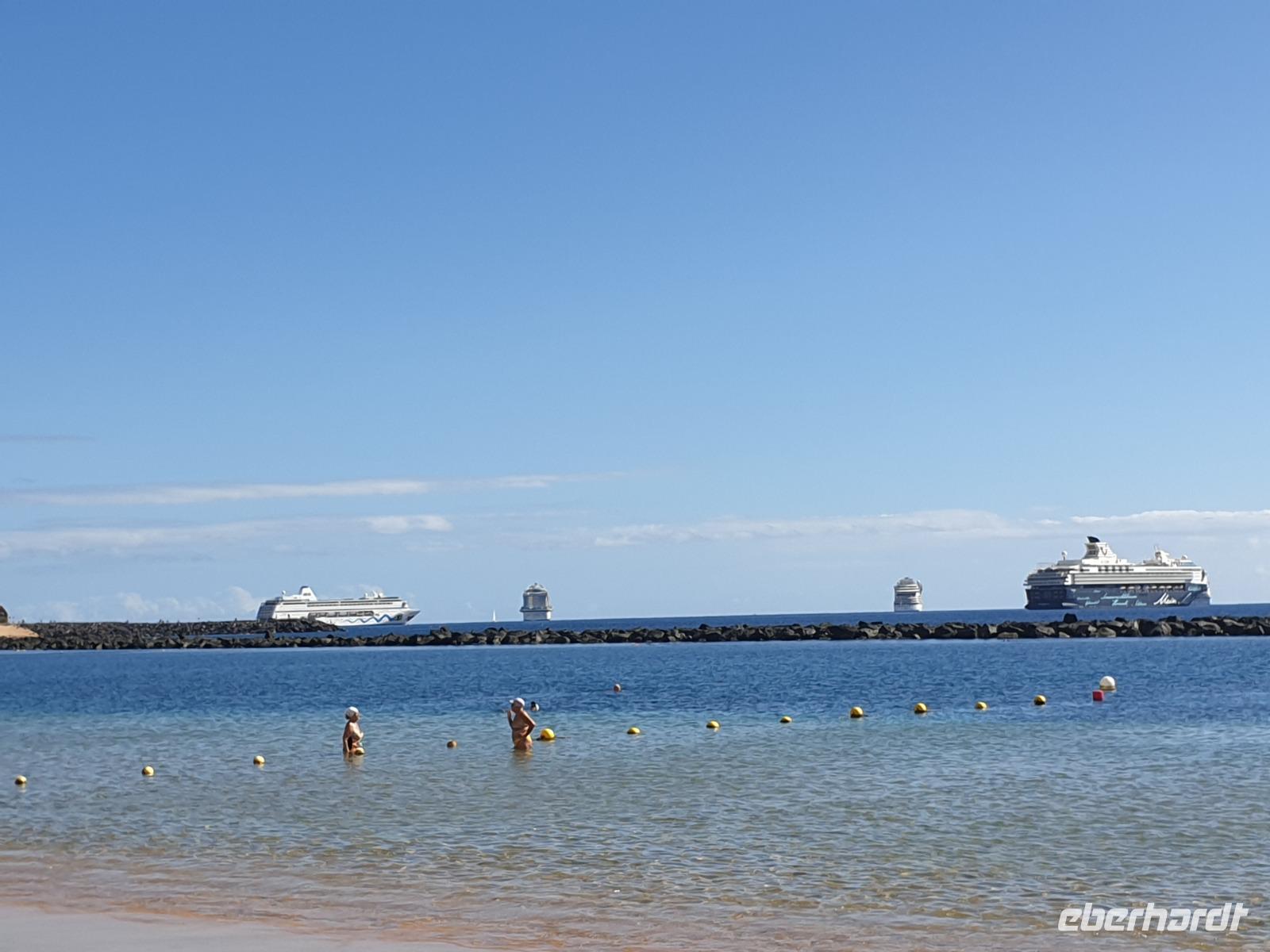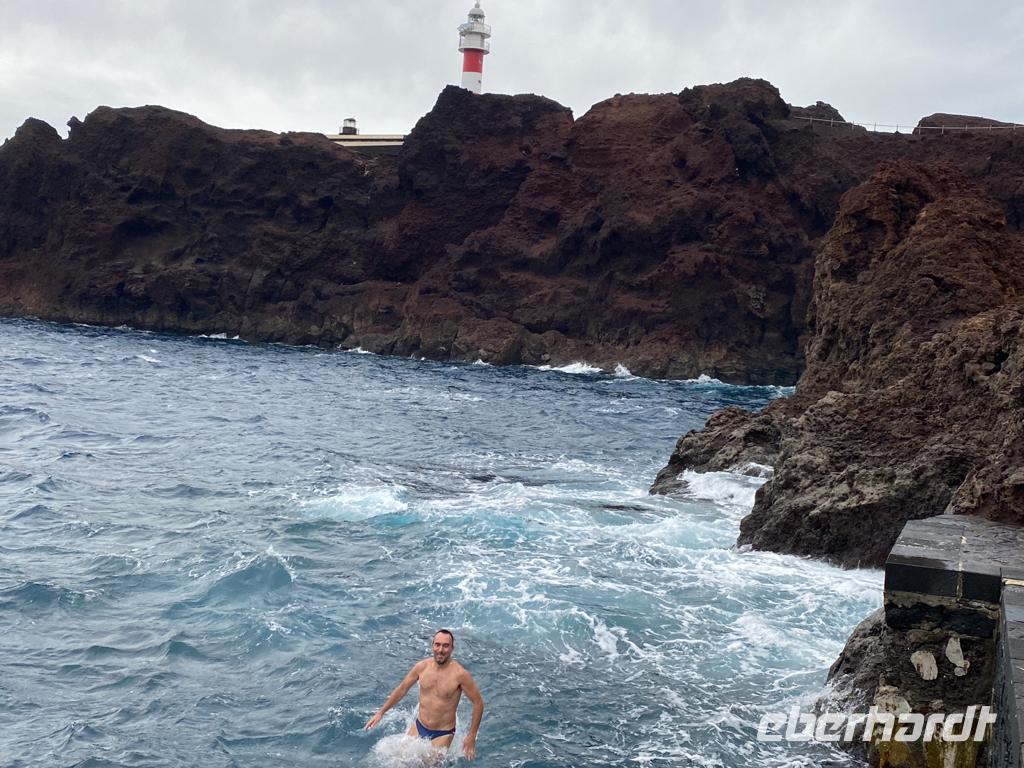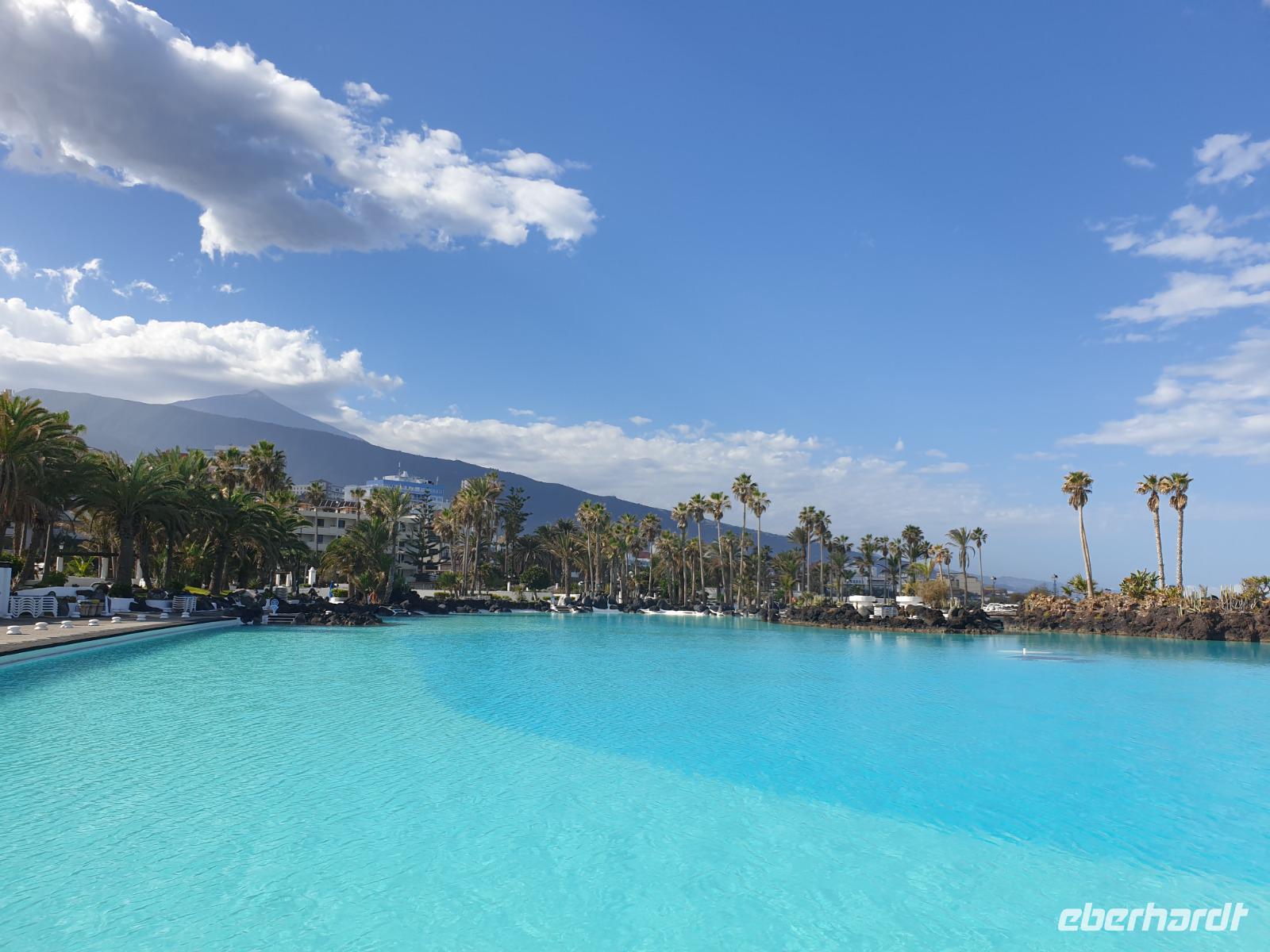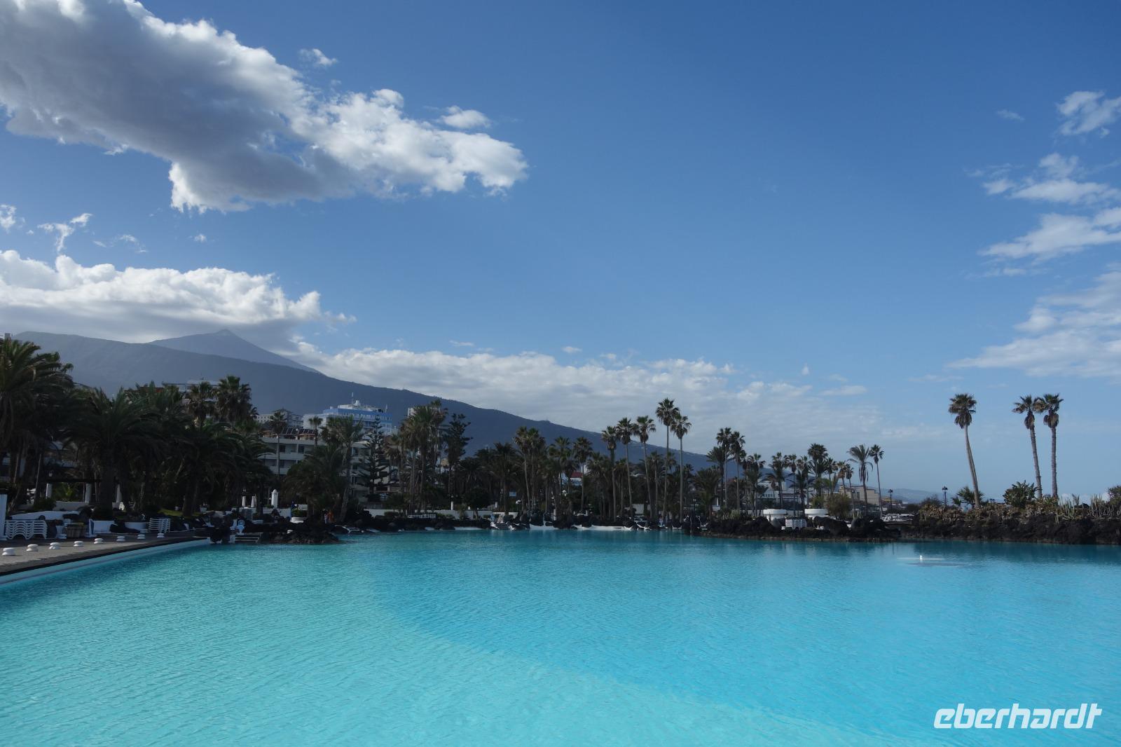 Wir lernen so heute weiter unseren Urlaubsort Puerto de la Cruz ein wenig mehr kennen. Gemeinsam mit Benjamin spazieren wir vom Hotel hinunter in die Altstadt. Wir laufen entlang der Promenade bis zu den von Cesar Manrique entworfenen Naturschwimmbädern. Auch wenn wir heute keine Zeit zum Baden mehr haben, dürfen wir aber kostenlos rein. In der großzügigen Anlage kann man sieben Skulpturen des Künstlers César Manrique bewundern, darunter ein Windspiel und Wasserfontänen.