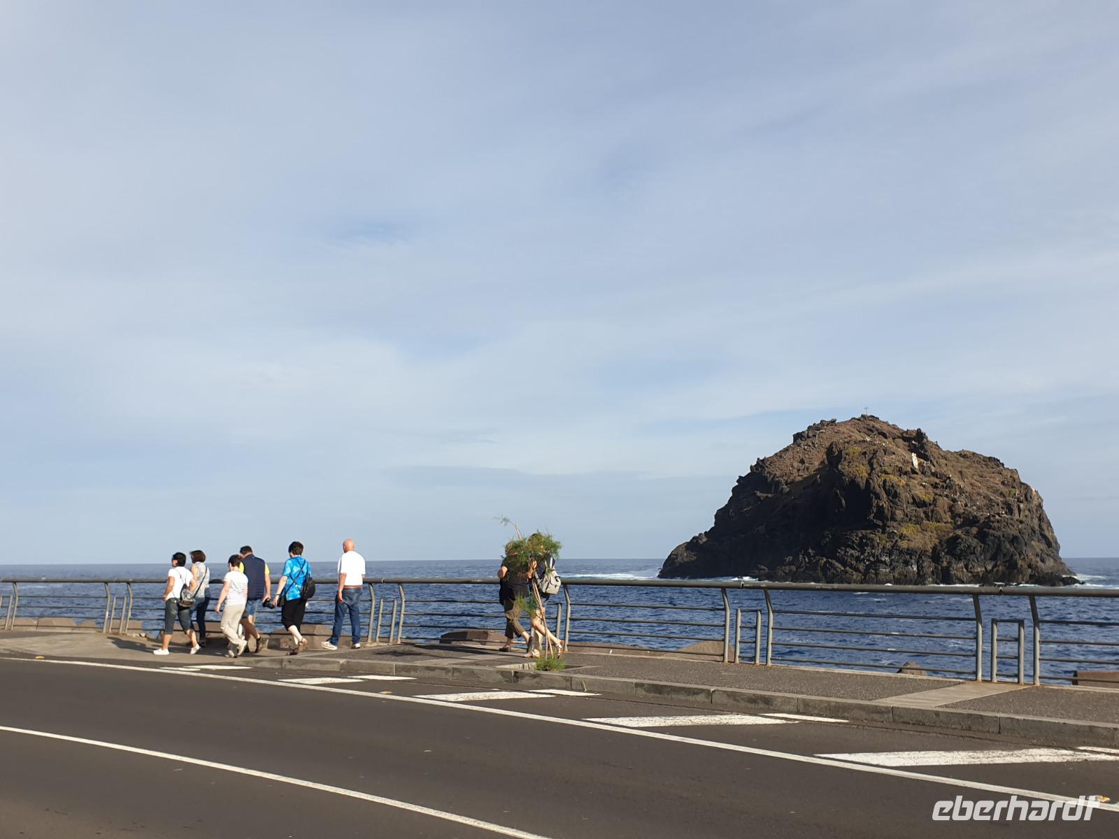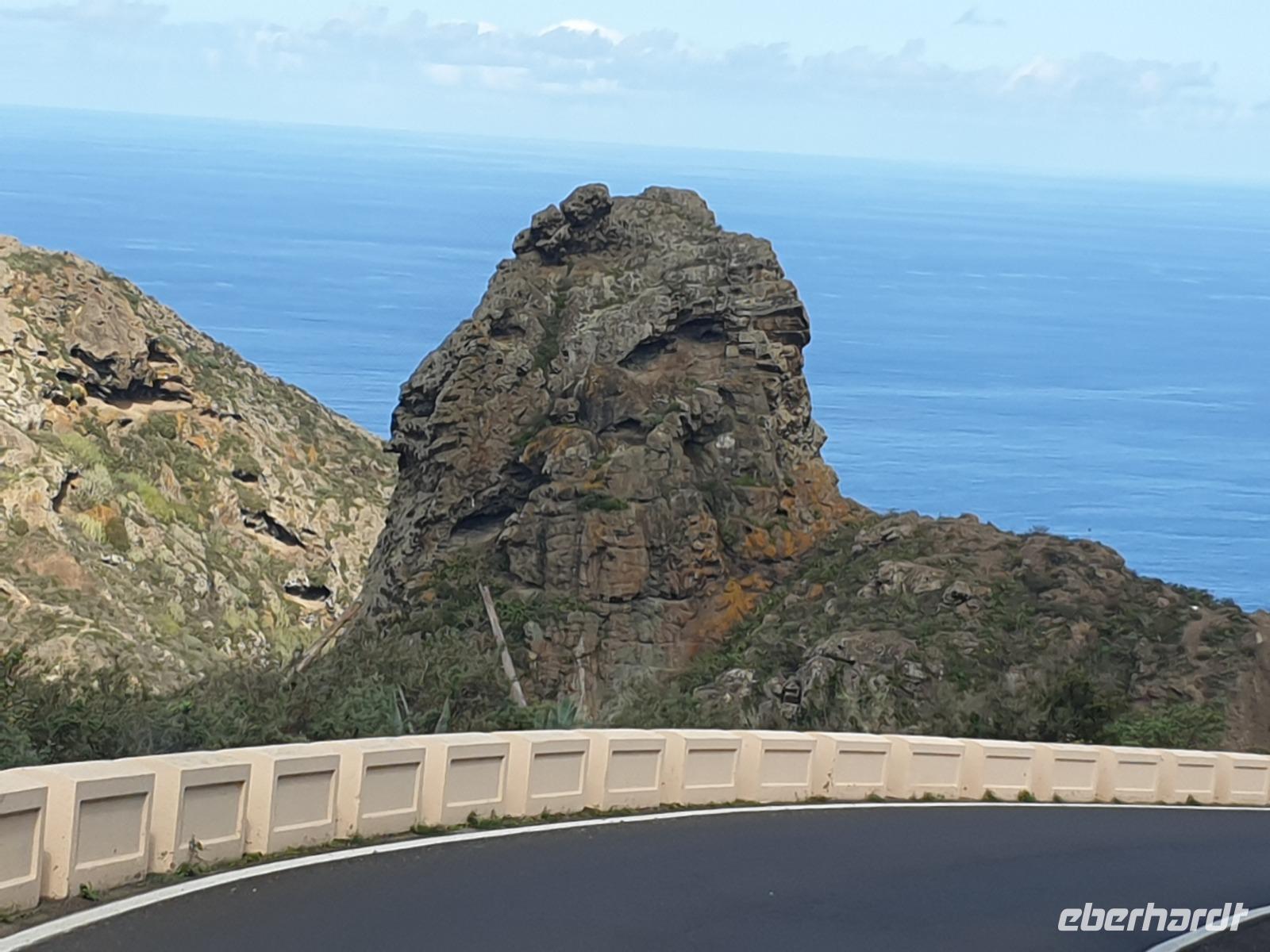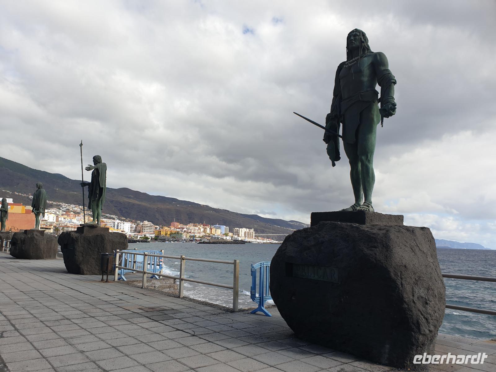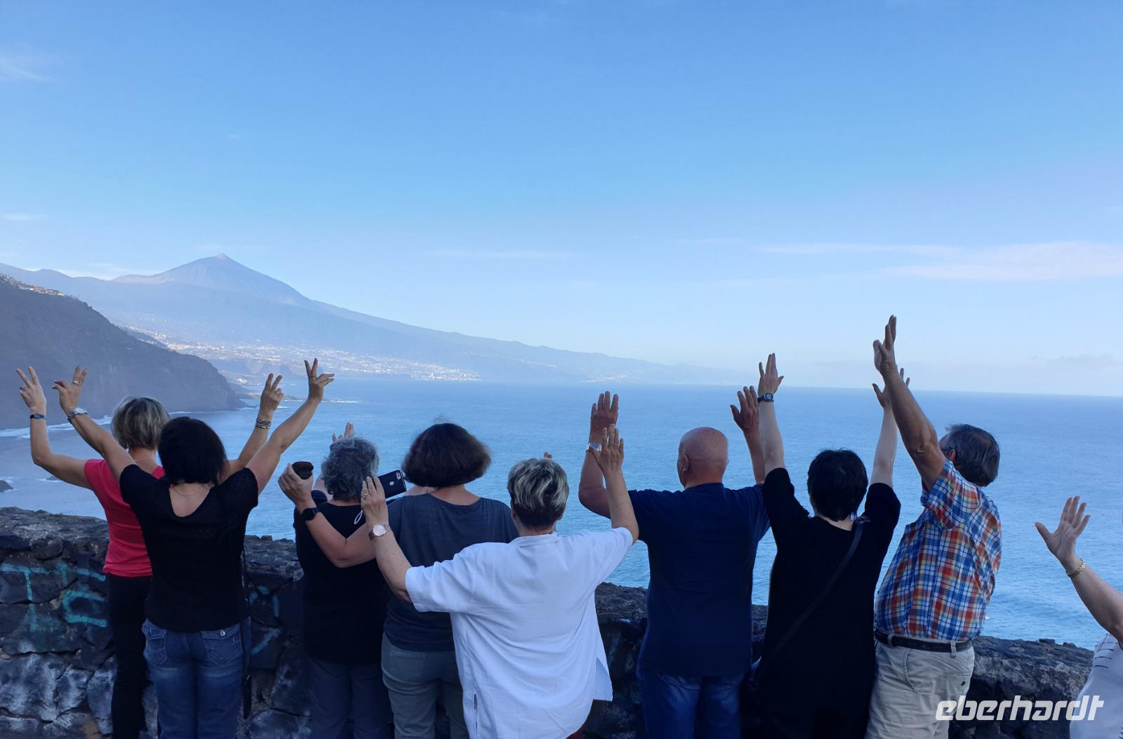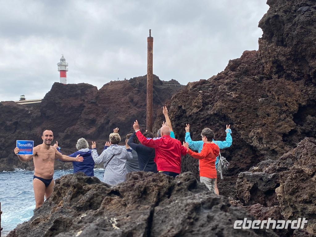 Der heutige Tag stand für uns heute für eigene Erkundungen in Puerto de la Cruz zur Verfügung. Man hatte auch Zeit, die Annehmlichkeiten des Hotels weiter zu genießen und ein wenig zu entspannen oder entlang der Promenade zu spazieren und dabei die verwinkelten Gassen zu entdecken und die leckeren Spezialitäten der Stadt zu verkosten. Ihre Eberhardt-Reiseleitung Benjamin hatte noch weitere Empfehlungen und da der berühmten Loro Park zu hatte machten wir uns wieder einen schönen Tag. Wir starten vom Hotel und fuhren erstmals nach Buenavista del Norte wo wir am Hauptplatz einen zweiten Frühstück mit den Einheimnise auf einer Terrasse genießen. Weiter fuhren wir nach Punta de Teno, mit seinem Leuchtturm, von wo man auch die Nachbarinseln La Gomera und La Palma sehen kann. Danach fuhren wir in den gebirgigen Nordwesten Teneriffas mit Stopp beim Aussichtspunkt von Garachico von oben. Dieser befindet sich auf einer Anhöhe an der Landstraße und bietet einen schönen Überblick über den Ort, die Bucht und die "kleine Insel" im Meer. Wie gestern schon gehört, hier ist den vielen Auswanderern, die in früheren Zeiten über den Hafen in die weite Welt aufbrachen, ein Denkmal gesetzt worden.