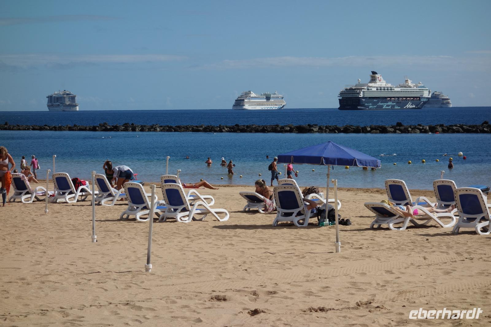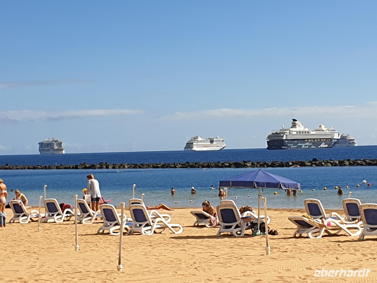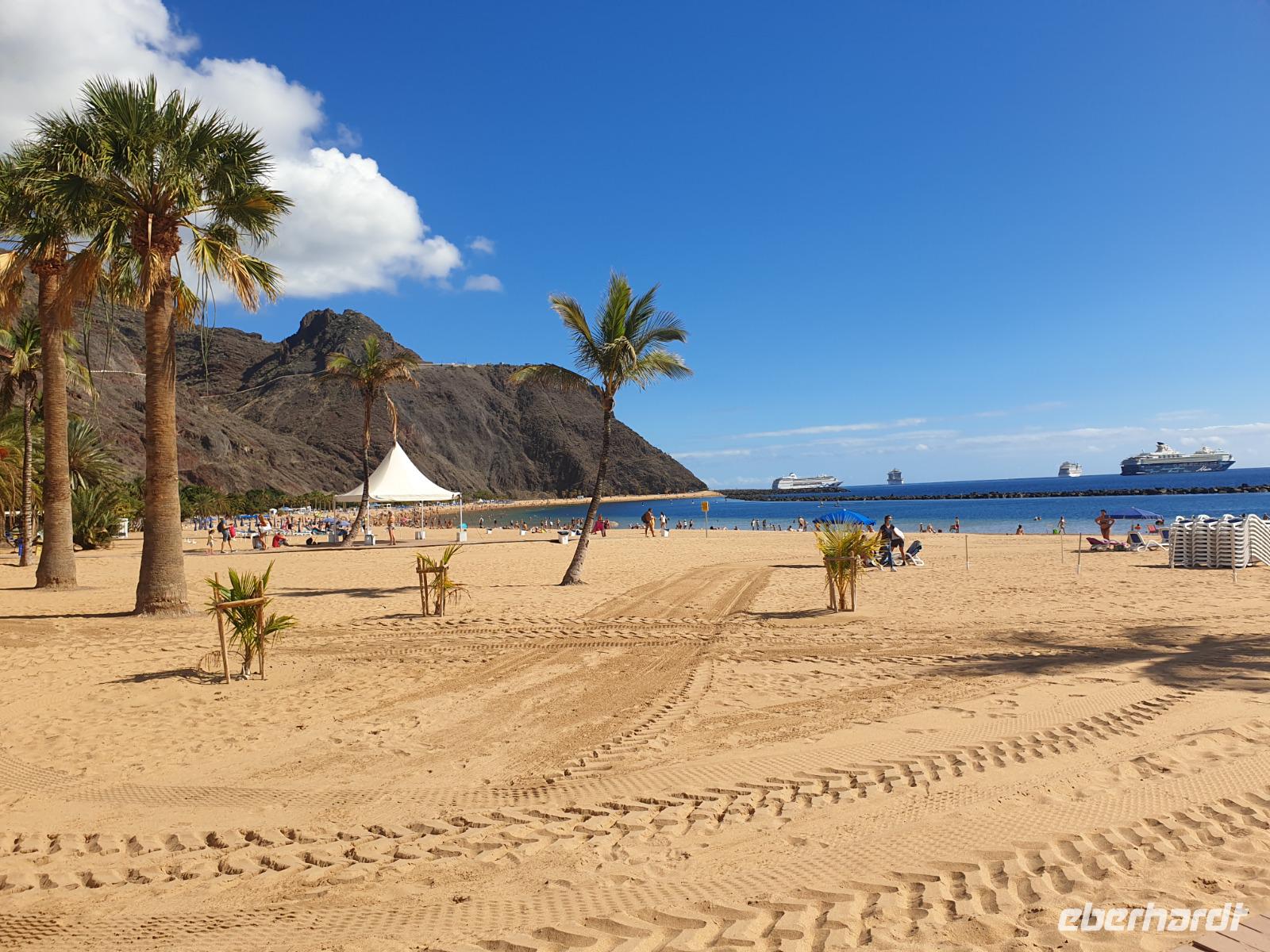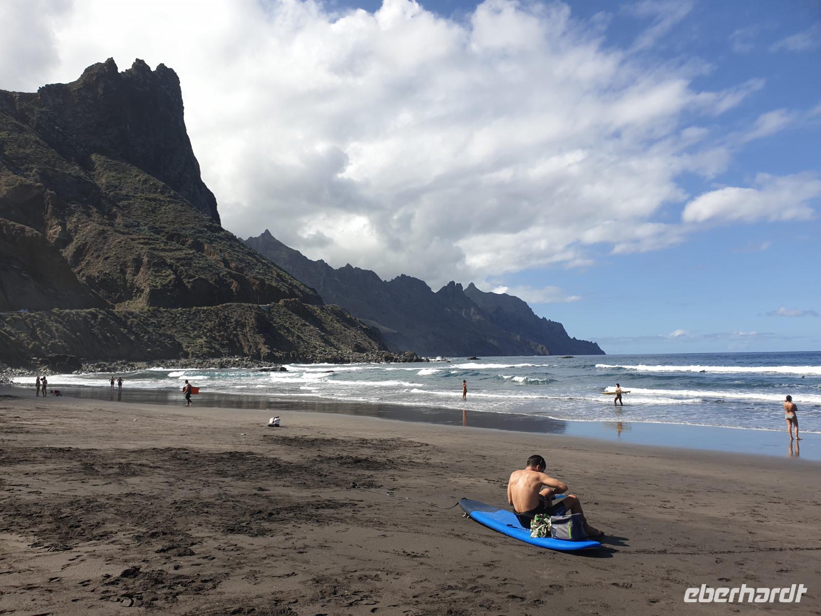 Nach einem ausgedehnten Frühstück fuhren wir heute zunächst in die Hauptstadt Teneriffas. Heute ist Sonntag und zum Glück ruhiger für uns. Wir halten erstmals am Auditorio oder Konzerthalle von Calatrava und weiter spazieren wir in Mercado de Africa Markthalle, die heute offen hat. Herrlich die viele verschieden Fische und Obst, die zu verkaufen sind. Viele von denen, sind neu für uns. In Santa Cruz haben wir dann die Möglichkeit, am einzigen goldenen Strand der Insel las Teresitas einen kurzen Spaziergang zu machen oder wie alle von uns machten, einfach eine frisch gepresste Orangensaft und einen Barraquito Kaffee auf eine Terrasse mit Blick aus Meer zu trinken. Im nordöstlichen Teil der Insel Teneriffa durchfuhren wir im Anschluss die unvergleichlich schöne Landschaft, des Anaga-Gebirge mit seinen schroffen Felsen und Lorbeerwäldern. Hier in Roque de las Bodegas aßen wir bei Casa Afrika wo man gut und frisch Fisch verkosten konnte. Einfach lecker. Einige von uns baden hier schon heute oder einfach das Meer, mit seinen typischen Geräuschen und Wellen bestaunen. Ein Traum. Nach dem Abendessen heute gingen heute bis Puerto de la Cruz Zentrum um dort an der Promenade ans Meer zu spazieren und dann was trinken.