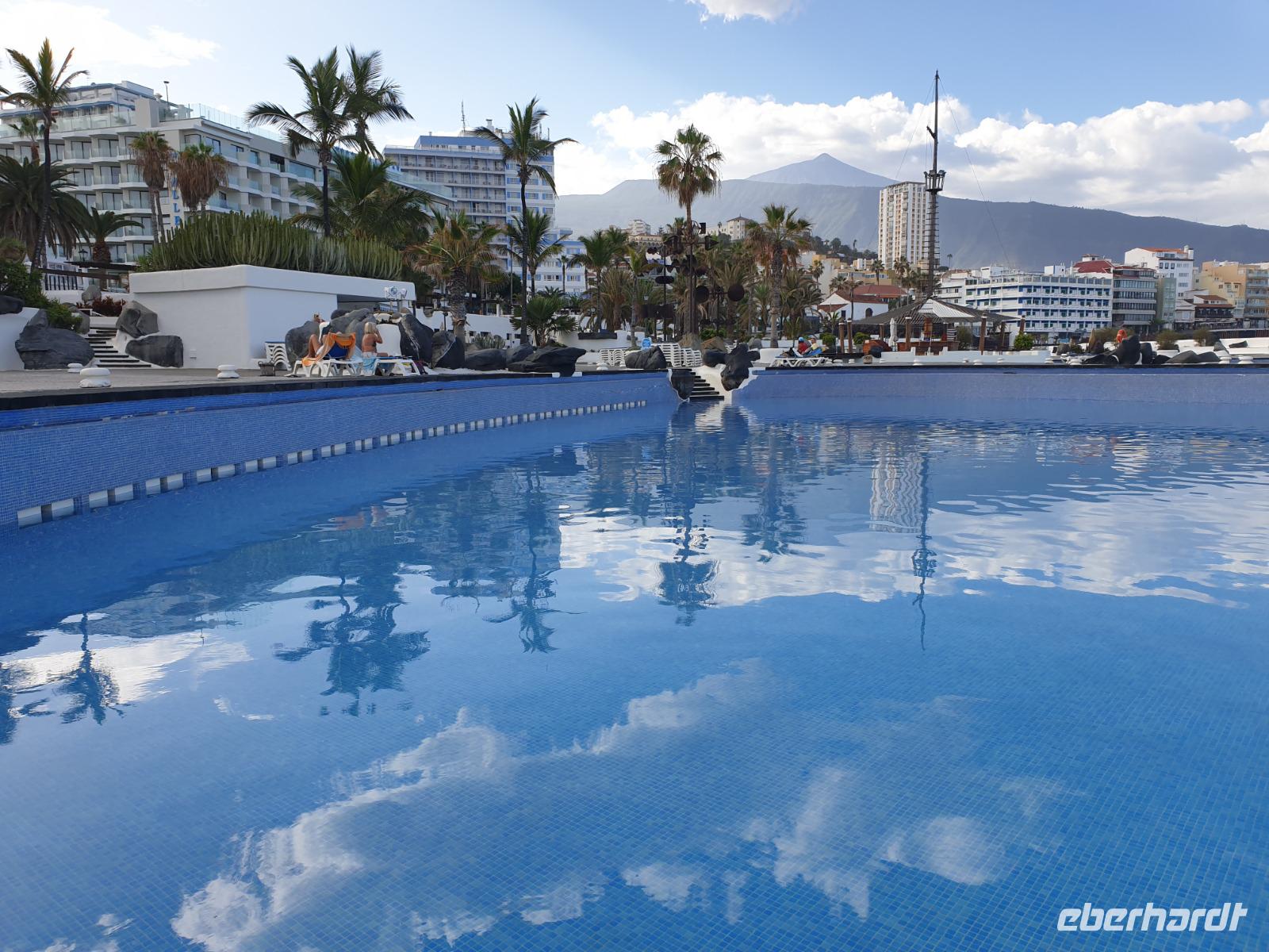 Wir erreichen nach circa 4,5 Flugstunden die kanarische Insel Teneriffa. Die größte der 7 Kanaren-Inseln wird überragt vom höchsten Berg Spaniens, dem Teide mit immerhin 3.718 Metern über dem Meer. Am Flughafen werden wir bereits erwartet und mit einem circa 1,5 stündigen Transfer in den Norden der Insel nach Puerto de la Cruz gefahren. Wir beziehen Unser 4-Sterne-Hotel Maritim in Puerto de la Cruz im schönen Orotava-Tal an der Nordküste von Teneriffa.