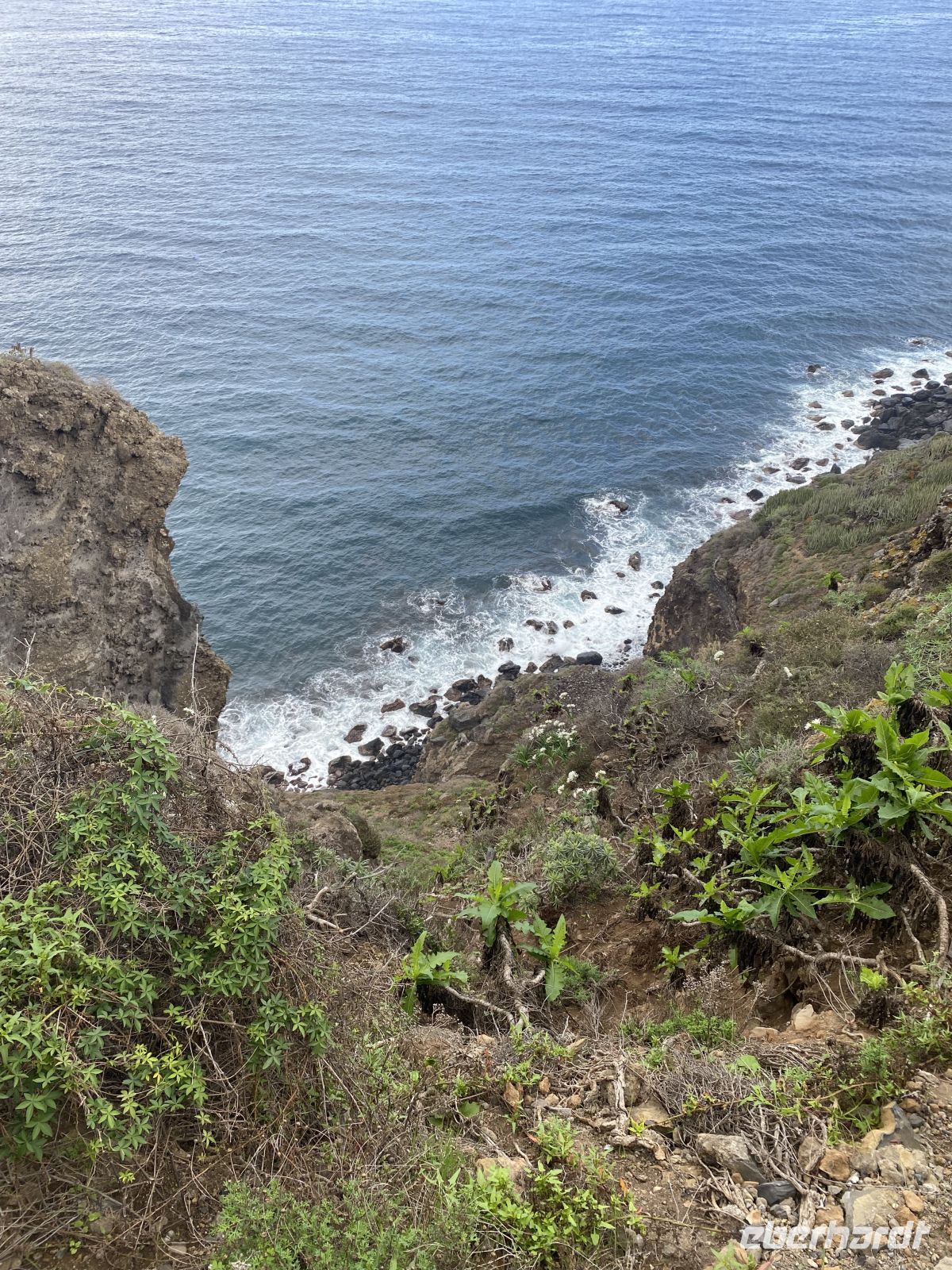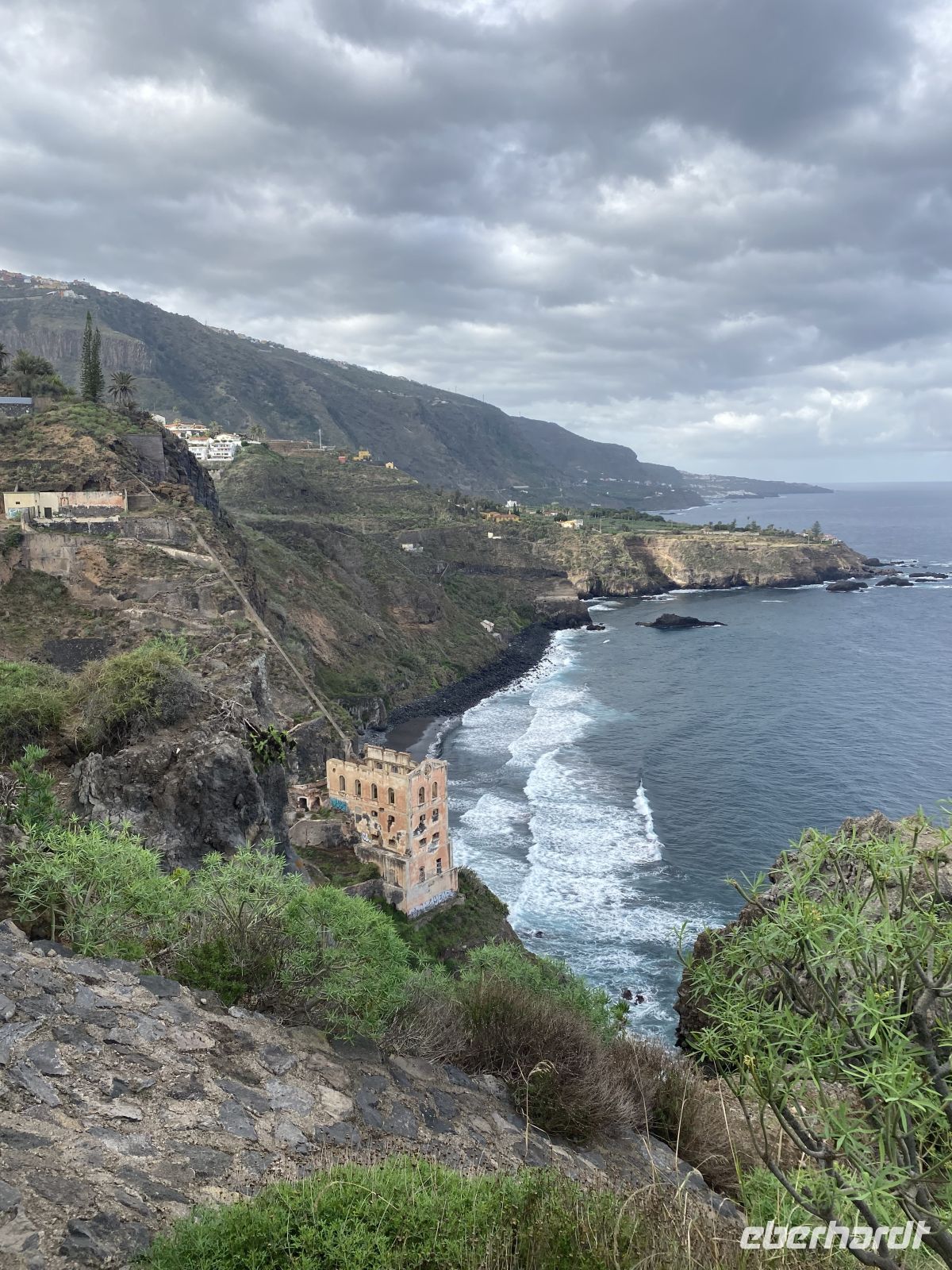 Der Aufzug, oder besser die alte Pumpstation, liegt eindrucksvoll an der Felswand unterhalb der Küste. Das verfallene Gebäude aus dem frühen 20. Jahrhundert wirkt wie eine Mischung aus Industrieruine und Filmkulisse. Die massiven Mauern, die hohen Fensteröffnungen und die verschiedenen Ebenen zeugen von der einstigen Bedeutung dieser Anlage. Hier wurde früher Meerwasser mithilfe eines der ersten Dampfmotoren der Insel hinaufgepumpt, um die umliegenden Bananenplantagen zu bewässern. Heute steht die Ruine still, von Wind und Wellen umtost, aber ihre Lage ist spektakulär und der Blick auf die Küste unvergesslich.