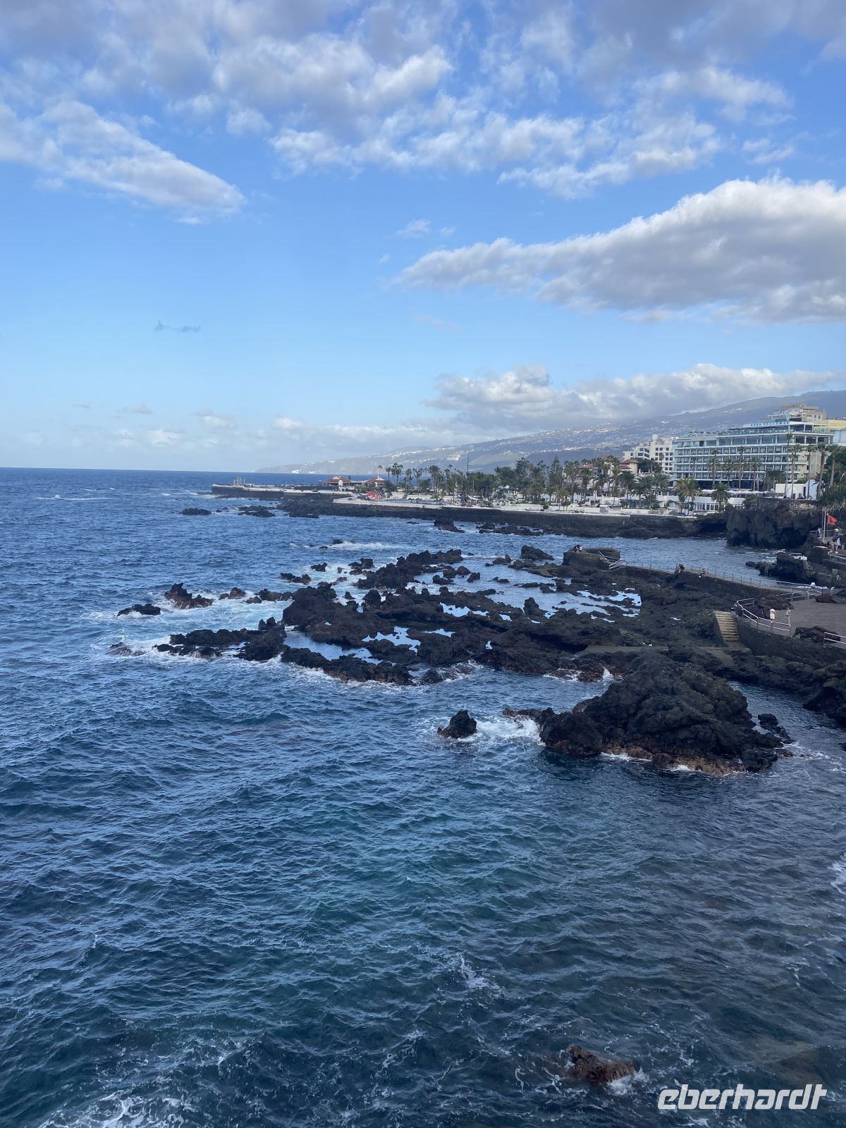 Über die Treppe setzten wir unseren Weg fort zum Mirador La Paz. Oben angekommen, öffnete sich ein beeindruckender Blick über Puerto de la Cruz, die Küste und den Atlantik. Die Stadt lag unter uns wie ein farbiges Mosaik, und das Meer glitzerte in der Mittagssonne. Etwas tiefer lag das Einkaufszentrum, in dem wir eine kleine Pause einlegten. Bei einem Getränk und einer kleinen Stärkung konnten wir uns erholen und kurz dem Trubel entgehen, bevor wir weiter Richtung Küste gingen.
