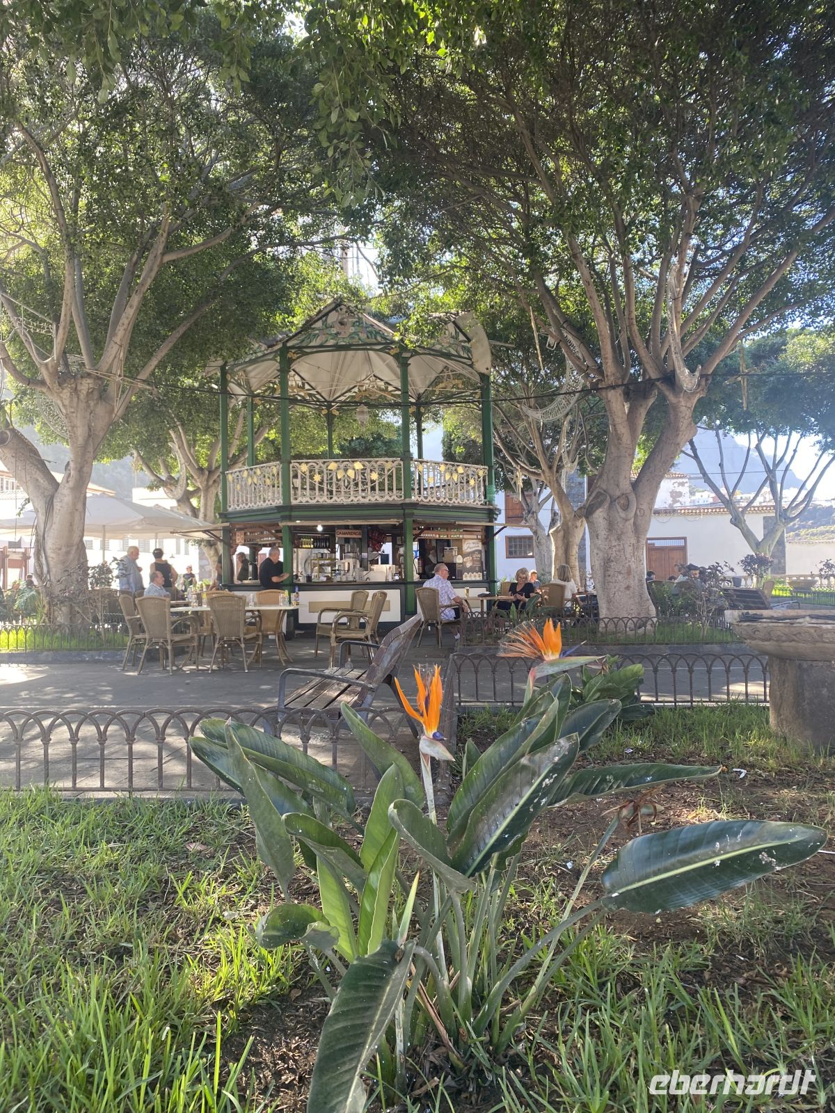 Nach einem genussvollen Frühstück fuhren wir mit Bettina zum Taoropark, der uns mit einer ruhigen, fast noch verschlafenen Atmosphäre begrüßte. Schon beim Eintritt fiel uns die üppige Vegetation auf: hohe Palmen, dichte Büsche, bunte Blumenbeete und schattige Wege, die sich sanft über das Gelände schlängeln. Immer wieder öffneten sich kleine Aussichtspunkte, von denen wir über Puerto de la Cruz, die Küste und das tiefblaue Meer blicken konnten. Die klare Luft, das Rauschen der Palmenblätter und die verschlungenen Pfade machten den Spaziergang durch den Park zu einem besonders entspannten Start in den Tag.