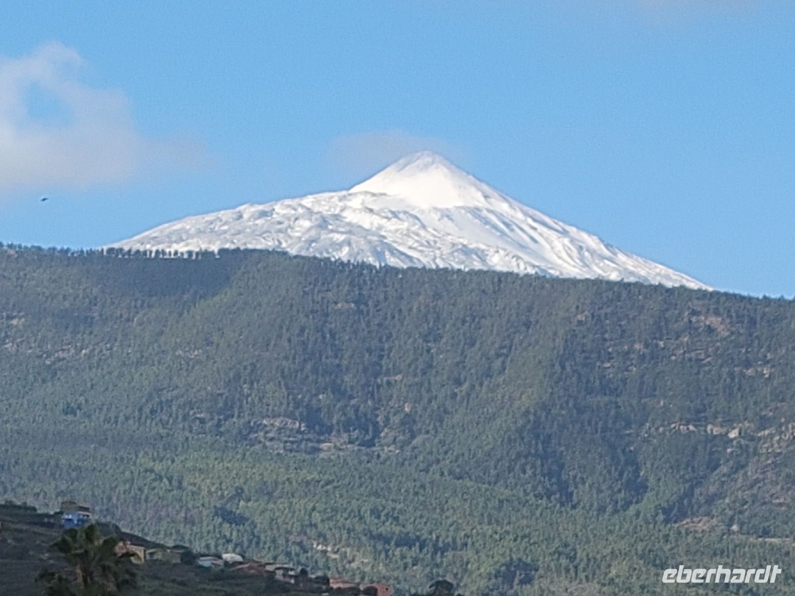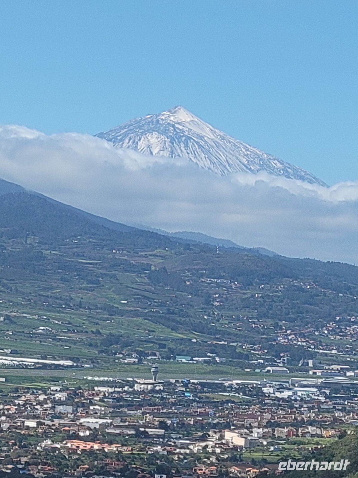Nachdem wir vor den Toren der Stadt den Bus verlassen, genießen wir zunächst den Blick auf den Teide, der uns jetzt seine mit Schnee bedeckte Spitze völlig wolkenlos zeigt.