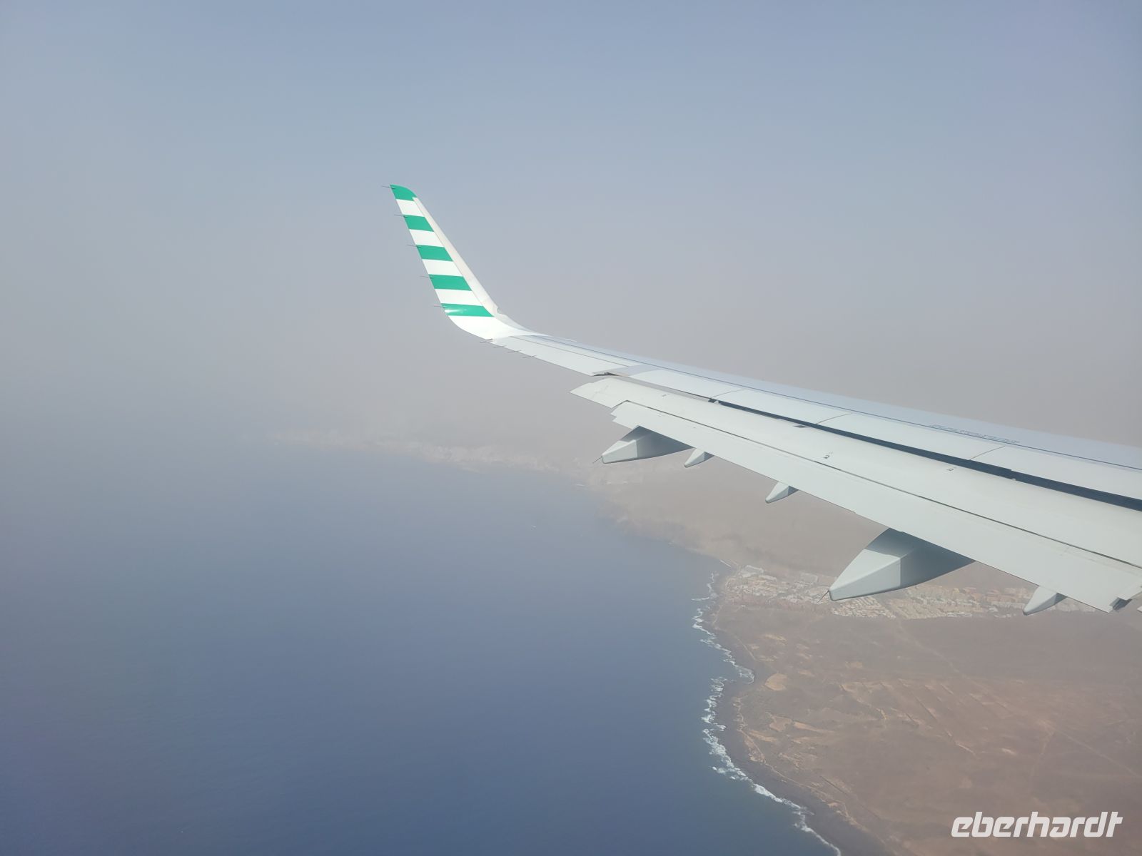 Heute ist Calima Wetterlage, die Luft ist durch feinen Sahara Staub, der aus Nordafrika über den Atlantik weht, getrübt. Nach einem bislang ganz ruhigen Flug gibt es kurz vor dem Landeanflug leichte Turbulenzen.