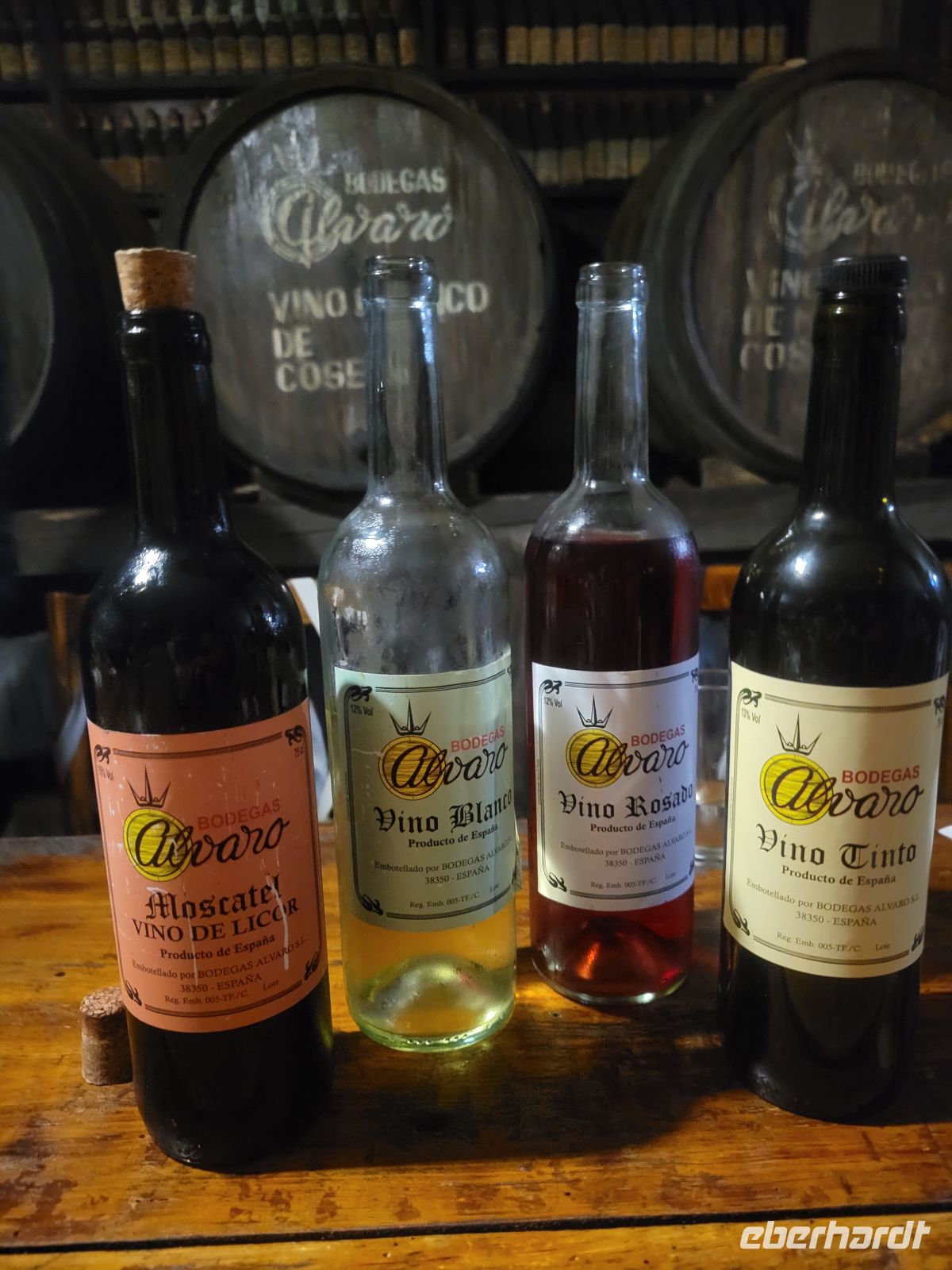 Zwischen den alten Weinfässern erhalten wir zunächst eine kleine Vorführung zur Herstellung von Mojo, der für die Kanaren typischen Sauce. Im Anschluss können wir dann die Mojo selbst probieren, dazu gibt es für jede/n einen Teller mit Schinken, Wurst, Käse, Papas Arrugadas, Brot und verschiedene Sorten von Weinen – Weißwein, Rotwein, Rosé und Moscatel. Wir bedauern es sehr, dass wir den köstlichen „Traubensaft“ nicht weiter genießen und die Flaschen bis zum letzten Schlückchen leeren können. Aber irgendwann müssen wir eben die Rückfahrt zum Hotel antreten.