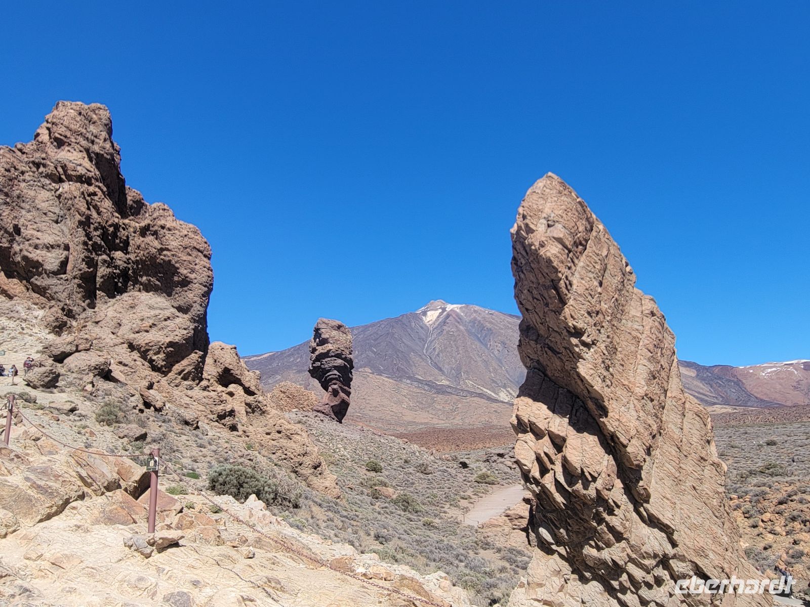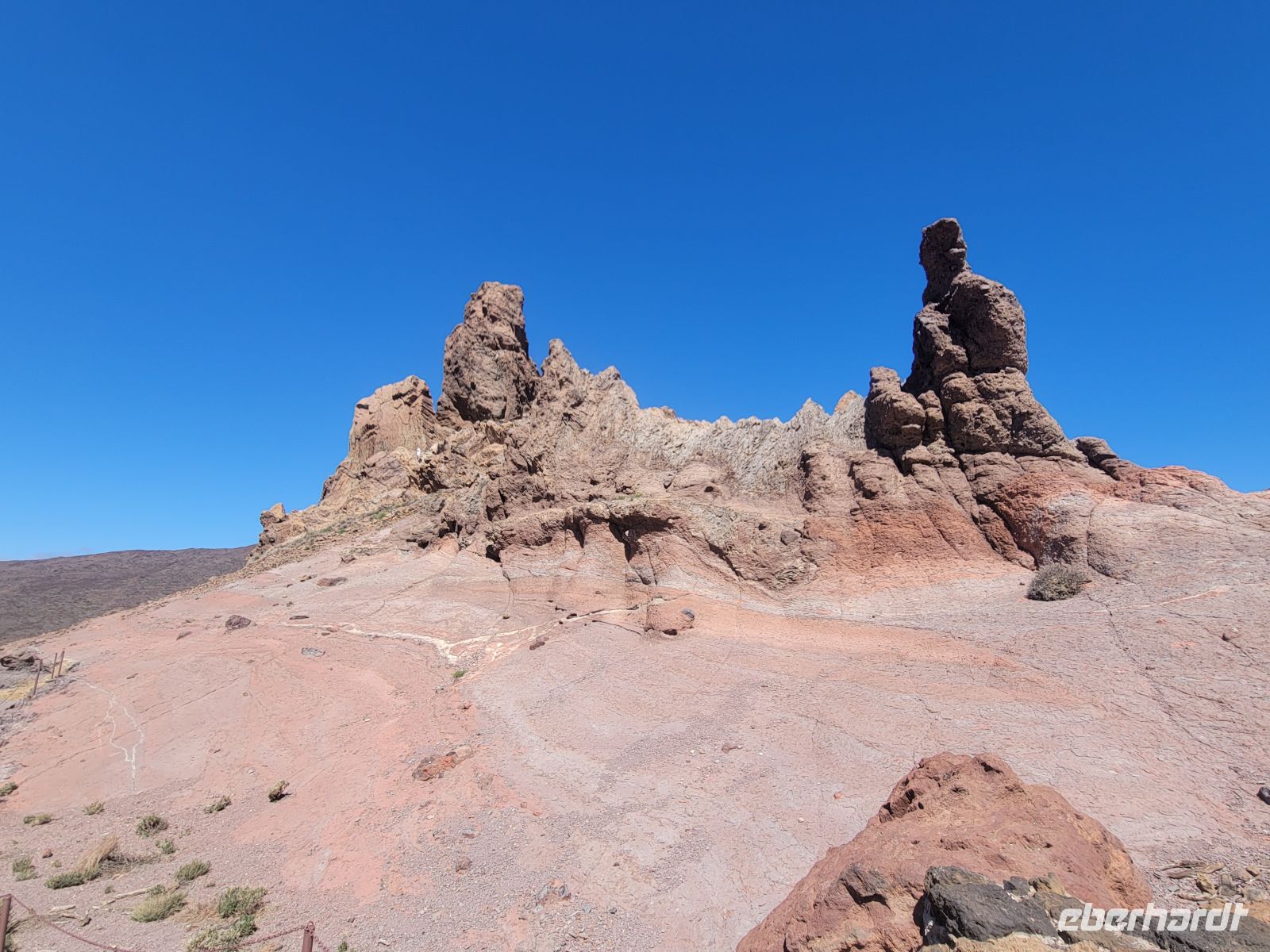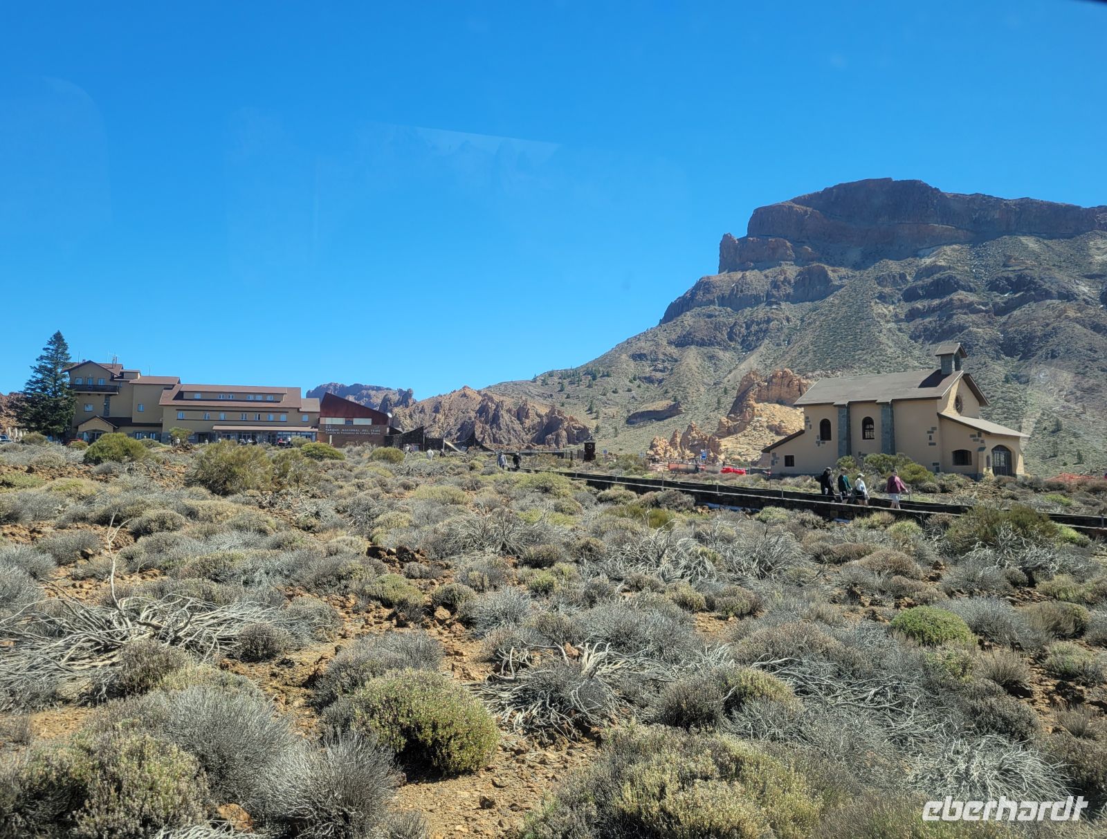 Danach geht es bereits ein wenig abwärts vorbei am Parador Nacional, einem Hotel der staatlichen spanischen Hotelkette, zum Mirador Roques de García, auf etwa 2150 Metern gelegen. Die Roques sind eine Kette aus erstarrten Magmagängen und vulkanischen Sedimenten, die durch Erosion freigelegt wurden. Sie trennen die riesige Teide-Caldera in einen westlichen und östlichen Kessel. Vom Mirador überblickt man die weitläufige, goldgelbe Ebene „Llano de Ucanca“, die an einen ausgetrockneten See erinnert und eine fast meditative Stille ausstrahlt.