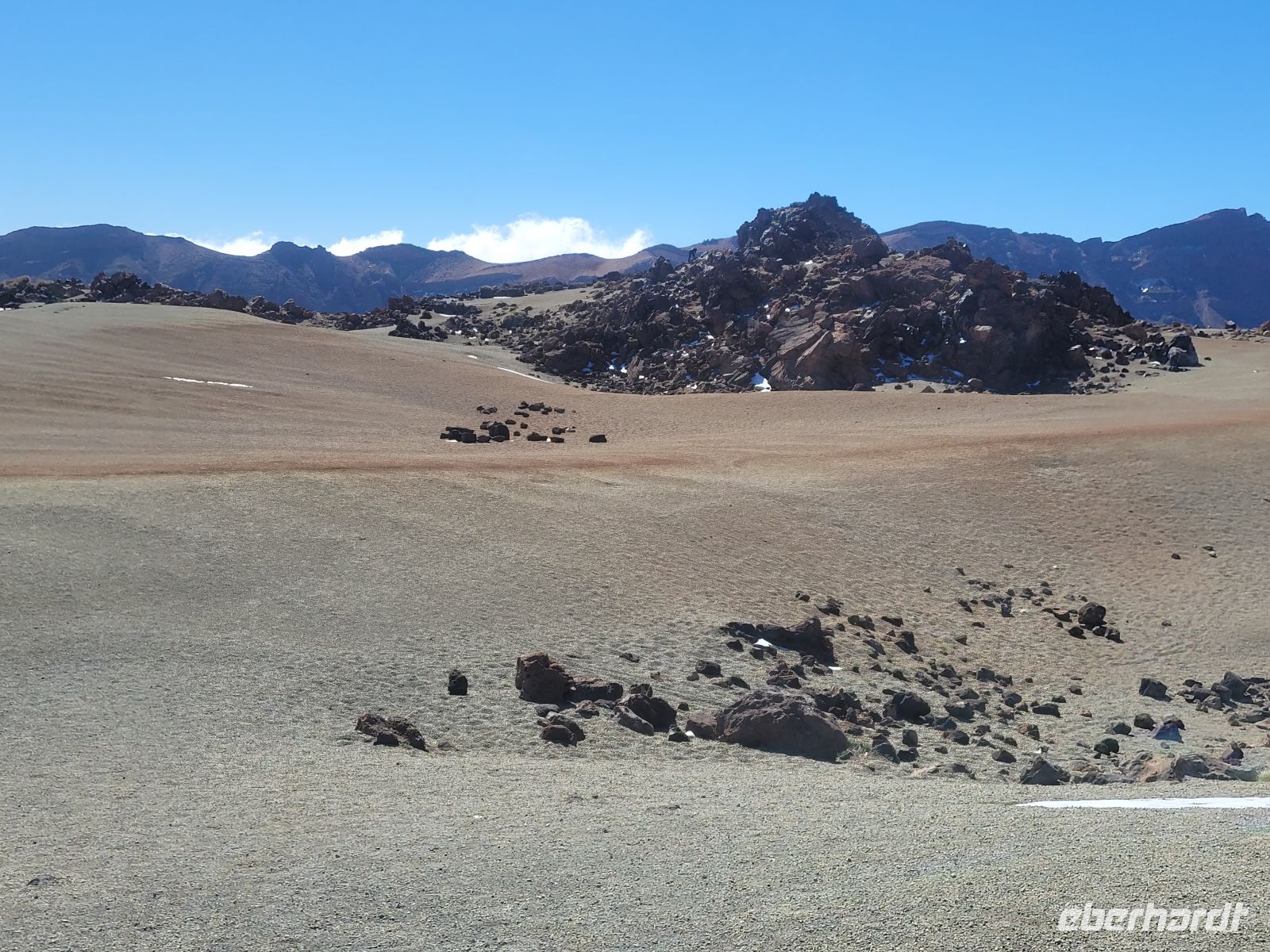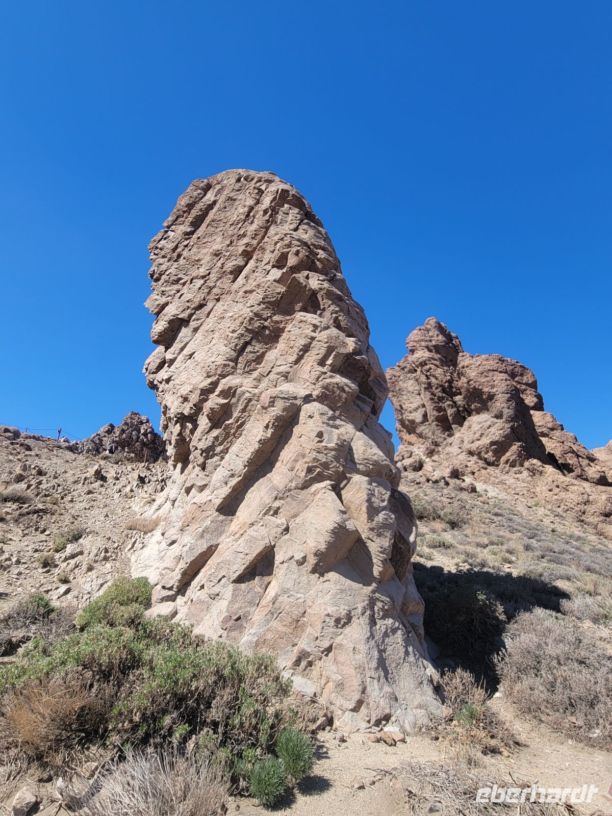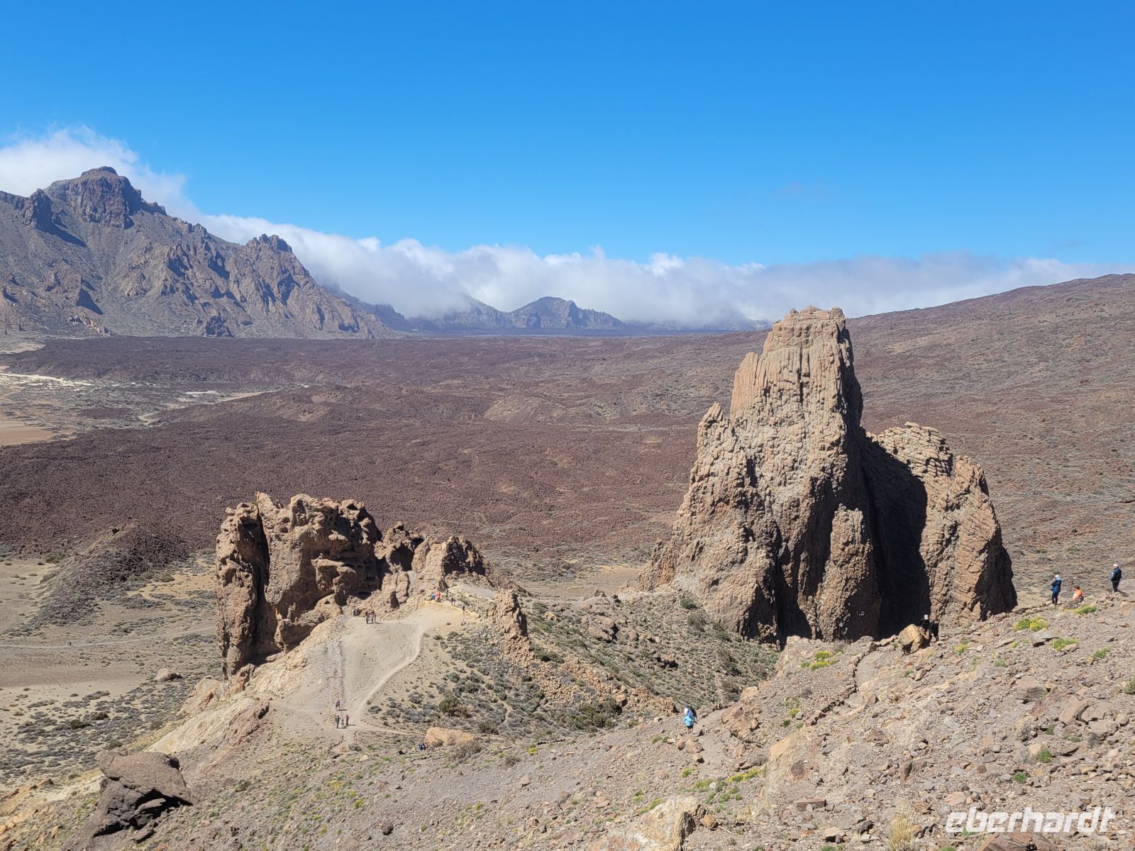 Danach geht es bereits ein wenig abwärts vorbei am Parador Nacional, einem Hotel der staatlichen spanischen Hotelkette, zum Mirador Roques de García, auf etwa 2150 Metern gelegen. Die Roques sind eine Kette aus erstarrten Magmagängen und vulkanischen Sedimenten, die durch Erosion freigelegt wurden. Sie trennen die riesige Teide-Caldera in einen westlichen und östlichen Kessel. Vom Mirador überblickt man die weitläufige, goldgelbe Ebene „Llano de Ucanca“, die an einen ausgetrockneten See erinnert und eine fast meditative Stille ausstrahlt.