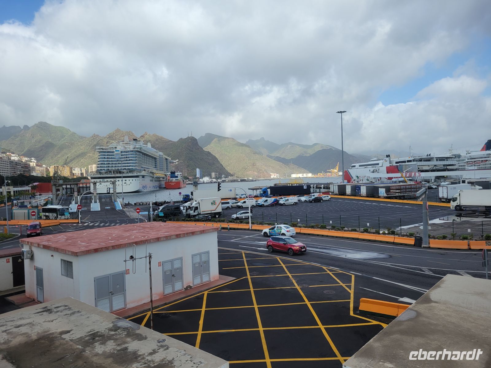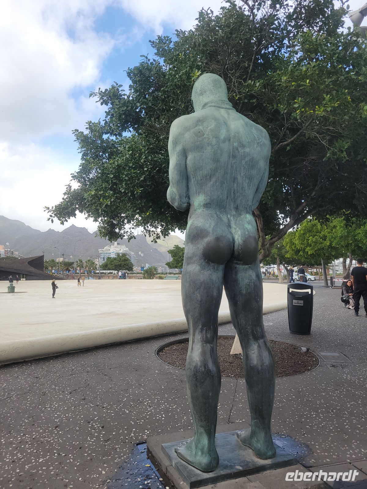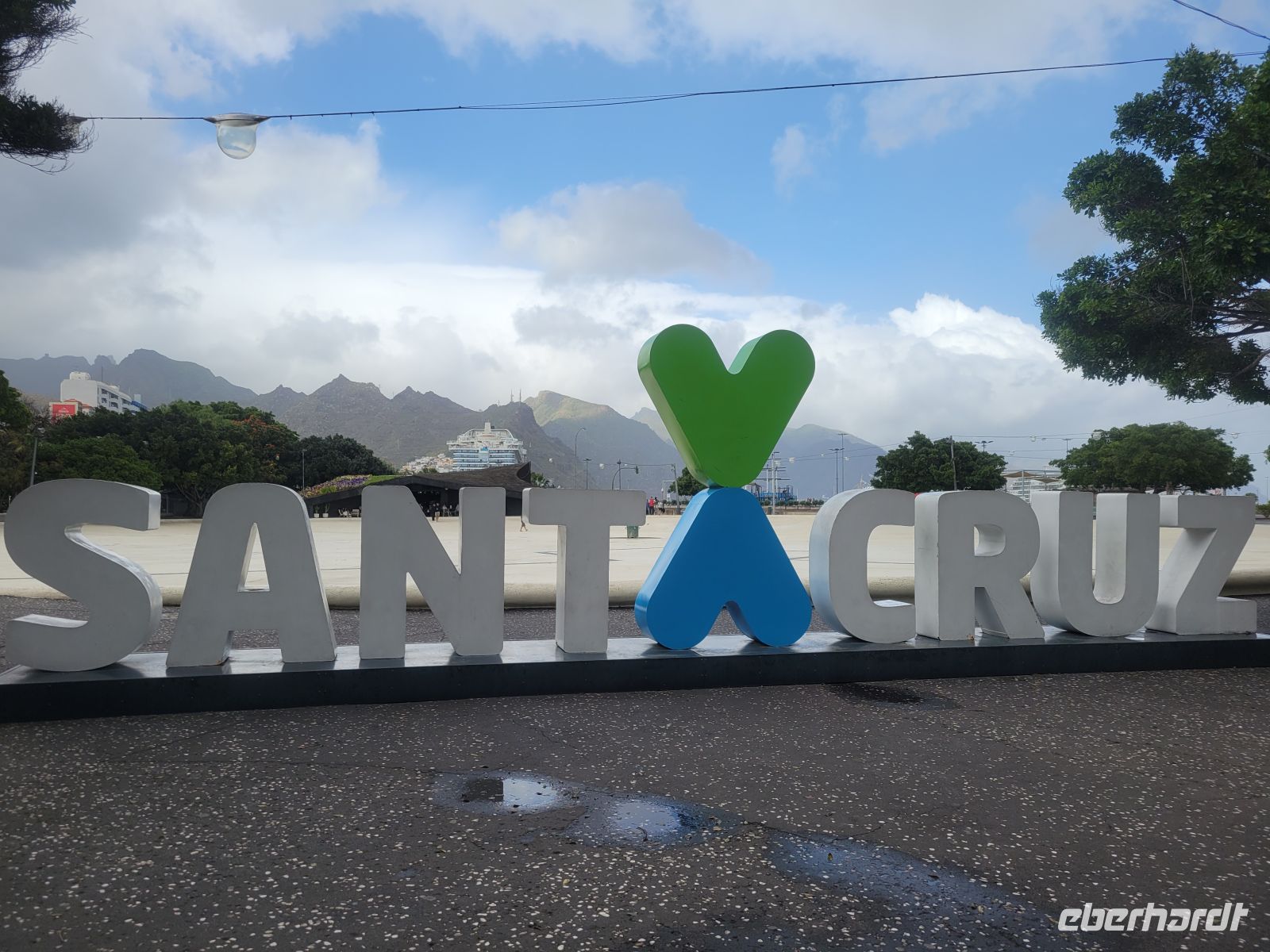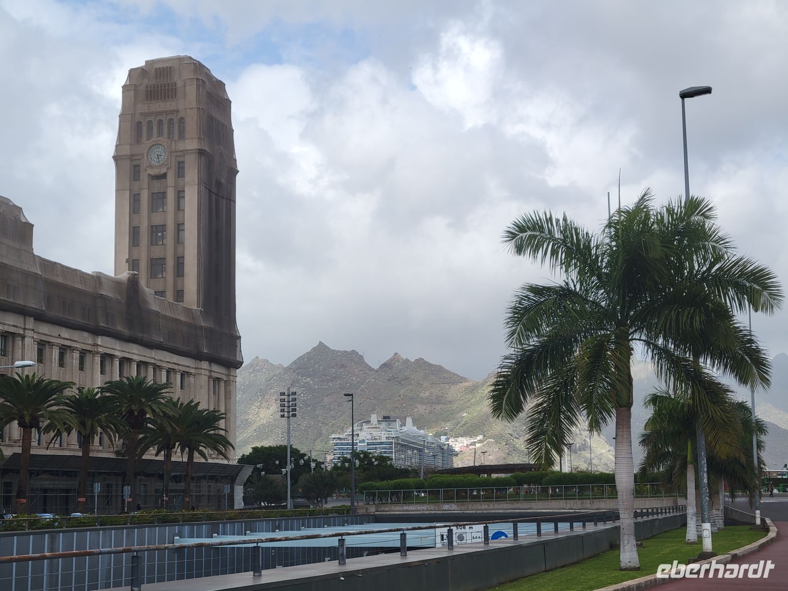 Weiter geht es in Richtung Meer zur Plaza de la Candelaría mit verschiedenen Denkmälern und interessanten Kunstobjekten und der benachbarten Plaza España. Von hier blicken wir auf den Hafen von Santa Cruz, in dem auch Kreuzfahrtschiffe anlegen.