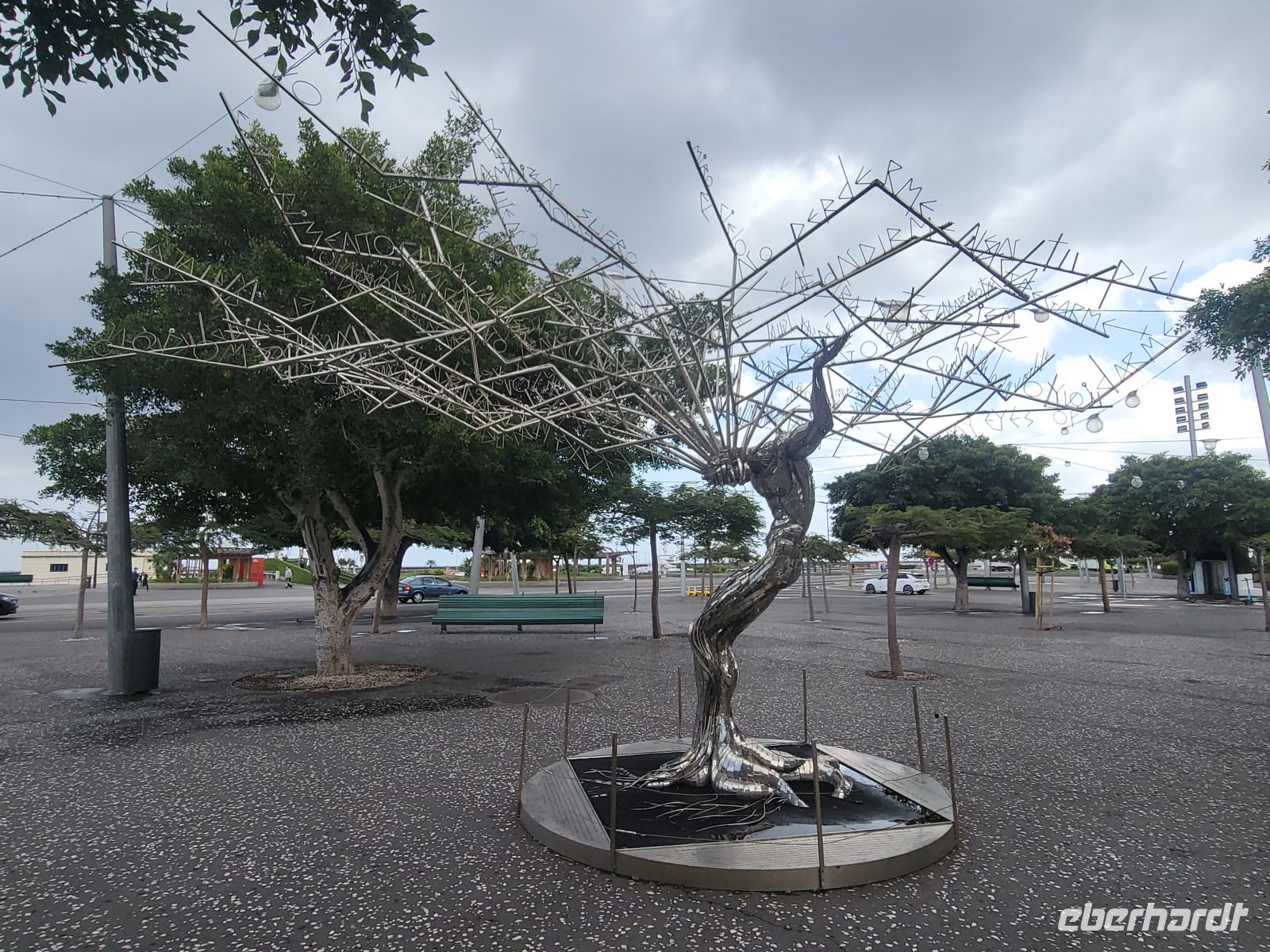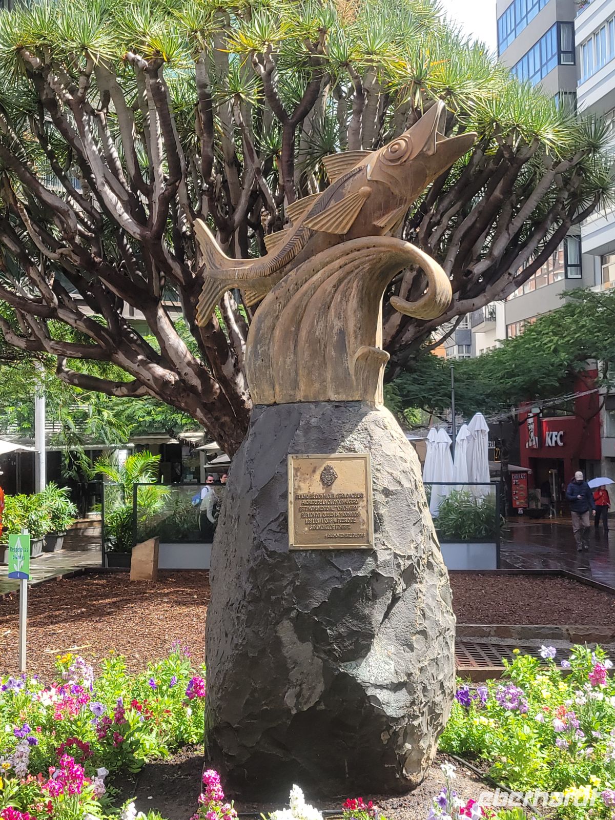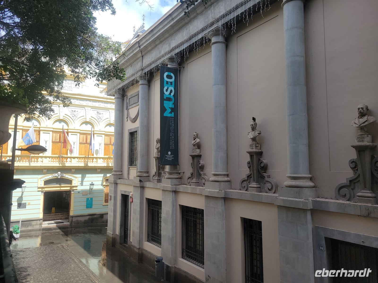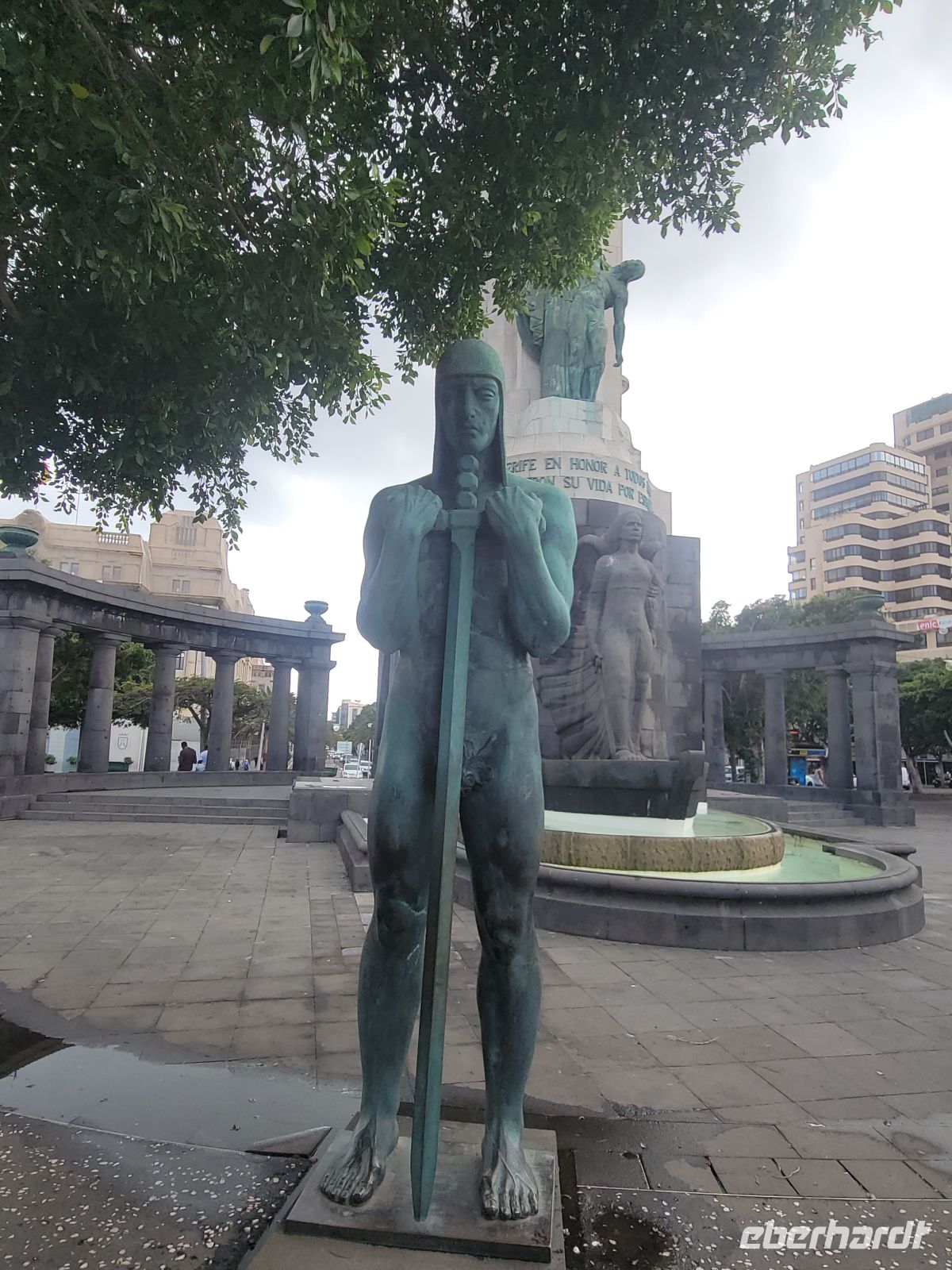 Weiter geht es in Richtung Meer zur Plaza de la Candelaría mit verschiedenen Denkmälern und interessanten Kunstobjekten und der benachbarten Plaza España. Von hier blicken wir auf den Hafen von Santa Cruz, in dem auch Kreuzfahrtschiffe anlegen.
