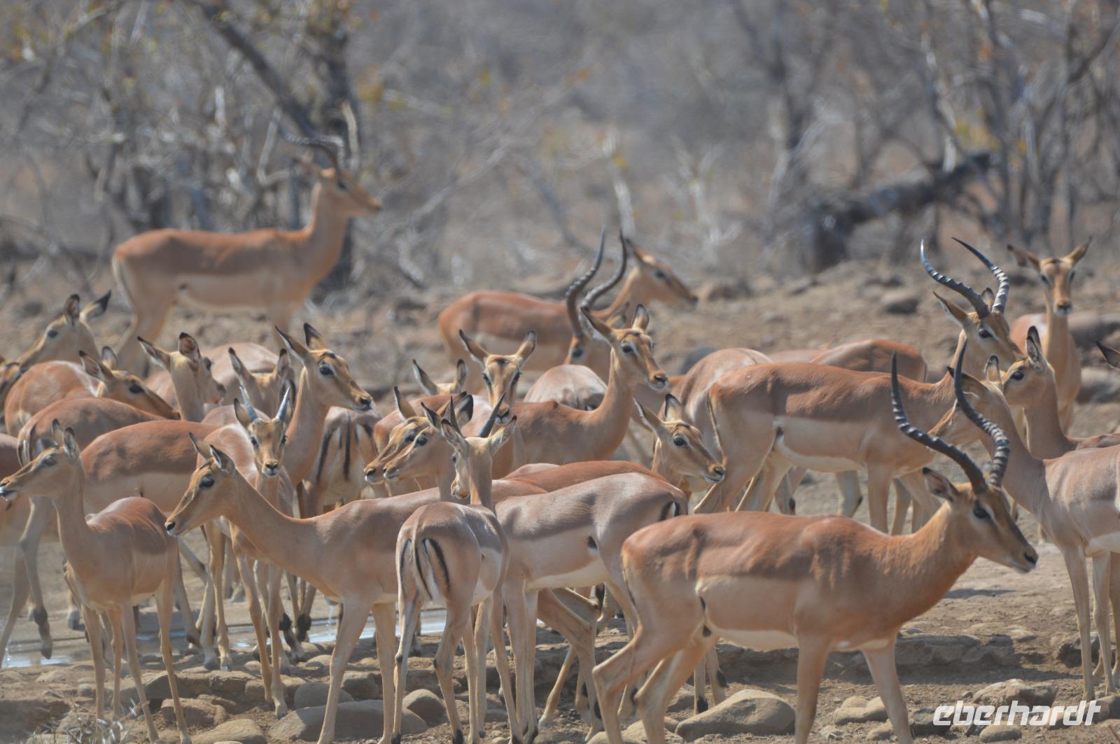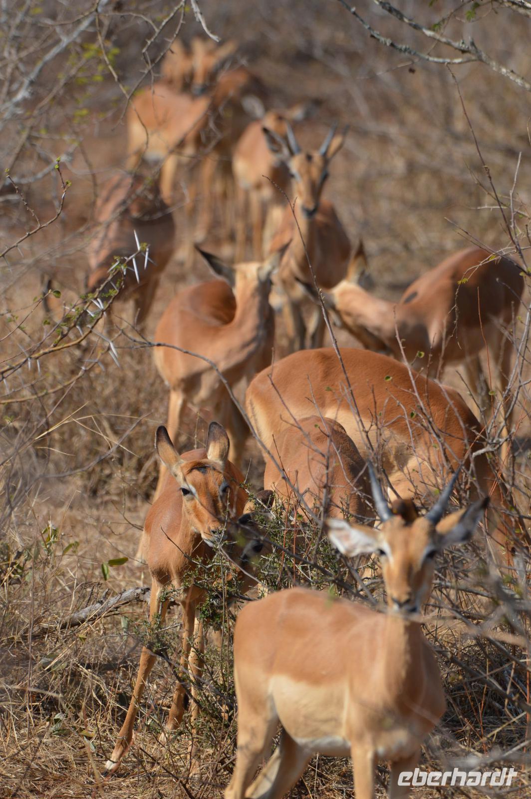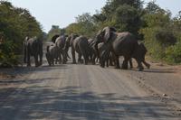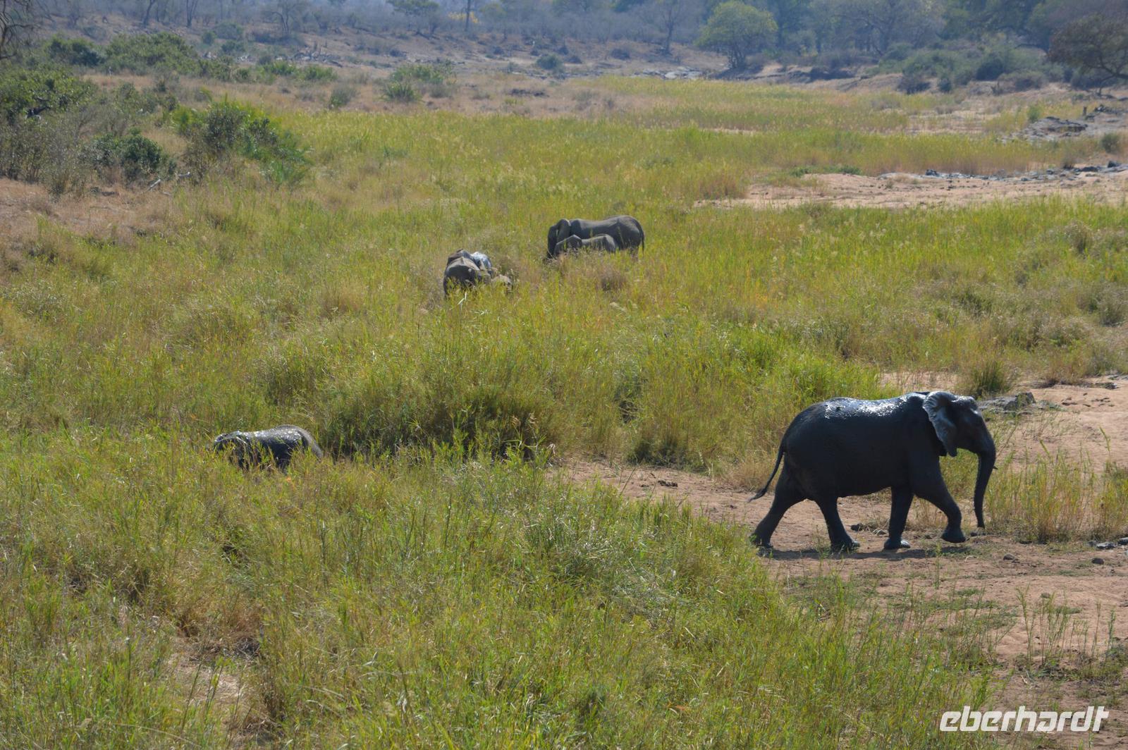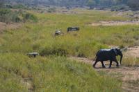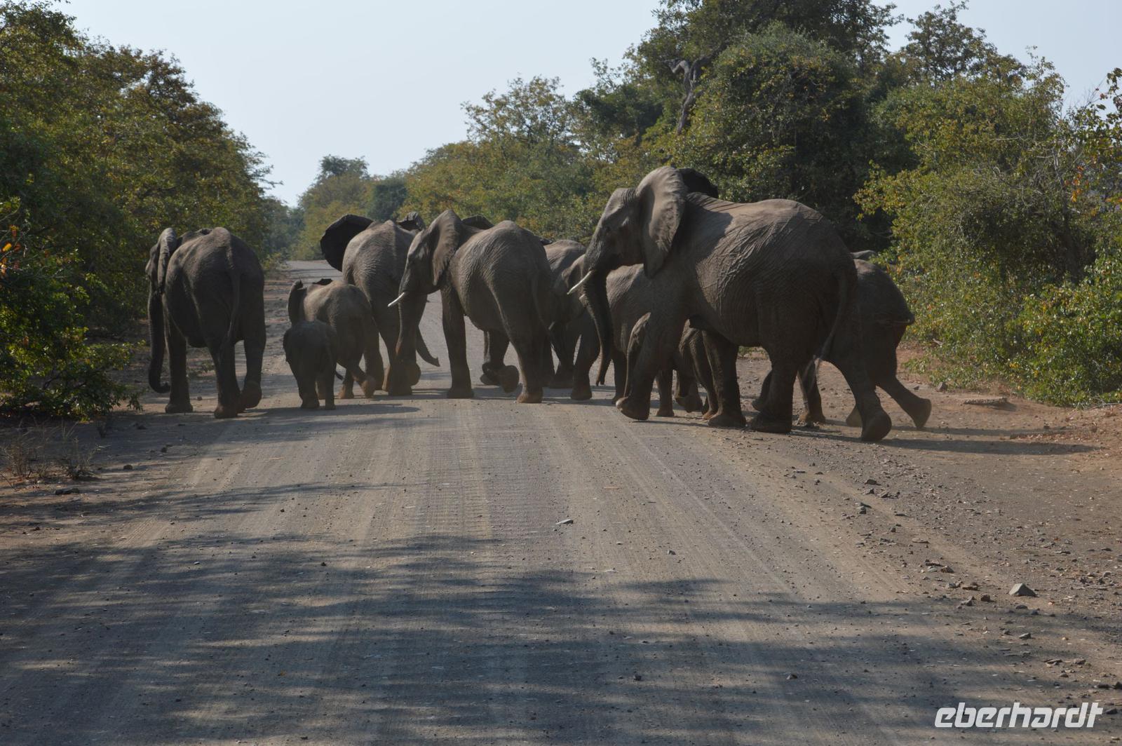 Wie immer in einem Nationalpark geht es erneut um 06.00 Uhr in den Park, so wie das Tor am Camp aufmacht. Dieser Early Morning Game Drive zeigt uns die Galeriewälder, aber relativ wenig Tiere, zunächst. Höhepunkt ist zweifelsfrei ein junger Kampfadler. Nach dem Frühstück in Satara ändert sich das aber. Edgar und der Bus sind schon weg nach Letaba und wir fahren über Staubstraßen und haben einfach ein Riesenglück: Erst einen Leoparden dicht an der Straße und dann nur wenige 100 m danach ein Löwenrudel. Dazu kommen solche besonderen Arten wie der Goliathreiher und ein Klippspringer. Lunch machen wir heute schon in Letaba, fahren dann aber anschließend mit dem Jeep weiter nach Norden. Dabei treffen wir in dem Mopaniwäldern auf diverse Gruppen von Elefanten und dann auf 4 Herden, die direkt unseren Weg kreuzen, wohl über 100 Tiere. Das wird niemand vergessen! Da uns jetzt der Jeep verlassen muß, fahren wir abends mit unserem Bus raus - und fahren zur Brücke über den Letaba River, wo wir sehr gute Vogel-, Pavian- und Antilopenbeobachtungen machen. Als Krönung beim Sundowner fliegen viele Dutzend Fledermäuse unter der Brücke hervor und werden von einem Fledermausfalken gejagt. Auf der Rückfahrt zum Camp stoppt uns eine Hyäne, die gemächlich mitten auf der Straße wandert. Ein sehr schöner Abschluß eines tollen Tages.