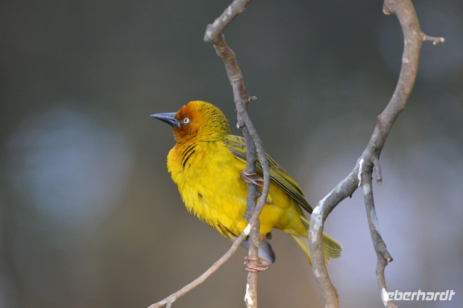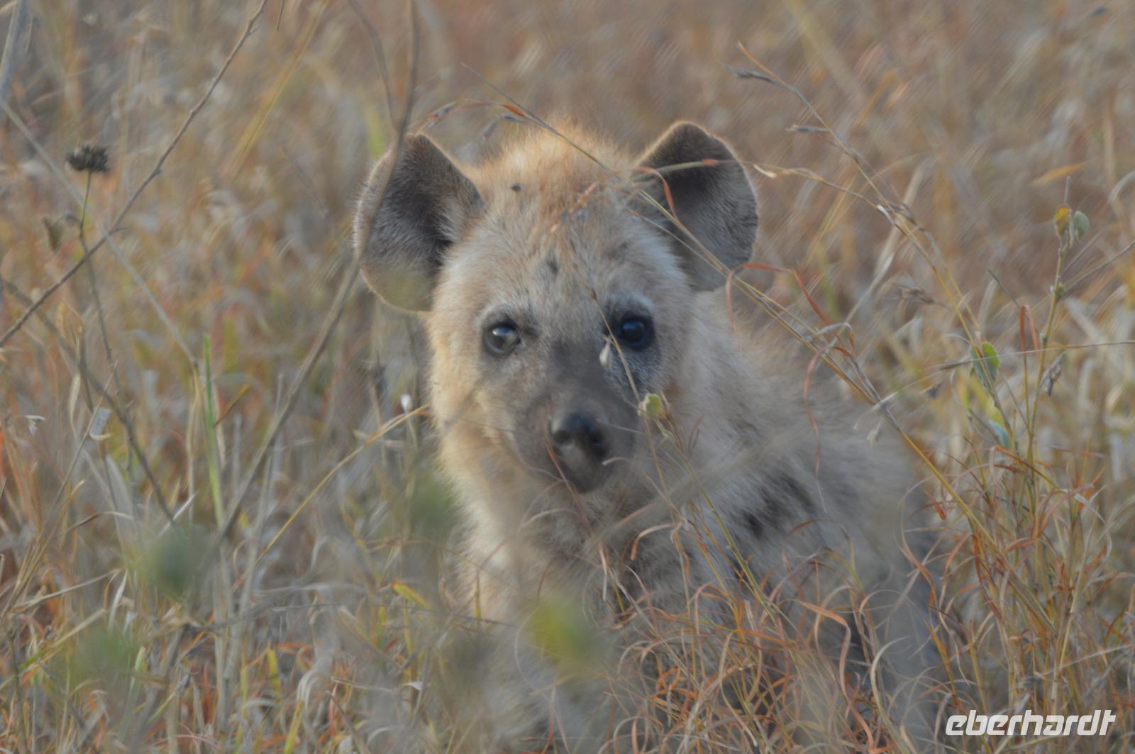 Um 06.00 Uhr fahren wir zur Early Morning Game Drive aus dem Camp. Der Höhepunkt dieser frühen Fahrt sind 4 junge Hyänen, die neugierig bis an den Wagen herankommen. Nach dem Frühstück fährt Edgar mit Bus und Gepäck nach Satara und wir mit Jeffrey und dem Jeep gehen wieder auf Safari. Neben diversen Antilopen, darunter neu für uns das kleine Steenböckchen, ist auch die Vogelwelt wieder gut vertreten, besonders mit diversen Geiern. Lunch machen wir im Camp Tskokwane. Beim Essen muß man aufpassen, dass die Glanzstare, Tauben und Tokkos nicht schneller sind als man selber! Dazu kommen die im Camp herumlaufenden Buschböcke und direkt am Camp auch Elefanten und Büffel sowie Wasserböcke. Eine traumhaft schöne Stelle. Danach geht es weiter über Makadamwege Richtung Satara. Etliche Giraffen kreuzen den Weg und Ohrengeier am Nest sieht man auch nicht alle Tage! Am Schluß läuft uns noch ein Schlankmungo über den Weg. Wieder sind wir kurz vor Toresschluß im Camp Satara, wo Edgar schon alles vorbereitet hat.