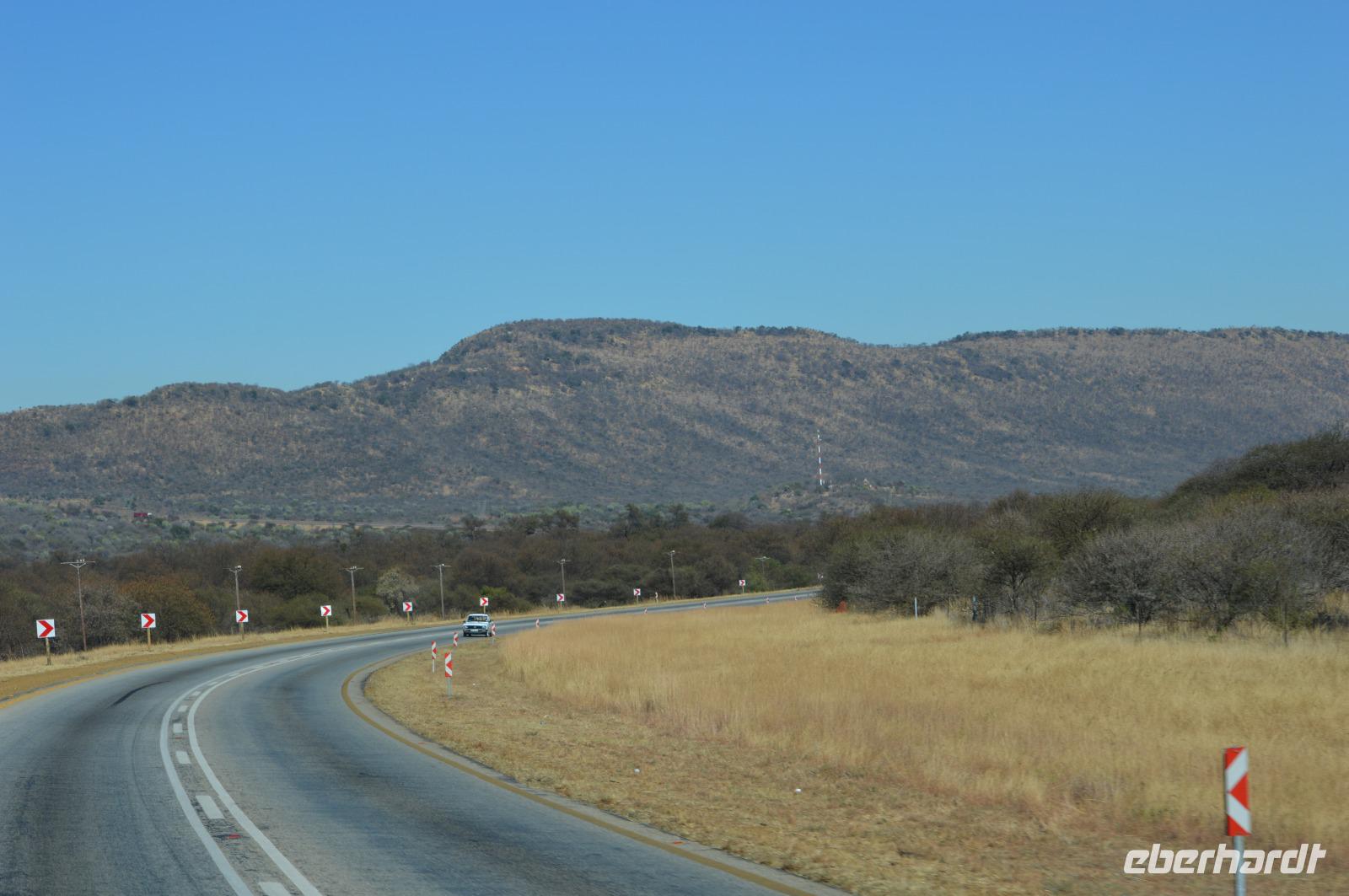 Danach fahren wir mit dem Bus aus dem Park heraus, sehen unterwegs aber noch neben den Riesentermitenhügeln der Macrotermes auch noch einen der großen alten Elefantenbullen an der Straße. Danach fahren wir noch gut 200 km durch das abwechslungsreiche Hochland und die Berge der Limpopo- und Gautengprovinz nach Mokopane, wo unser Hotel ist.