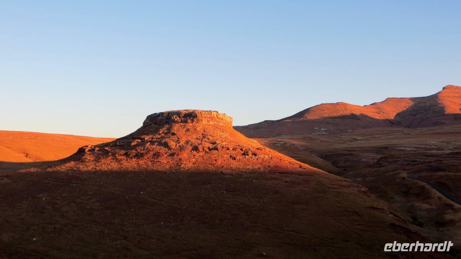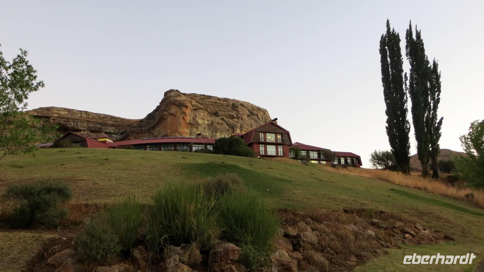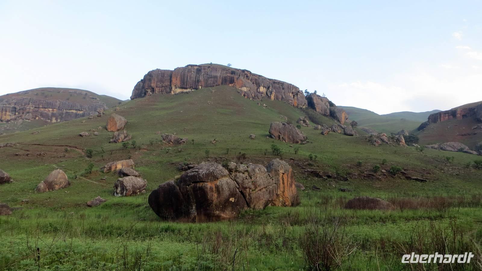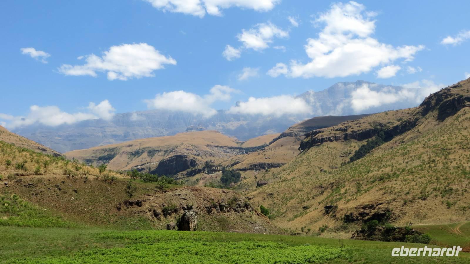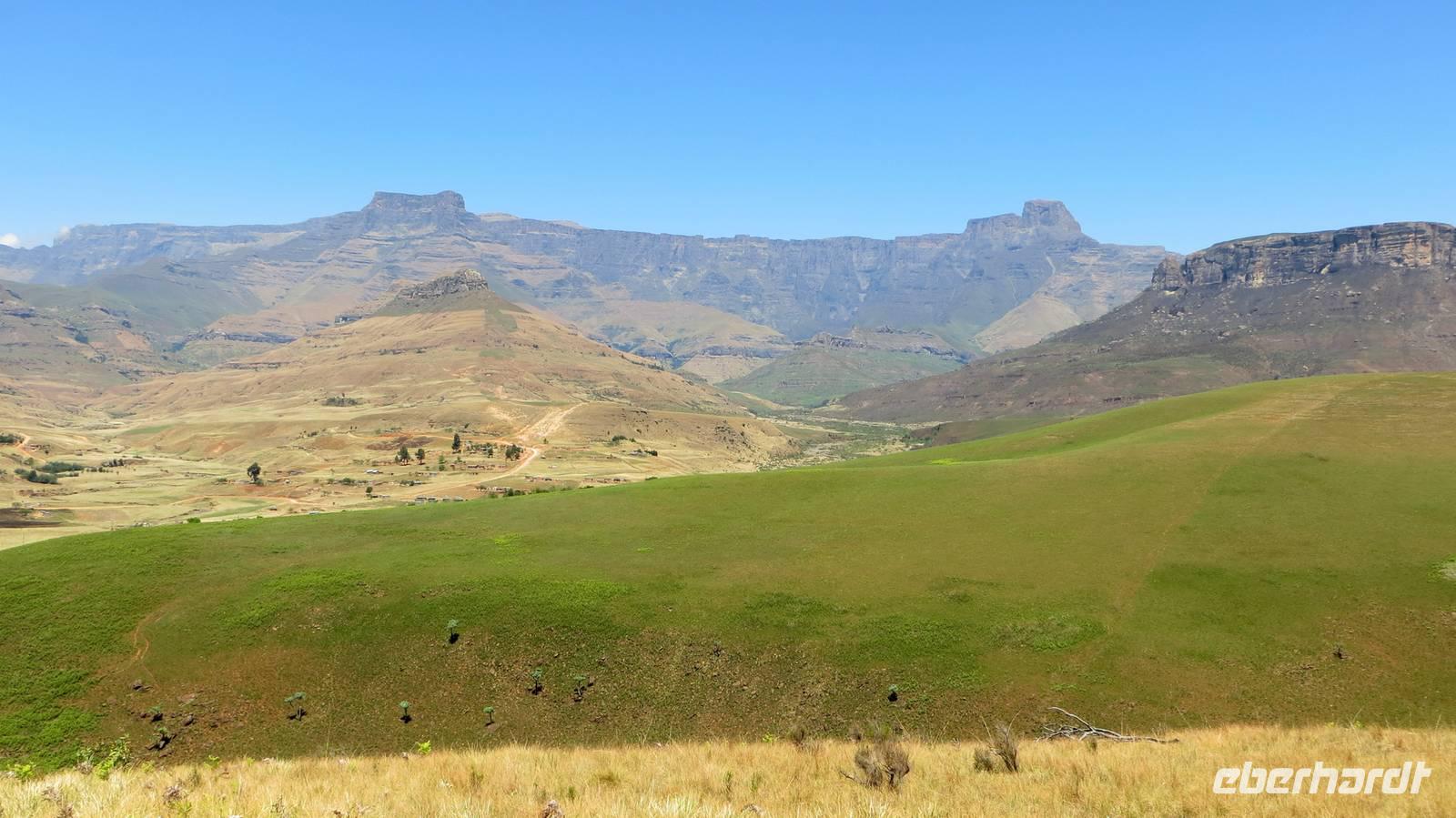 Wie eine uneinnehmbare Festung ragen die Felswand des Amphitheaters auf. Das Bergpanorama erinnert etwas an die Dolomiten. Am Abend erreichen wir unsere Lodge am Fuße von Giants Castle.