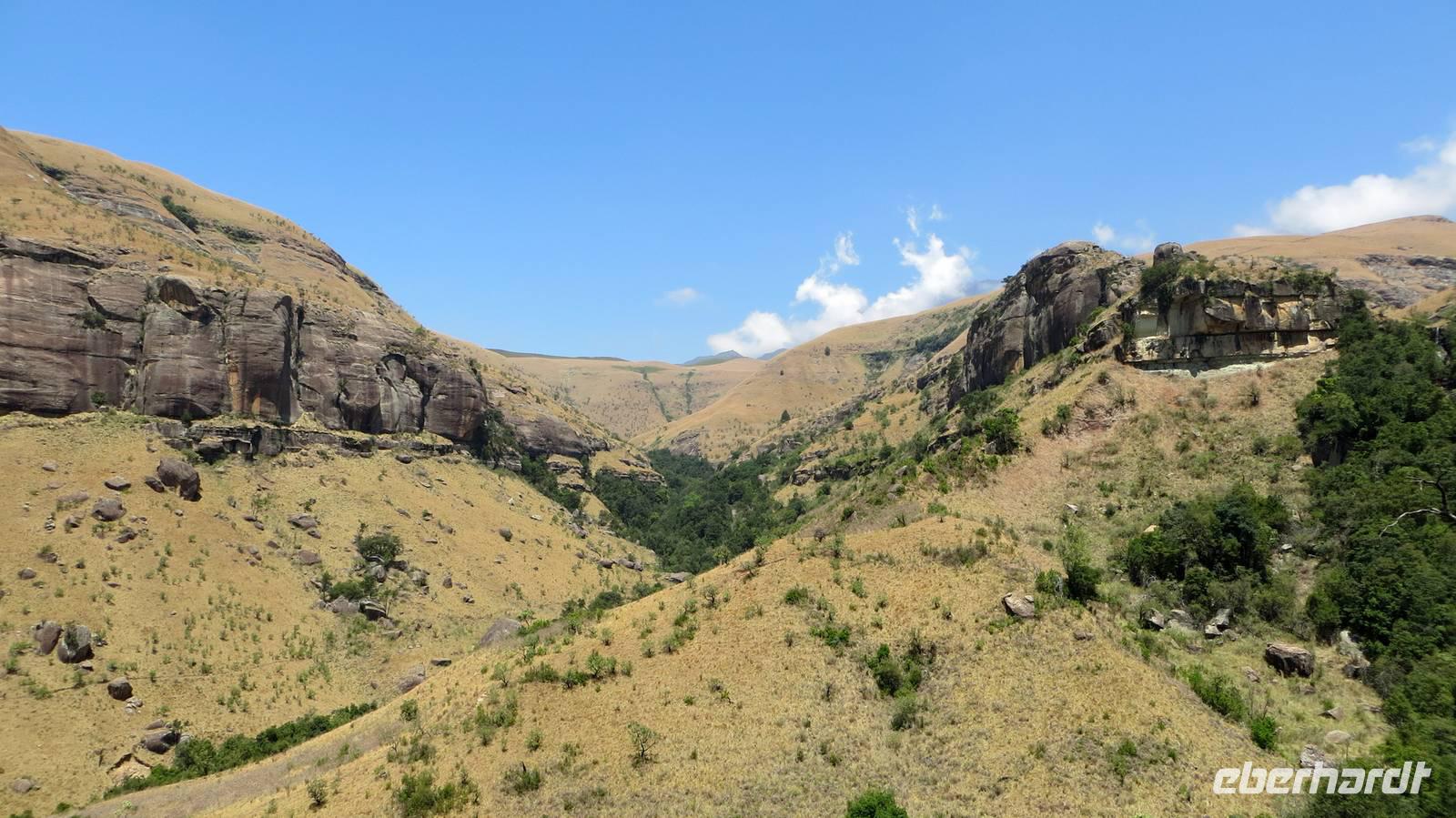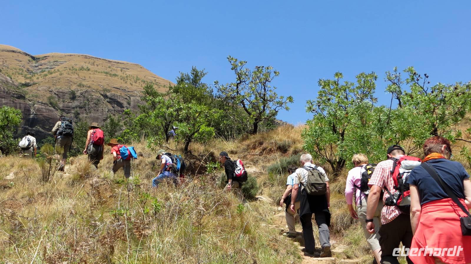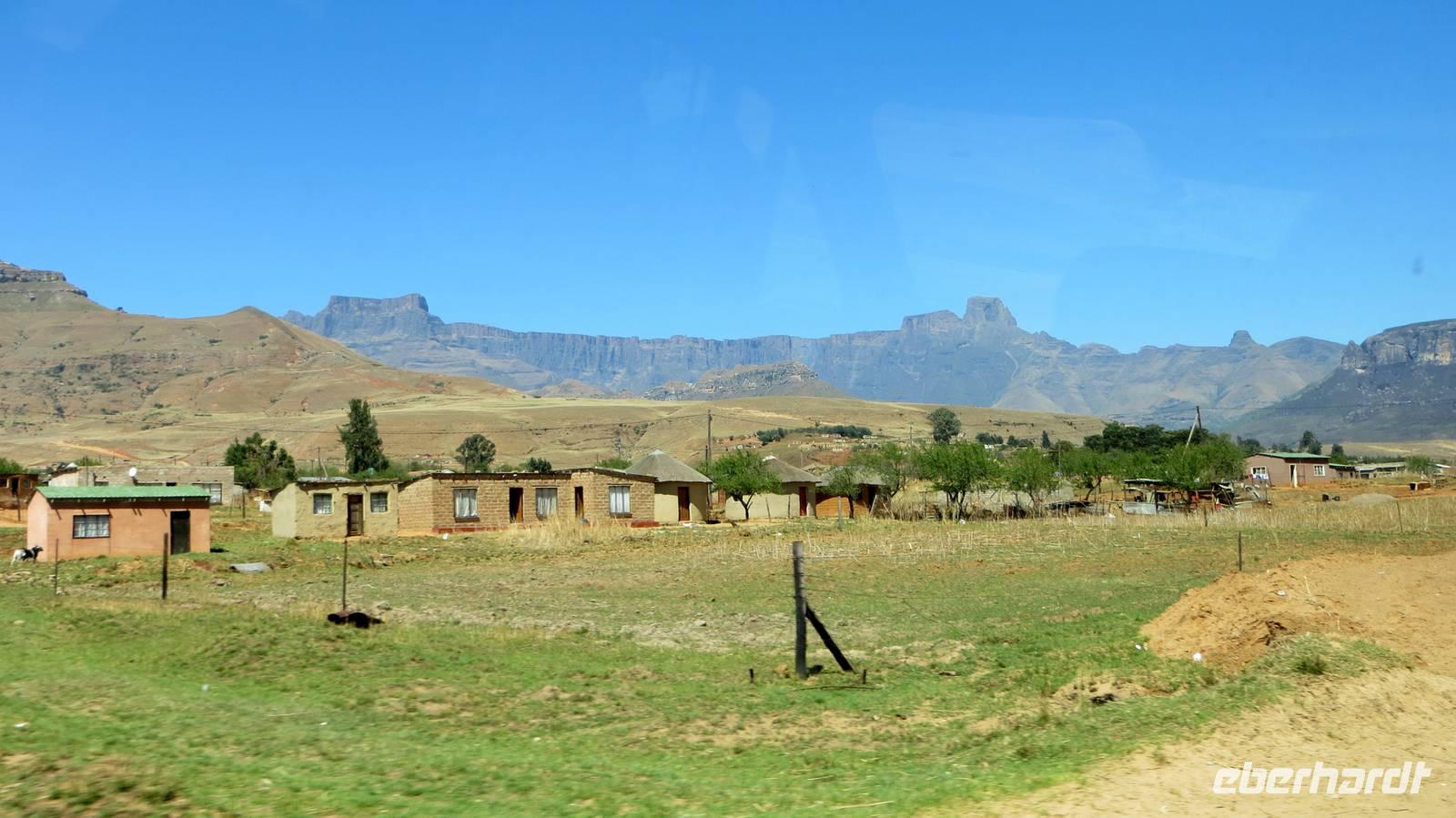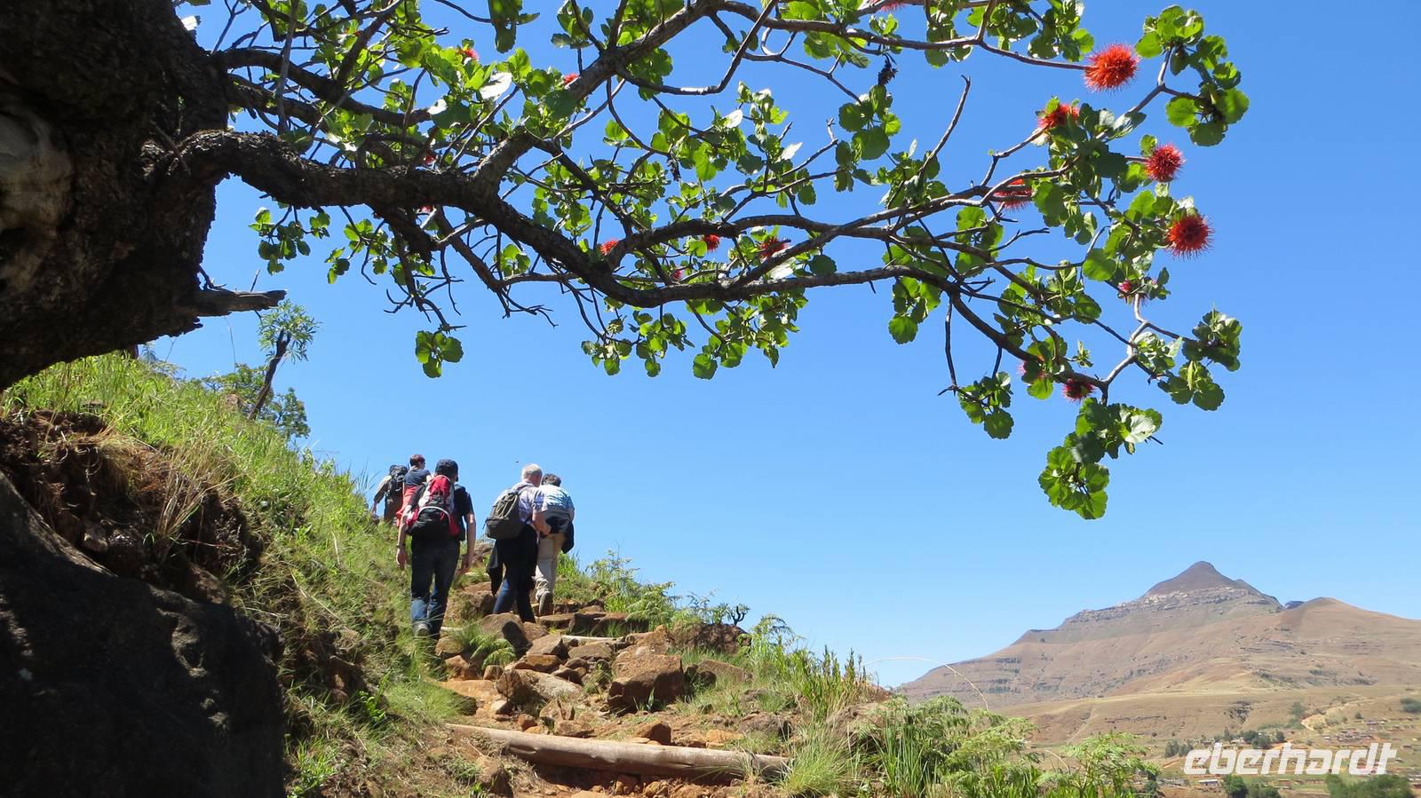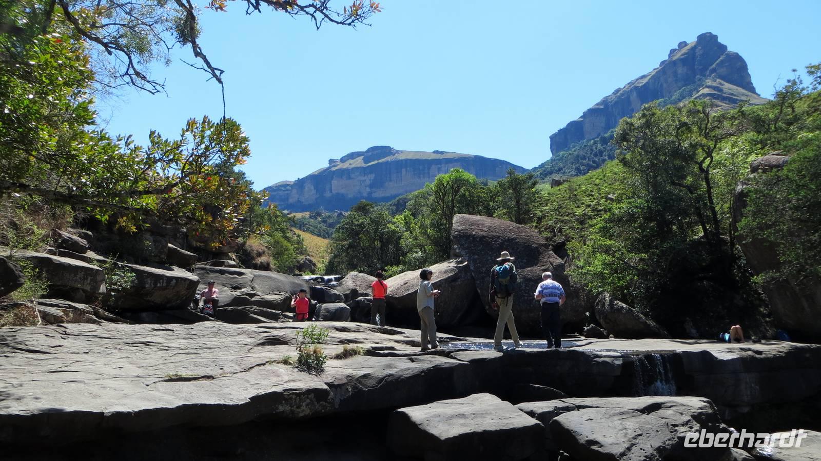 Von Giants Castle fahren wir vorbei an kleineren Siedlungen bis nach Cathedral Peak. Die Menschen leben überwiegend in sehr einfachen Behausungen, zum Teil in den typischen Rundhütten der Zulu. Immer wieder wird uns freundlich gewunken. Wir befinden uns in den zentralen Drakensbergen mit steil aufragenden Felsen. Die höchsten Gipfel wie Cathedral Peak und The Bell sind über 3.000 Meter hoch. Unsere Wanderung führt uns am Fuße der Berge zu den Doreen Falls. Bei einem extra Abstecher kann man noch einmal gut erhaltene Felszeichnungen der San anschauen. Die Hänge sind gespickt mit Proteen und Kohlbäumen.