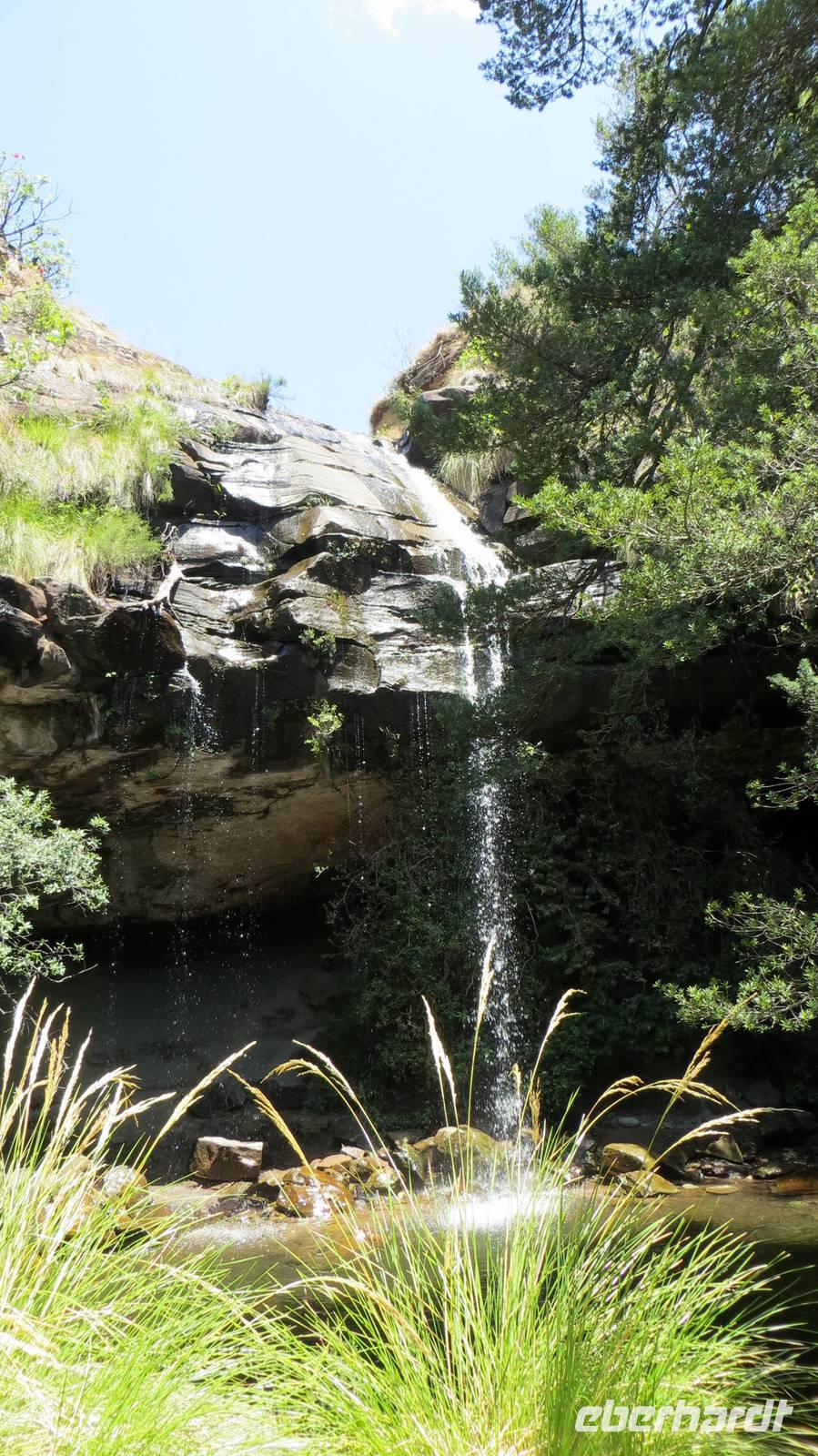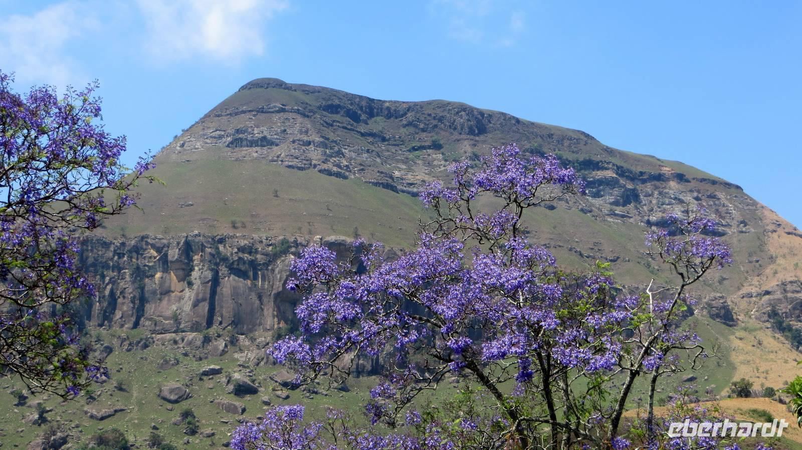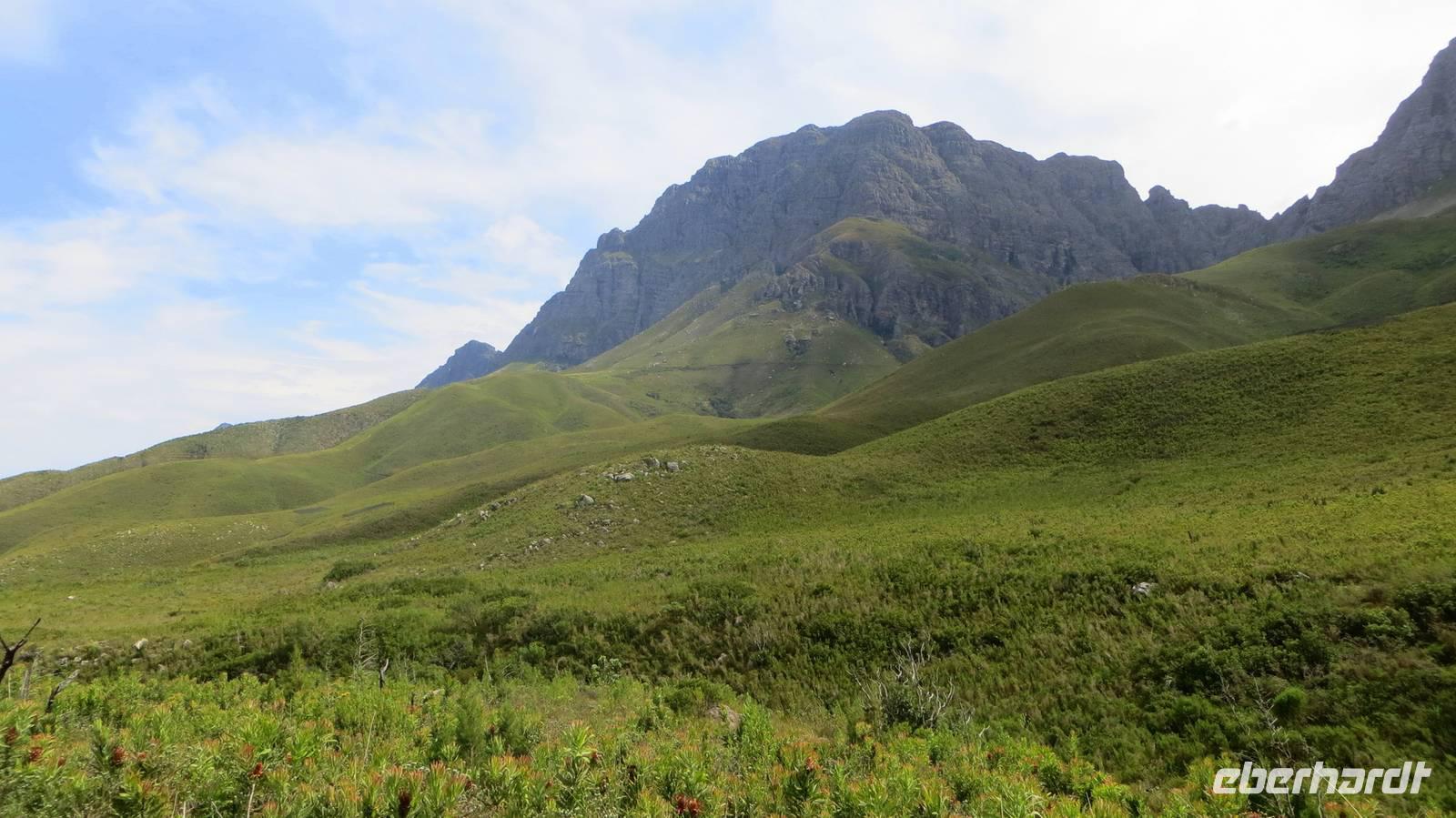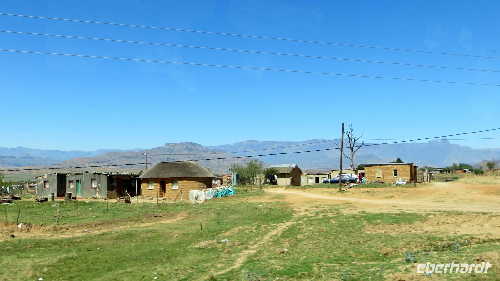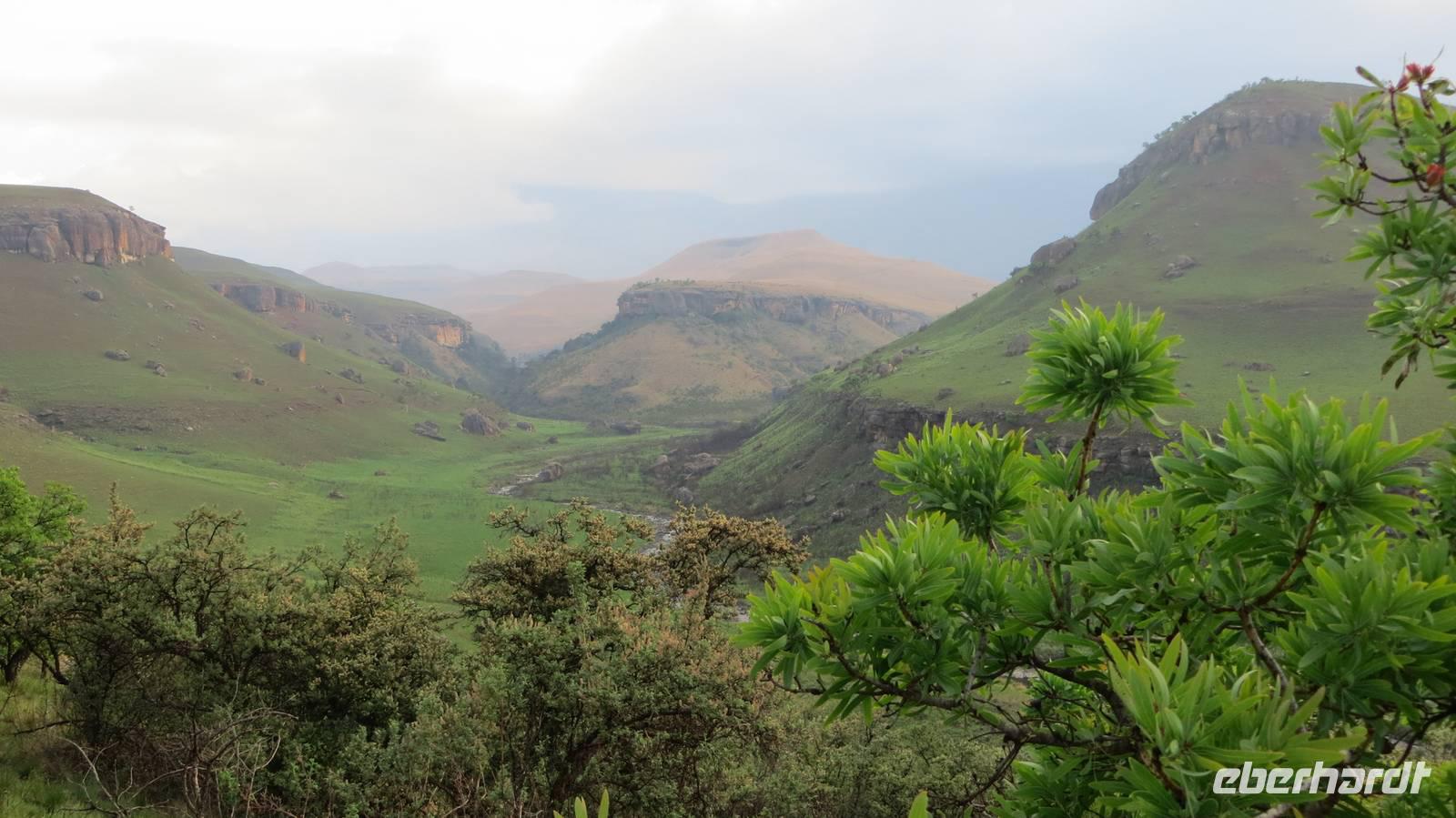 Von Giants Castle fahren wir vorbei an kleineren Siedlungen bis nach Cathedral Peak. Die Menschen leben überwiegend in sehr einfachen Behausungen, zum Teil in den typischen Rundhütten der Zulu. Immer wieder wird uns freundlich gewunken. Wir befinden uns in den zentralen Drakensbergen mit steil aufragenden Felsen. Die höchsten Gipfel wie Cathedral Peak und The Bell sind über 3.000 Meter hoch. Unsere Wanderung führt uns am Fuße der Berge zu den Doreen Falls. Bei einem extra Abstecher kann man noch einmal gut erhaltene Felszeichnungen der San anschauen. Die Hänge sind gespickt mit Proteen und Kohlbäumen.