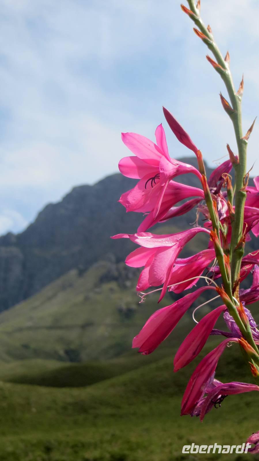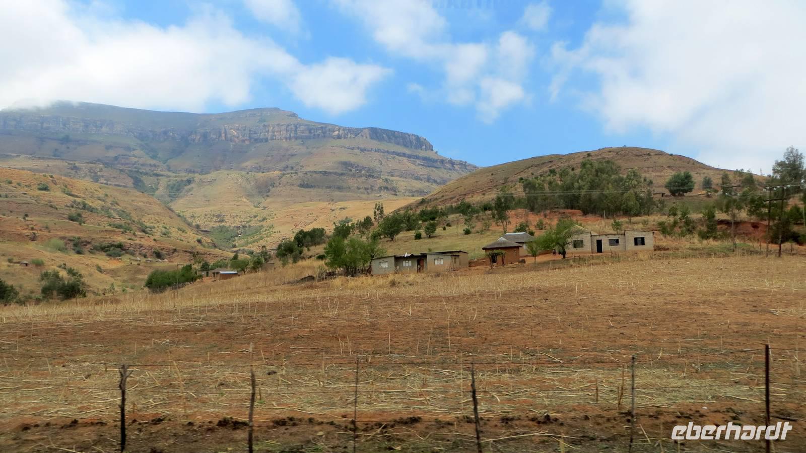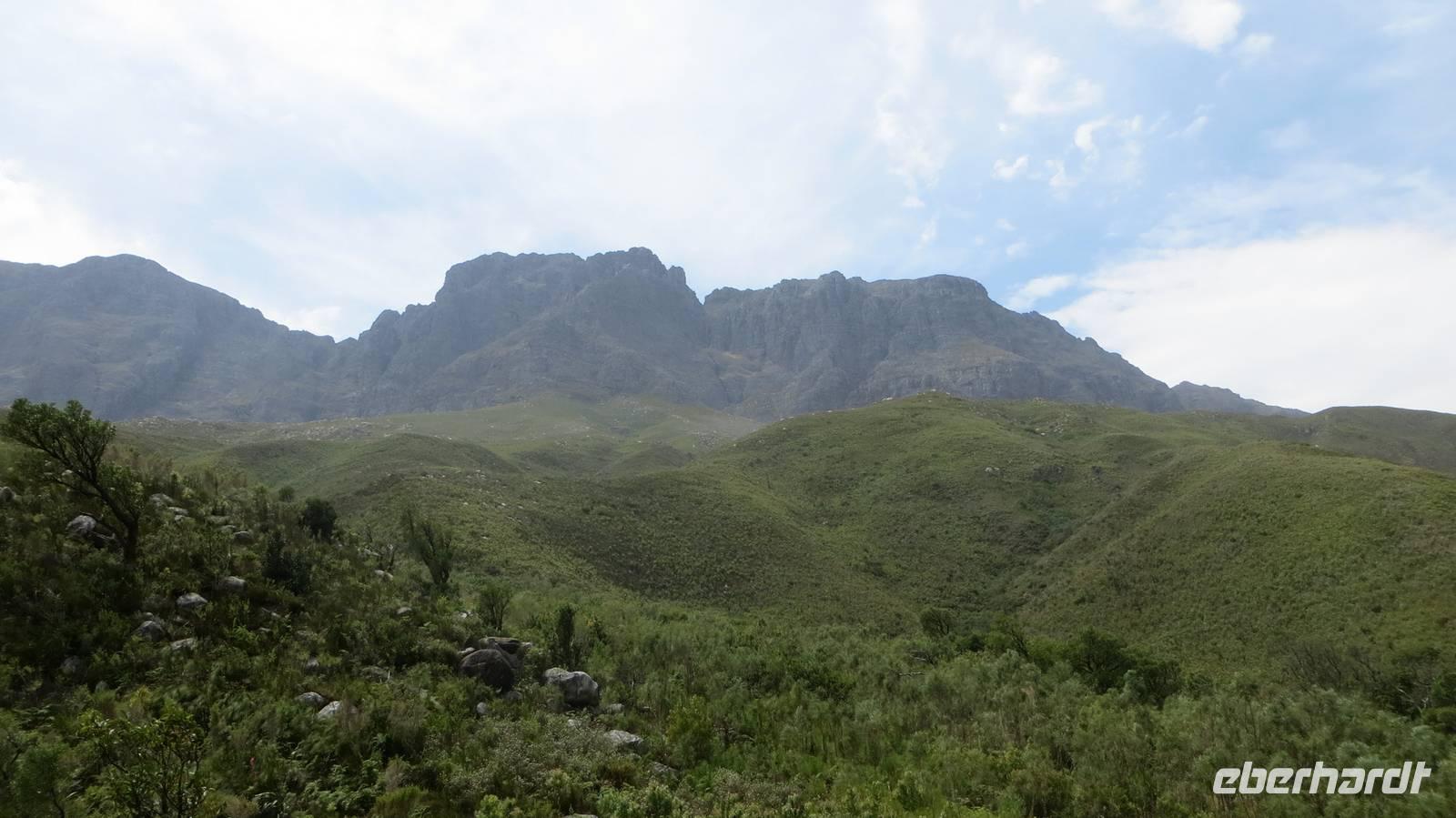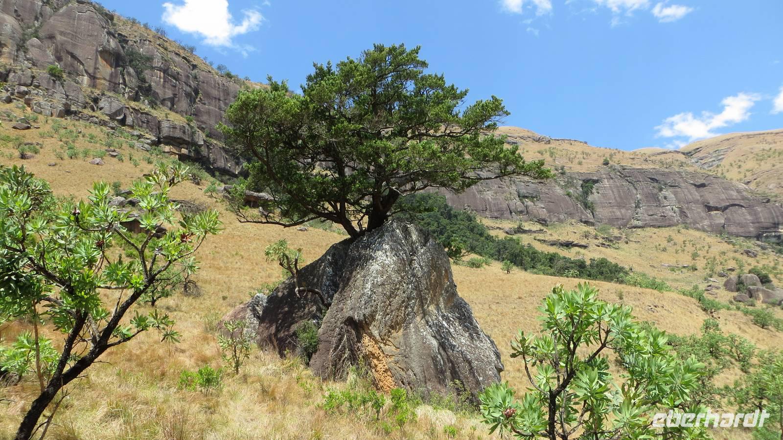 Von Giants Castle fahren wir vorbei an kleineren Siedlungen bis nach Cathedral Peak. Die Menschen leben überwiegend in sehr einfachen Behausungen, zum Teil in den typischen Rundhütten der Zulu. Immer wieder wird uns freundlich gewunken. Wir befinden uns in den zentralen Drakensbergen mit steil aufragenden Felsen. Die höchsten Gipfel wie Cathedral Peak und The Bell sind über 3.000 Meter hoch. Unsere Wanderung führt uns am Fuße der Berge zu den Doreen Falls. Bei einem extra Abstecher kann man noch einmal gut erhaltene Felszeichnungen der San anschauen. Die Hänge sind gespickt mit Proteen und Kohlbäumen.