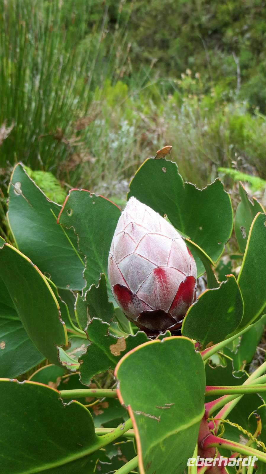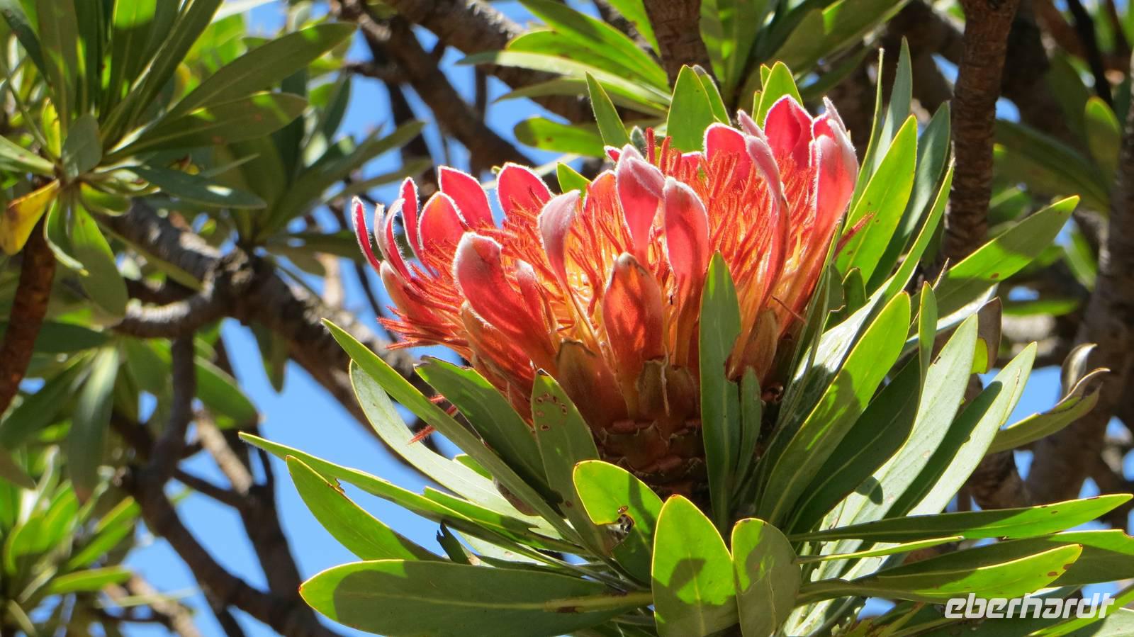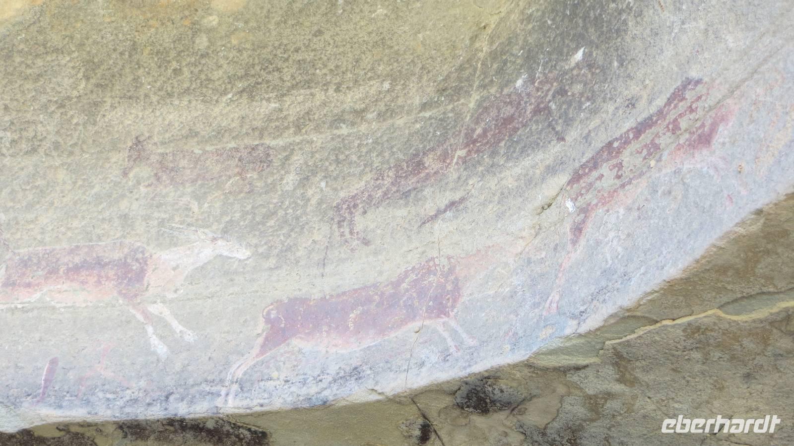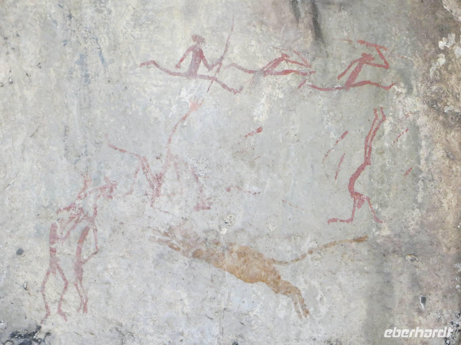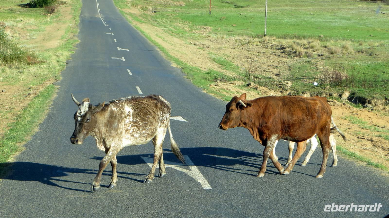 Von Giants Castle fahren wir vorbei an kleineren Siedlungen bis nach Cathedral Peak. Die Menschen leben überwiegend in sehr einfachen Behausungen, zum Teil in den typischen Rundhütten der Zulu. Immer wieder wird uns freundlich gewunken. Wir befinden uns in den zentralen Drakensbergen mit steil aufragenden Felsen. Die höchsten Gipfel wie Cathedral Peak und The Bell sind über 3.000 Meter hoch. Unsere Wanderung führt uns am Fuße der Berge zu den Doreen Falls. Bei einem extra Abstecher kann man noch einmal gut erhaltene Felszeichnungen der San anschauen. Die Hänge sind gespickt mit Proteen und Kohlbäumen.
