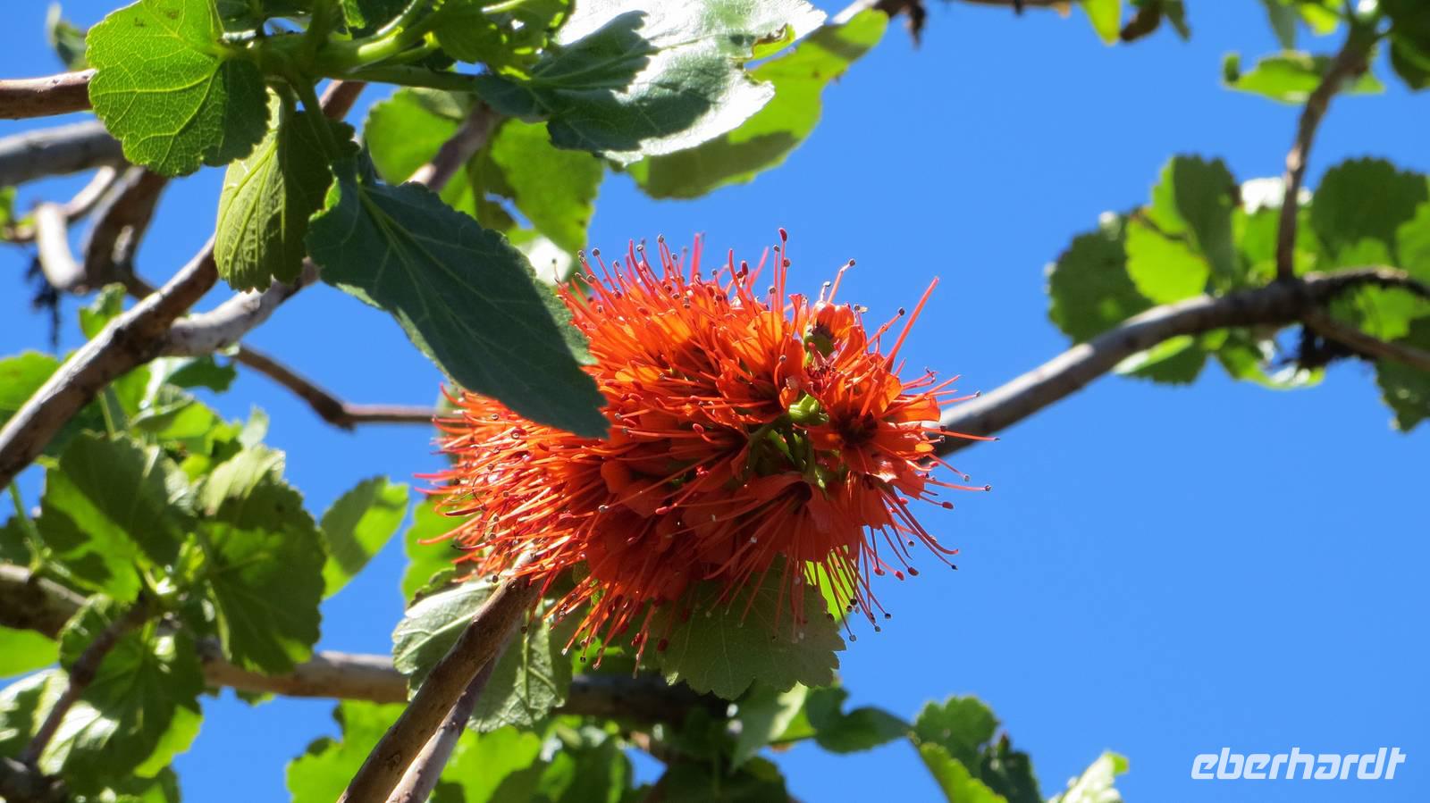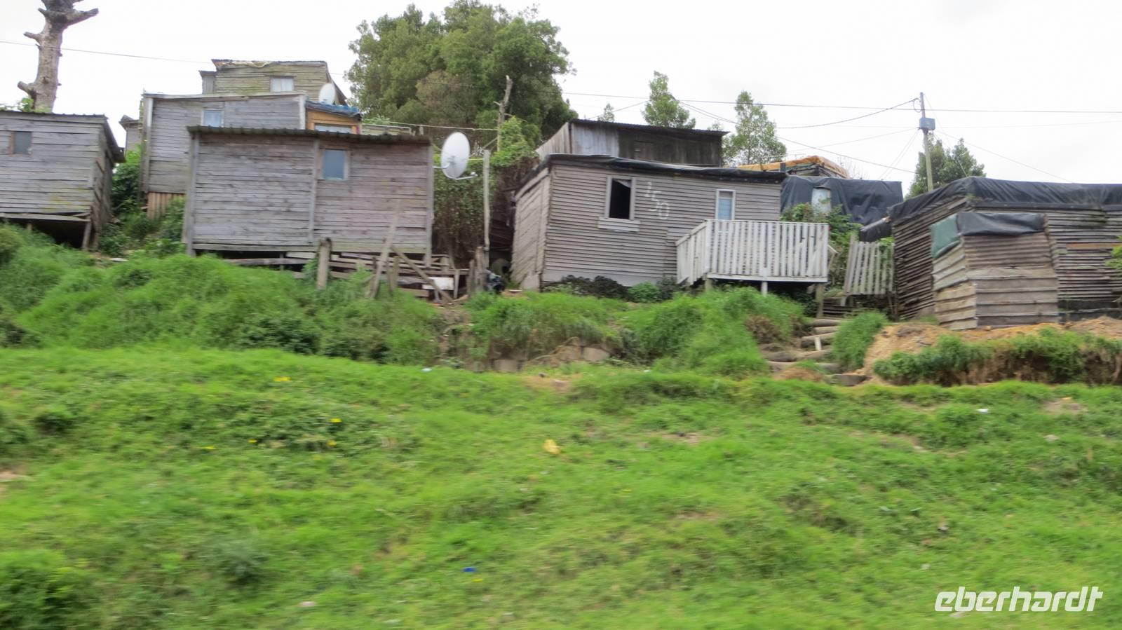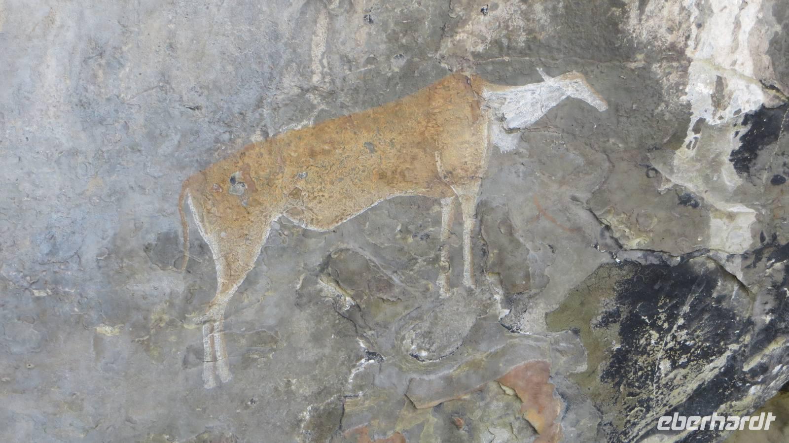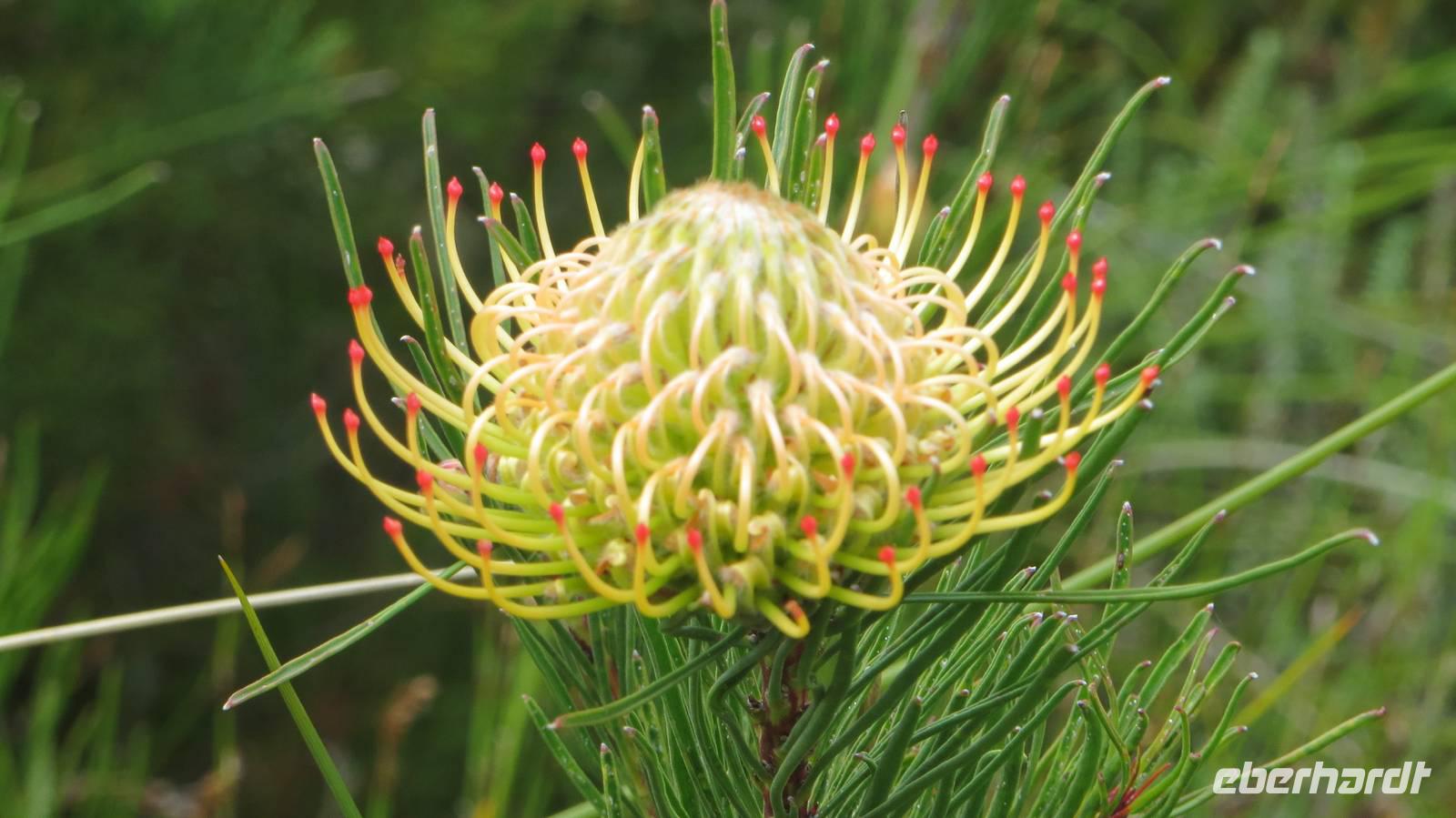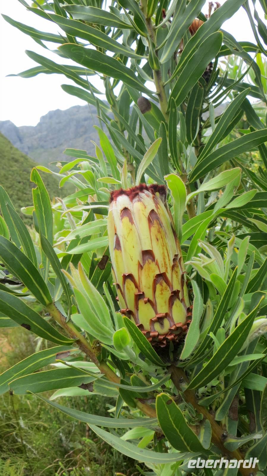 Von Giants Castle fahren wir vorbei an kleineren Siedlungen bis nach Cathedral Peak. Die Menschen leben überwiegend in sehr einfachen Behausungen, zum Teil in den typischen Rundhütten der Zulu. Immer wieder wird uns freundlich gewunken. Wir befinden uns in den zentralen Drakensbergen mit steil aufragenden Felsen. Die höchsten Gipfel wie Cathedral Peak und The Bell sind über 3.000 Meter hoch. Unsere Wanderung führt uns am Fuße der Berge zu den Doreen Falls. Bei einem extra Abstecher kann man noch einmal gut erhaltene Felszeichnungen der San anschauen. Die Hänge sind gespickt mit Proteen und Kohlbäumen.
