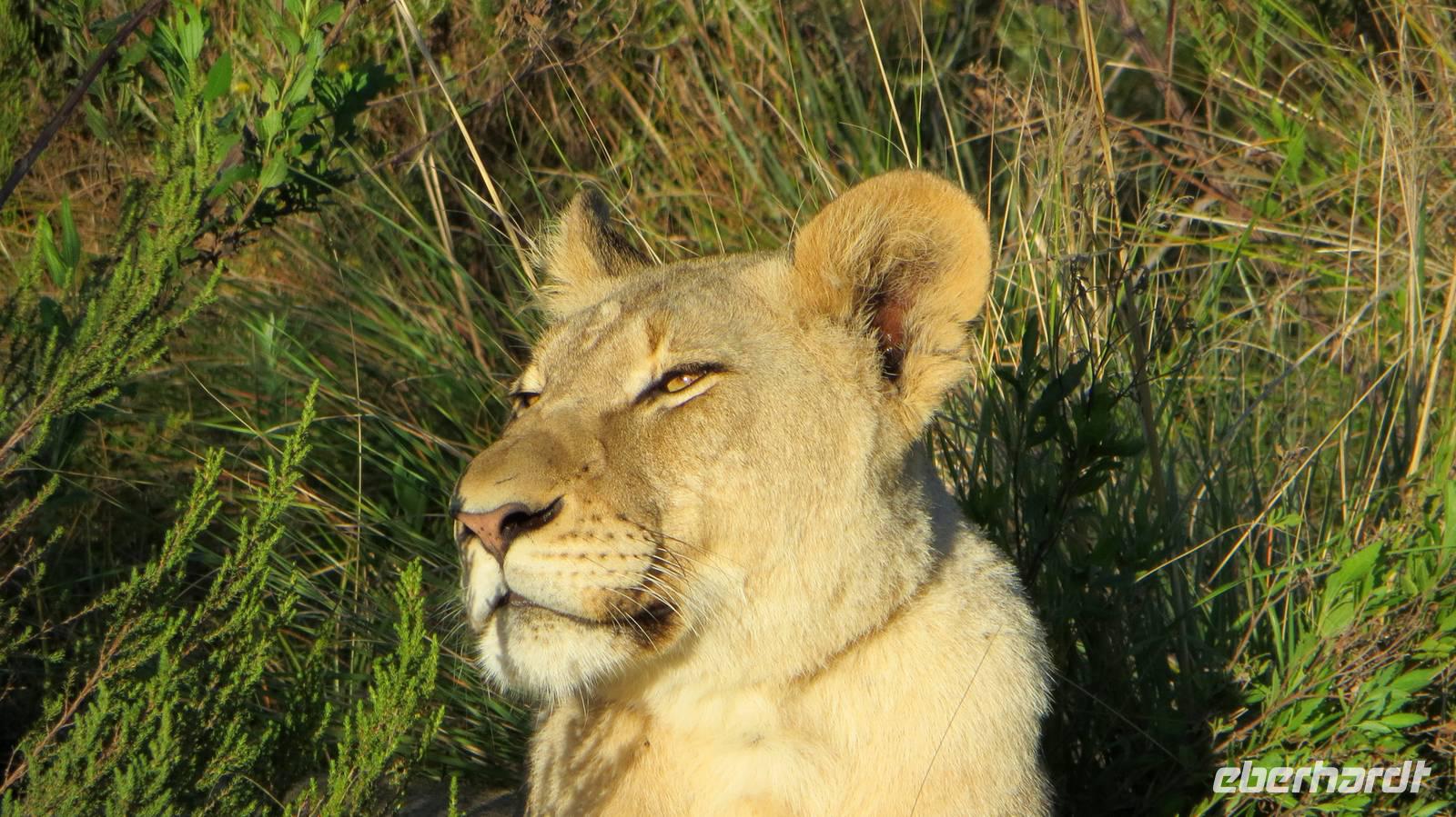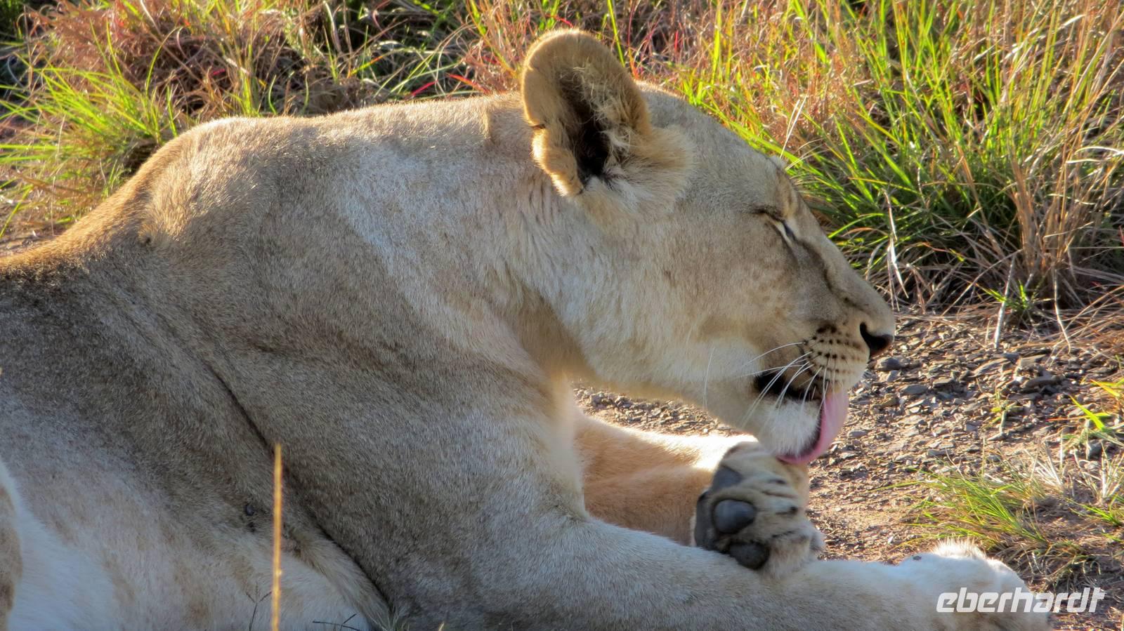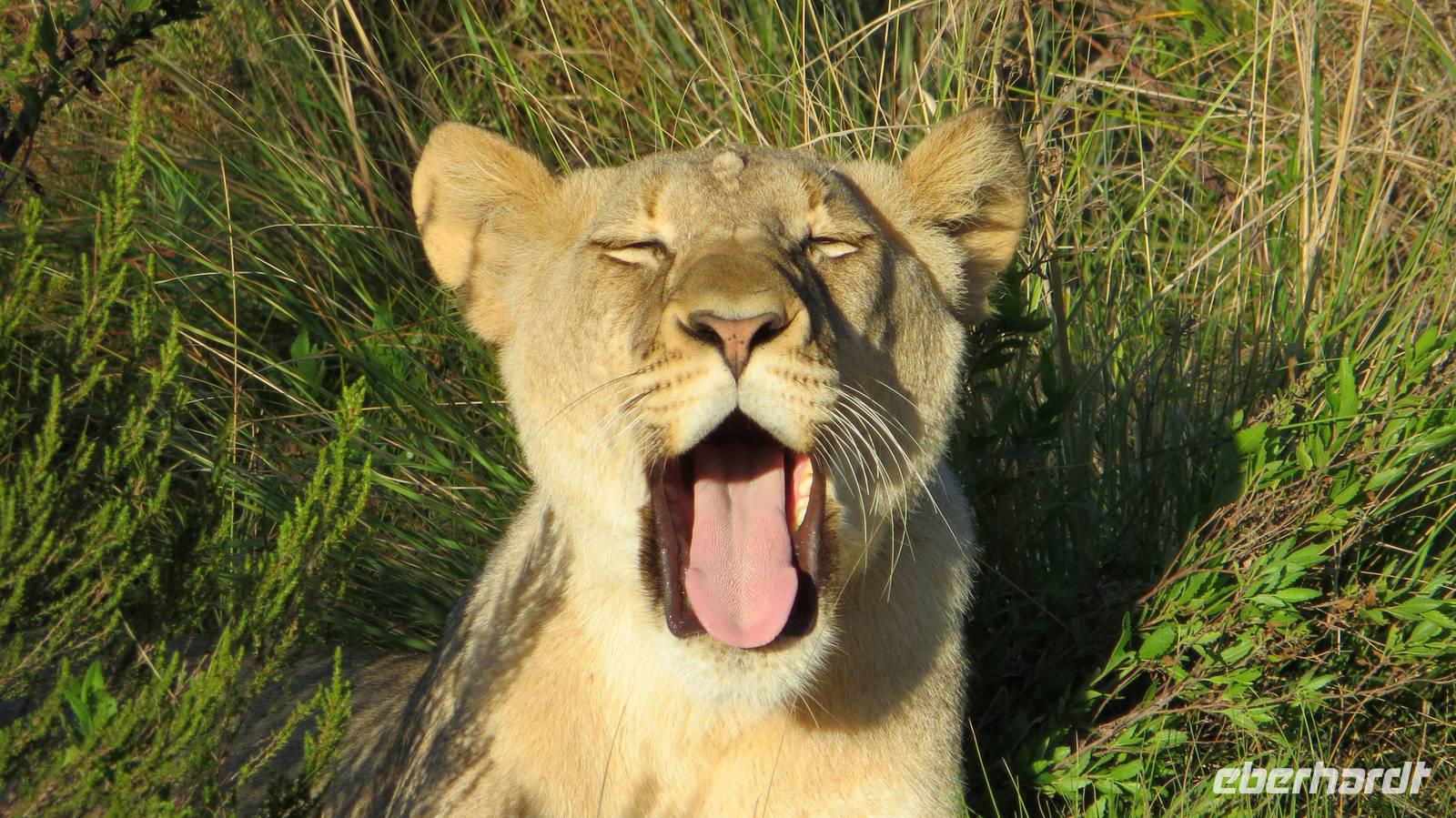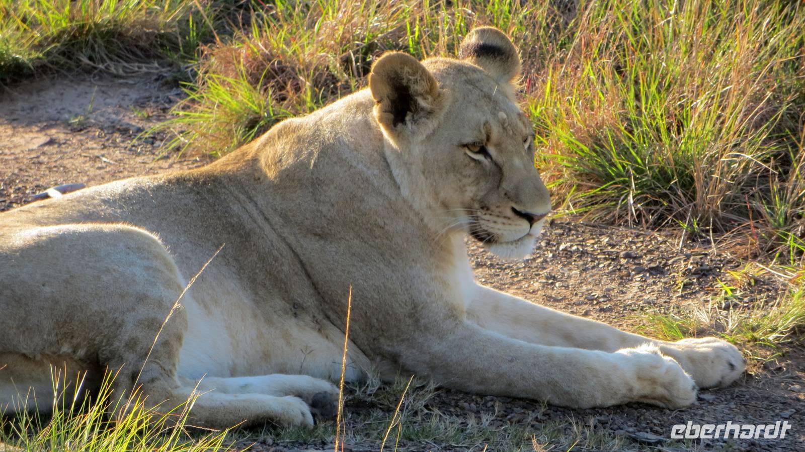 Schon früh am Morgen beginnen wir unsere Safari - heute geht es in das zweite Areal des Parks, wo es auch Löwen gibt! Augen auf... und siehe da, in der Ferne entdecken wir zwei Löwen! Wir fahren näher heran und können die beiden Geschwister beim Rumtollen beobachten. Die Großkatzen kommen ganz nah an den Jeep heran, so dass mir fast ein bisschen mulmig zumute wird. Es ist ein großartiges Erlebnis und wir sind voller Freude! Danach legen wir erstmal eine Kaffeepause ein und stärken uns mit leckeren Muffins. Das Glück ist auf unserer Seite, denn bald darauf sehen wir ein Breitmaulnashorn mit seinem Jungen... ein echtes Riesenbaby. Um die Nashörner vor Wilderern zu schützen, werden ihnen hier kontrolliert die Hörner abgesägt. Was zunächst grausam klingt, ist letztendlich nur zu deren Schutz. Das nächste Highlight lässt nicht lange auf sich warten und wir sehen zwei Elefanten, die aber so schnell verschwunden sind, wie sie aufgetaucht sind. Dafür erfreuen wir uns an den hübschen Impalas, ein paar Zebras und einer Leopardenschildkröte. Zum Abschluss der Pirsch zeigt sich noch ein Hippo in einem kleinen Teich nahe der Rezeption, so kann man sagen, dass wir eine ausgesprochen erfolgreiche Safari hatten! Vier der Big Five sind damit schon „im Kasten"! Nach dem Frühstück können wir die Annehmlichkeiten der wunderschönen Lodge genießen und einfach mal entspannen, bis es nach dem Mittagessen noch einmal auf die Pirsch geht.