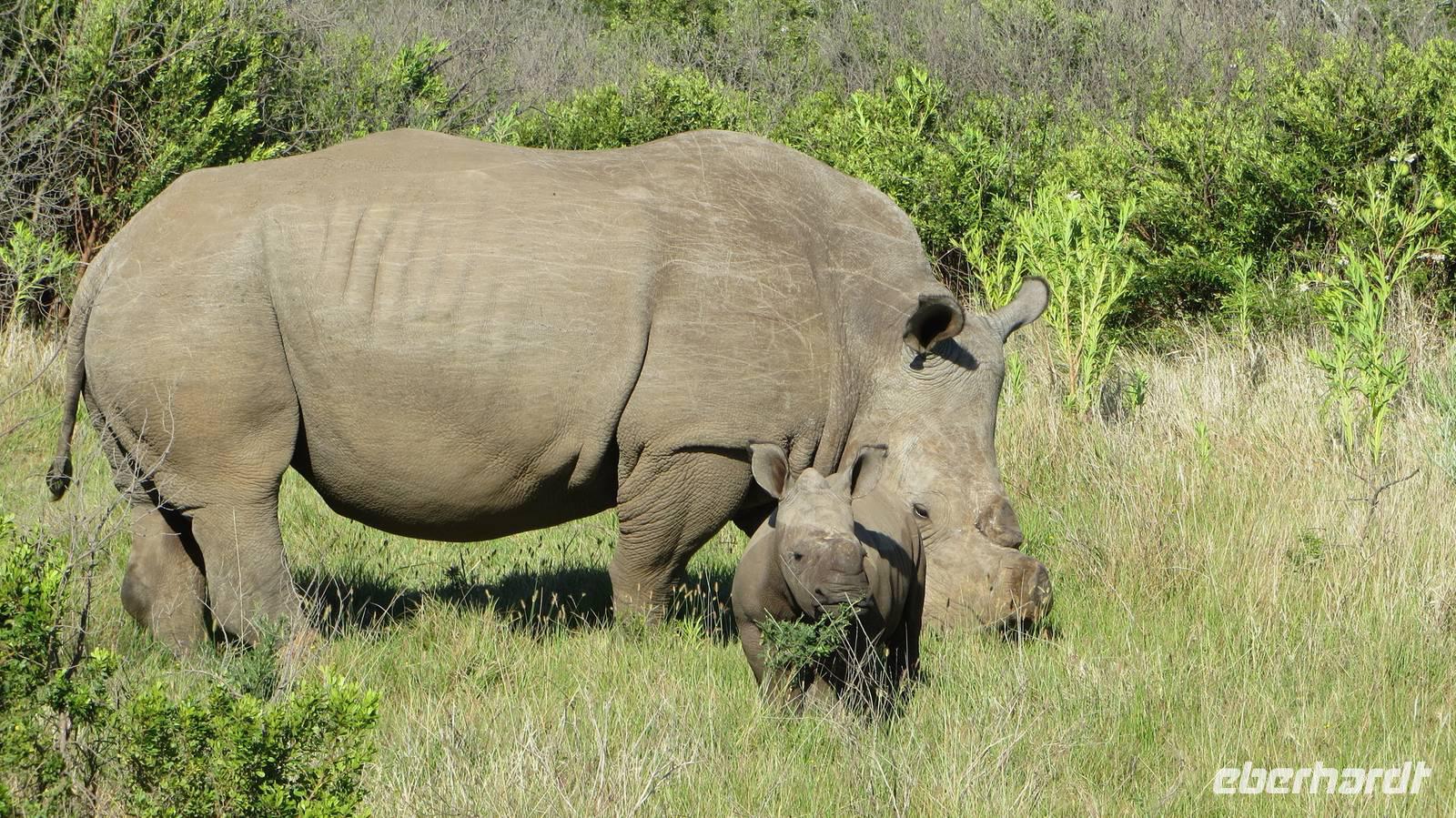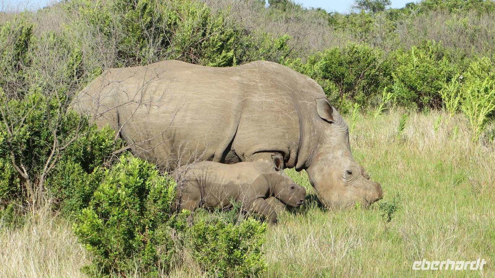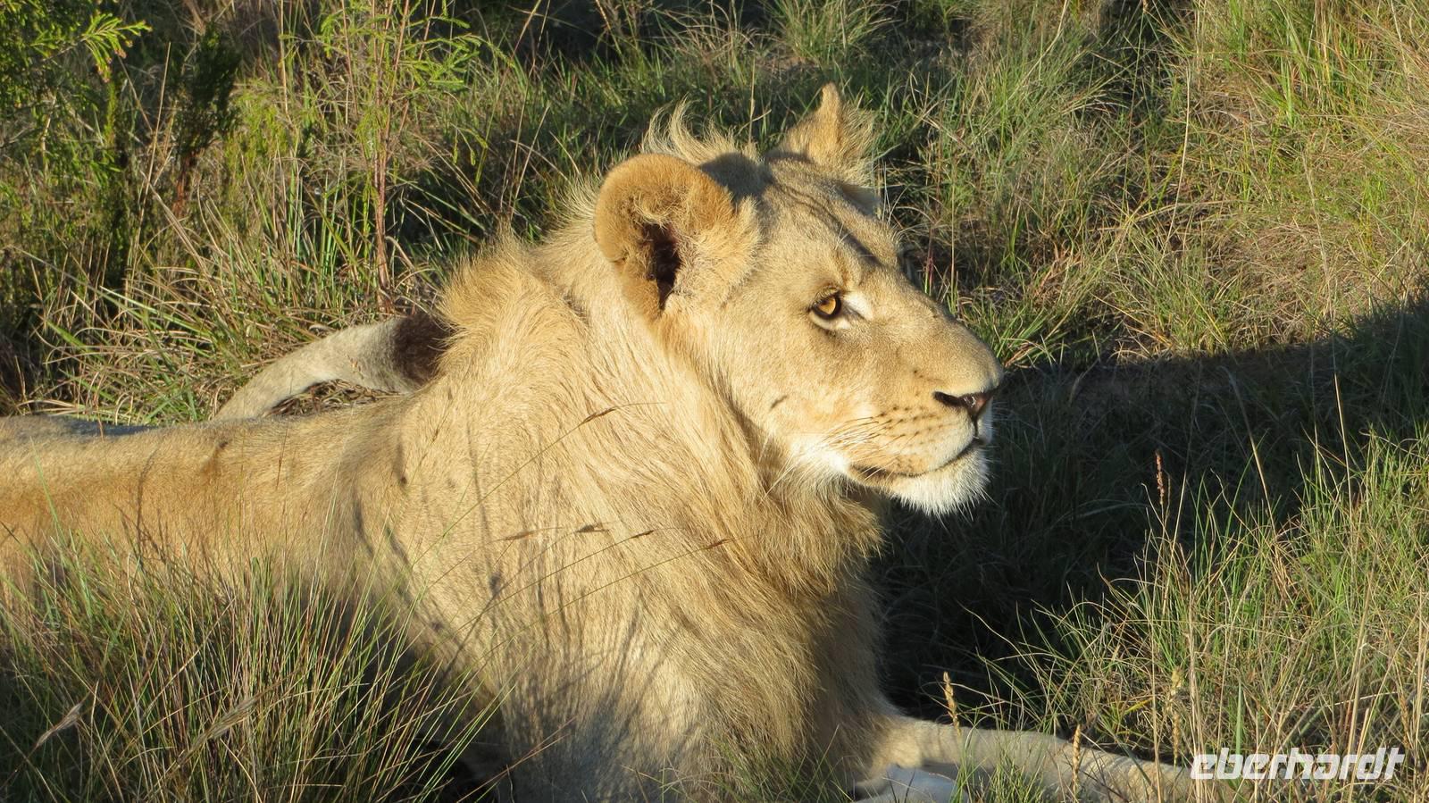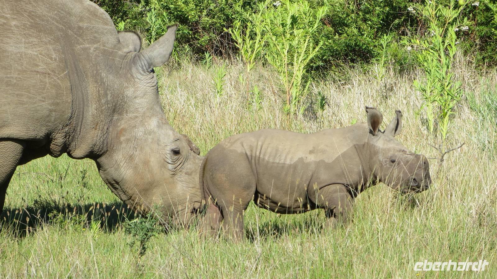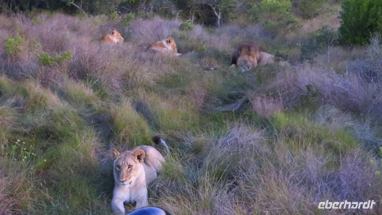 Schon früh am Morgen beginnen wir unsere Safari - heute geht es in das zweite Areal des Parks, wo es auch Löwen gibt! Augen auf... und siehe da, in der Ferne entdecken wir zwei Löwen! Wir fahren näher heran und können die beiden Geschwister beim Rumtollen beobachten. Die Großkatzen kommen ganz nah an den Jeep heran, so dass mir fast ein bisschen mulmig zumute wird. Es ist ein großartiges Erlebnis und wir sind voller Freude! Danach legen wir erstmal eine Kaffeepause ein und stärken uns mit leckeren Muffins. Das Glück ist auf unserer Seite, denn bald darauf sehen wir ein Breitmaulnashorn mit seinem Jungen... ein echtes Riesenbaby. Um die Nashörner vor Wilderern zu schützen, werden ihnen hier kontrolliert die Hörner abgesägt. Was zunächst grausam klingt, ist letztendlich nur zu deren Schutz. Das nächste Highlight lässt nicht lange auf sich warten und wir sehen zwei Elefanten, die aber so schnell verschwunden sind, wie sie aufgetaucht sind. Dafür erfreuen wir uns an den hübschen Impalas, ein paar Zebras und einer Leopardenschildkröte. Zum Abschluss der Pirsch zeigt sich noch ein Hippo in einem kleinen Teich nahe der Rezeption, so kann man sagen, dass wir eine ausgesprochen erfolgreiche Safari hatten! Vier der Big Five sind damit schon „im Kasten"! Nach dem Frühstück können wir die Annehmlichkeiten der wunderschönen Lodge genießen und einfach mal entspannen, bis es nach dem Mittagessen noch einmal auf die Pirsch geht.