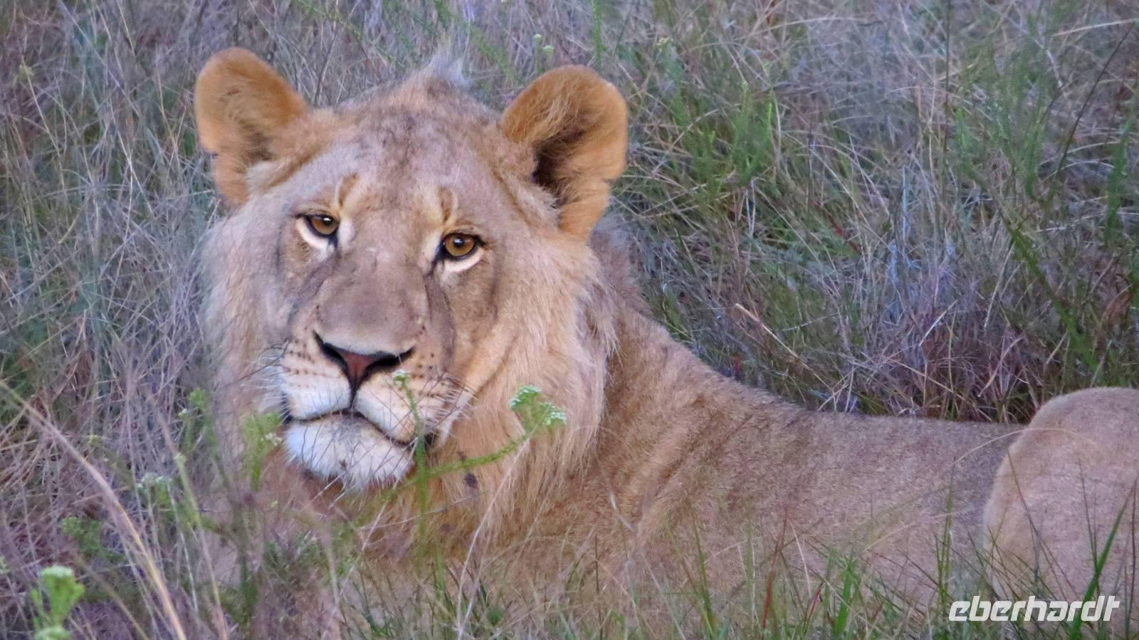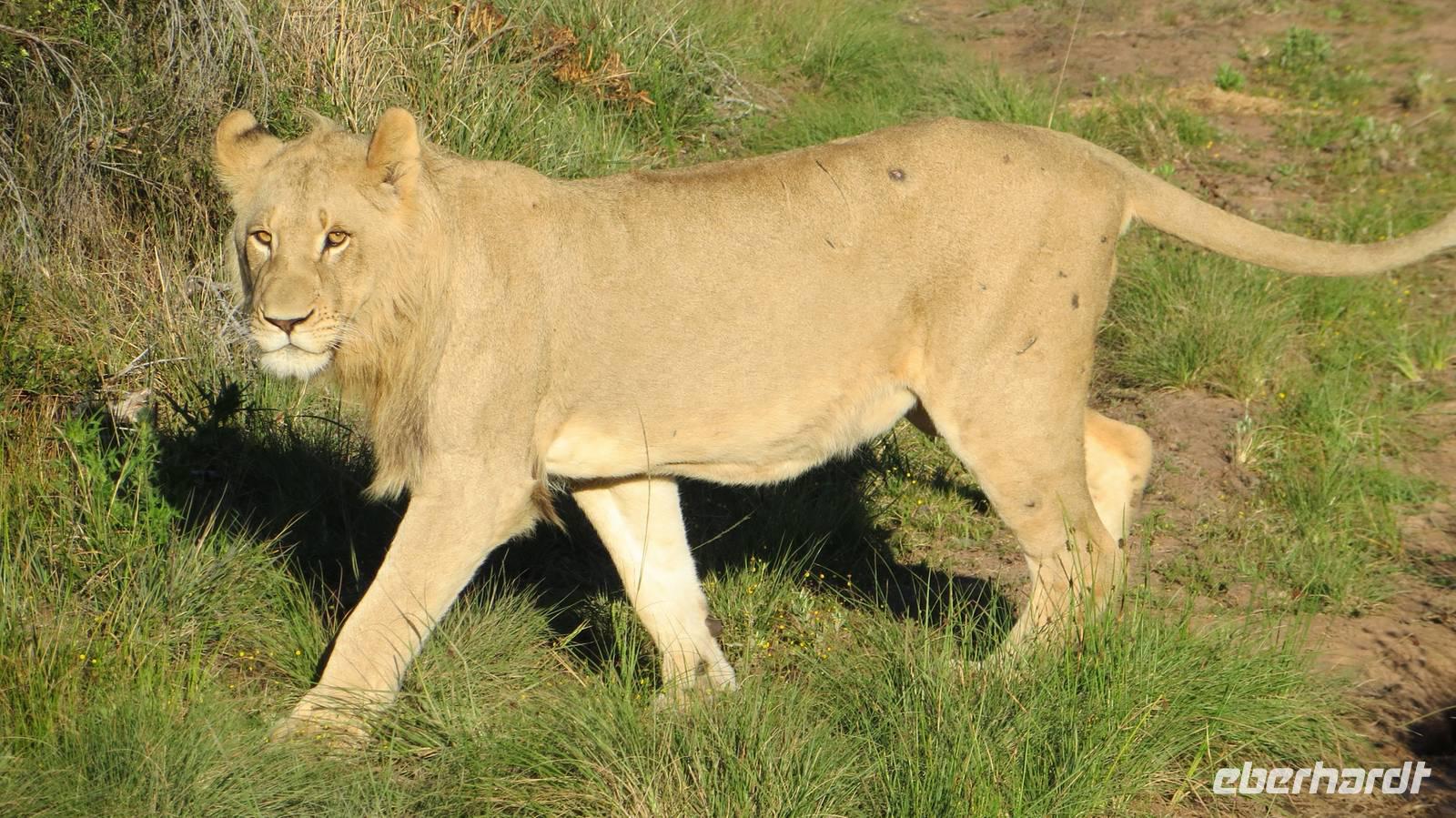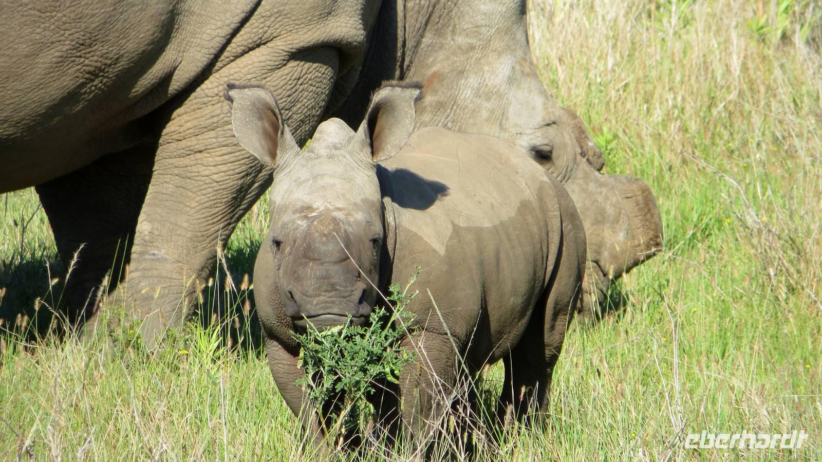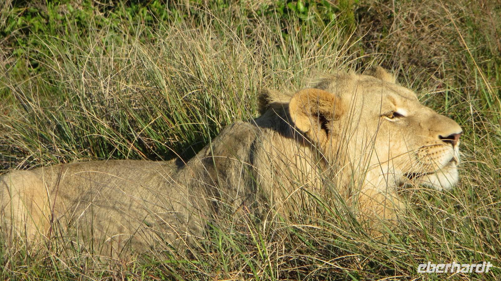 Schon früh am Morgen beginnen wir unsere Safari - heute geht es in das zweite Areal des Parks, wo es auch Löwen gibt! Augen auf... und siehe da, in der Ferne entdecken wir zwei Löwen! Wir fahren näher heran und können die beiden Geschwister beim Rumtollen beobachten. Die Großkatzen kommen ganz nah an den Jeep heran, so dass mir fast ein bisschen mulmig zumute wird. Es ist ein großartiges Erlebnis und wir sind voller Freude! Danach legen wir erstmal eine Kaffeepause ein und stärken uns mit leckeren Muffins. Das Glück ist auf unserer Seite, denn bald darauf sehen wir ein Breitmaulnashorn mit seinem Jungen... ein echtes Riesenbaby. Um die Nashörner vor Wilderern zu schützen, werden ihnen hier kontrolliert die Hörner abgesägt. Was zunächst grausam klingt, ist letztendlich nur zu deren Schutz. Das nächste Highlight lässt nicht lange auf sich warten und wir sehen zwei Elefanten, die aber so schnell verschwunden sind, wie sie aufgetaucht sind. Dafür erfreuen wir uns an den hübschen Impalas, ein paar Zebras und einer Leopardenschildkröte. Zum Abschluss der Pirsch zeigt sich noch ein Hippo in einem kleinen Teich nahe der Rezeption, so kann man sagen, dass wir eine ausgesprochen erfolgreiche Safari hatten! Vier der Big Five sind damit schon „im Kasten"! Nach dem Frühstück können wir die Annehmlichkeiten der wunderschönen Lodge genießen und einfach mal entspannen, bis es nach dem Mittagessen noch einmal auf die Pirsch geht.